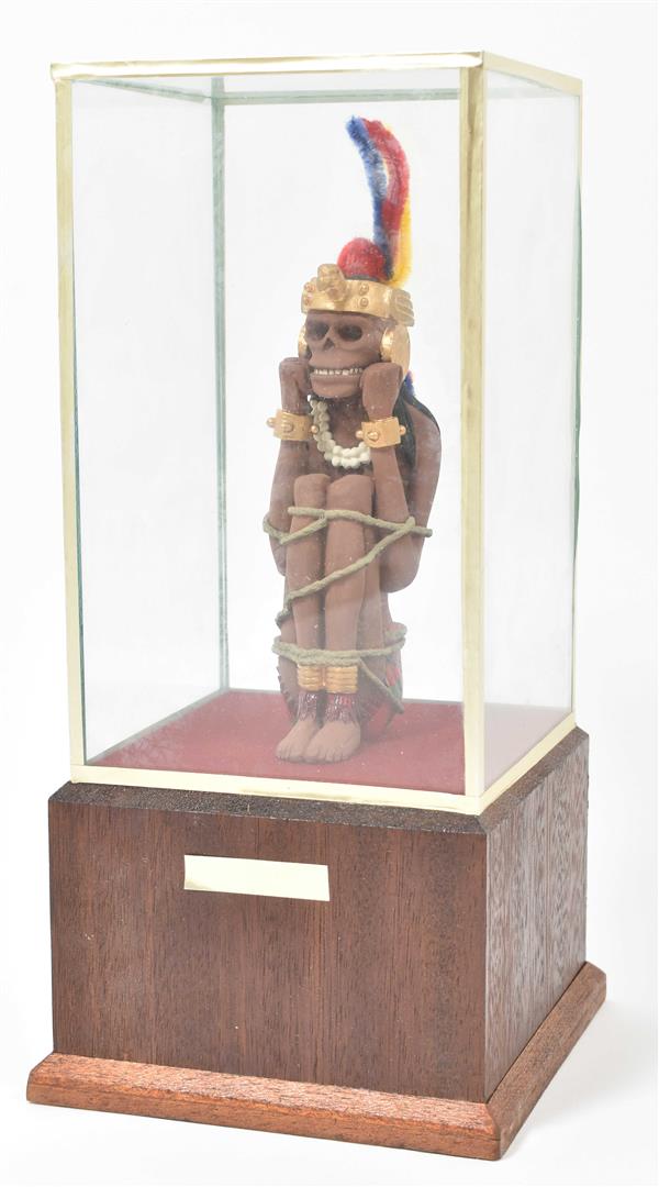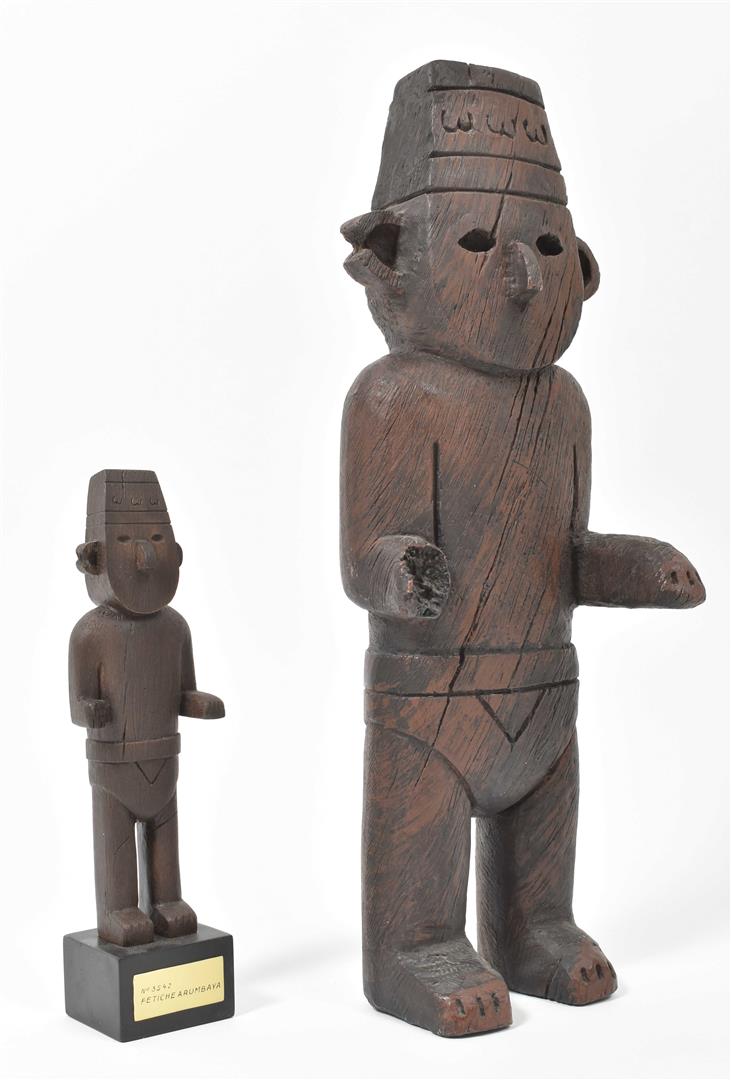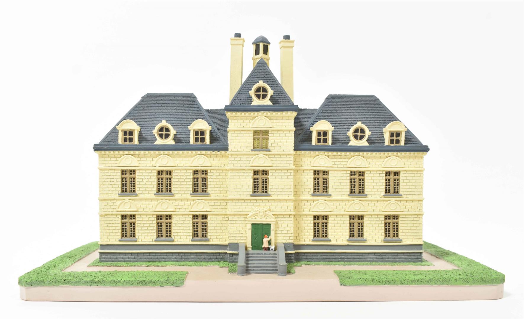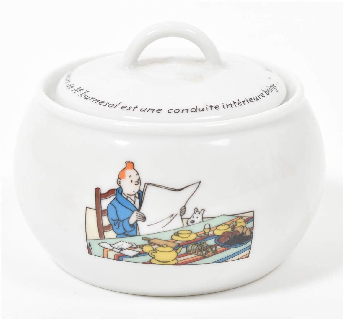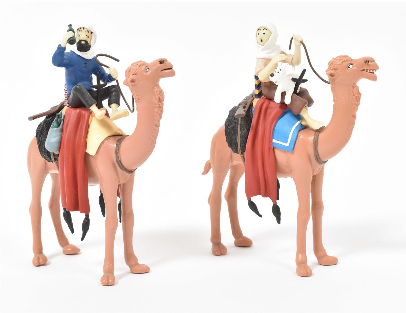 (1) Tintin, Milou, Haddock and Sutz on a raft from "Coke en stock". Hard plastic, 18 x 16 x 12 cm. (2) Scene from "Le Crabe aux pinces d'or" of Tintin coming through the porthole of Haddock's room. In plastic box, 14 x 14 x 14 cm. (3) Two Arumbaya Fetish figurines from "Le Temple du soleil". One 39.5 cm tall, the other a Moulinsart statuette from the Images mythiques collection, 23.5 cm tall. (4) Seven sm. resin Moulinsart figurines, 4 w. certificates of authenticity. (5) Statuette of Rascar Capac from "Les 7 boules de cristal". On a stand in a plastic box, 13 x 13 x 32 cm. -and 8 other Tintin figurines and curiosa, incl. a "Mille Sabords" eau de toilette, a "crabe extra, mis en boîte par Omar Ben Salaad" tin and a sm. "Loch Lomond" scotch whiskey bottle.
