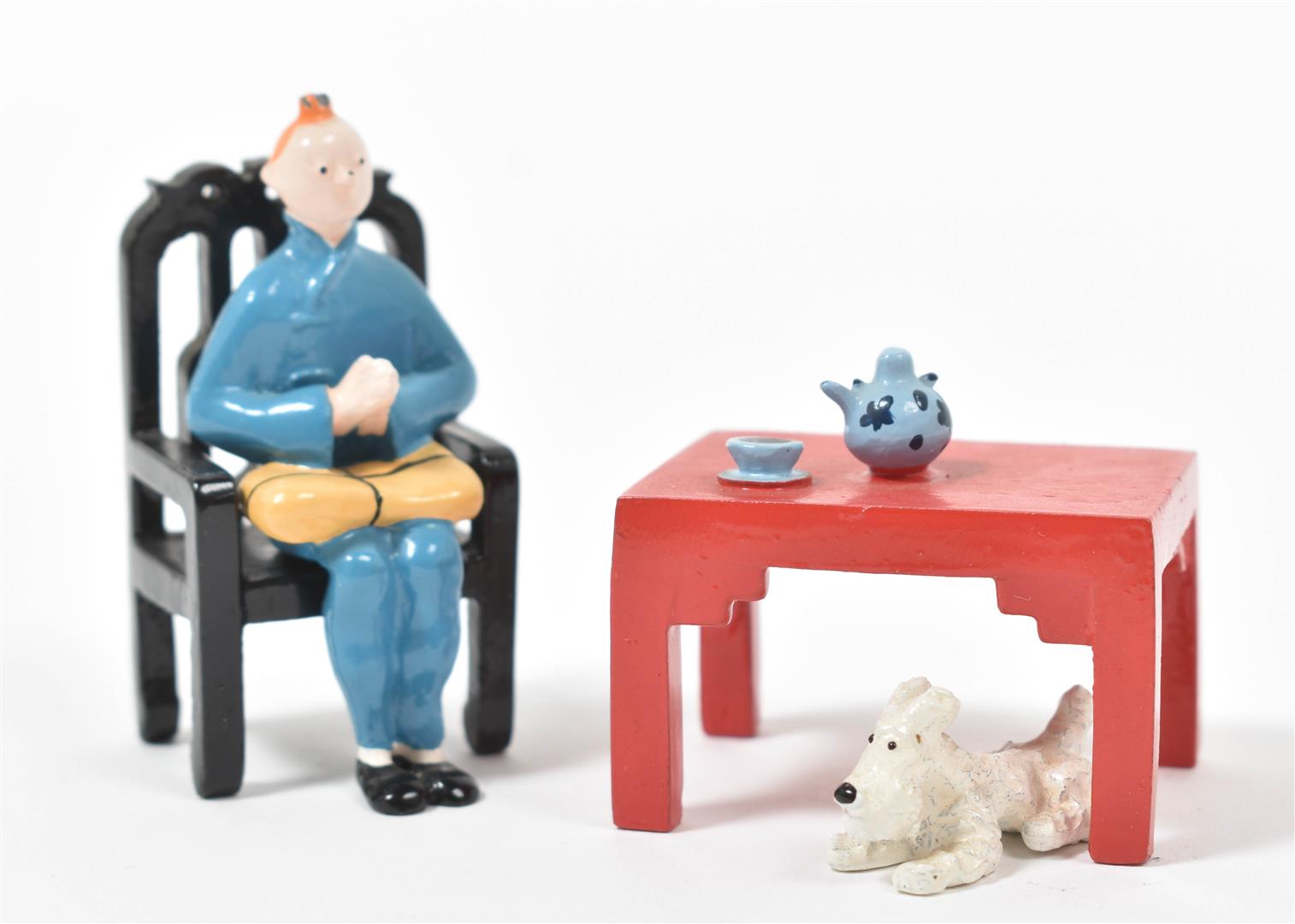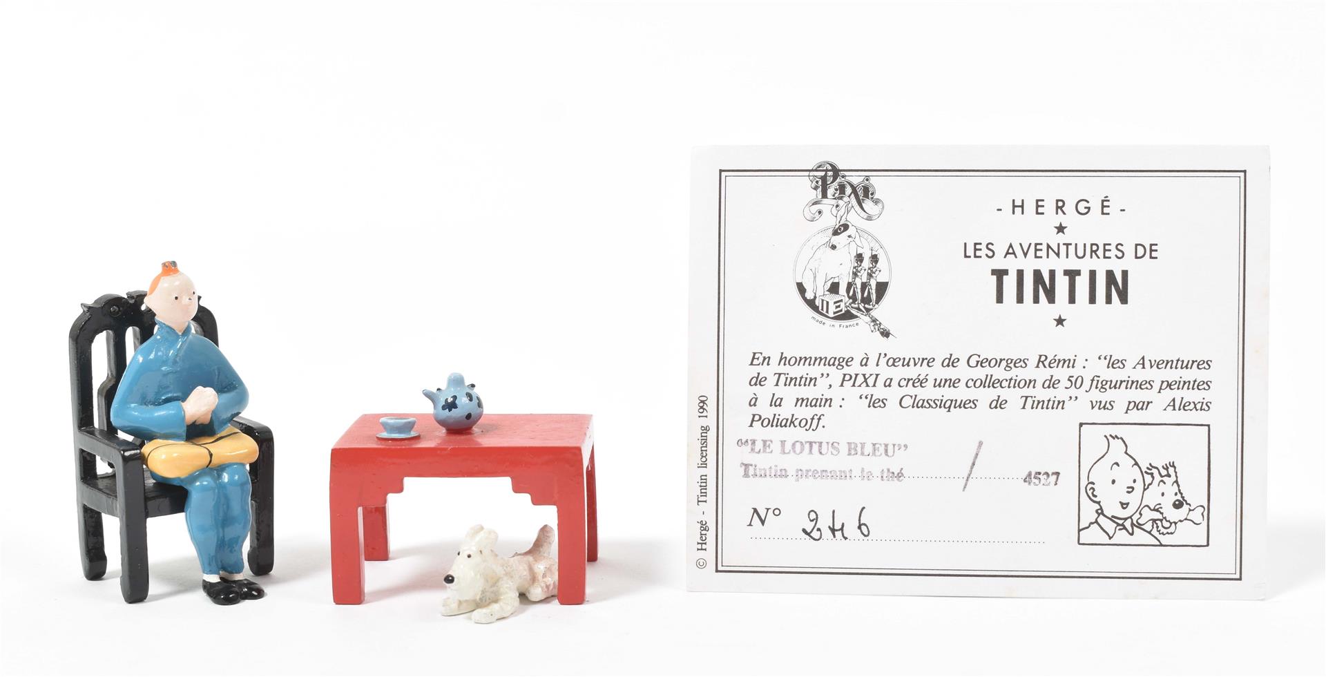 Tintin w. table and chair and Milou from "Le Lotus bleu". Pixi 4527, hand-painted lead, Tintin 6 cm tall, 1990. No. 246, w. certificate of authenticity.