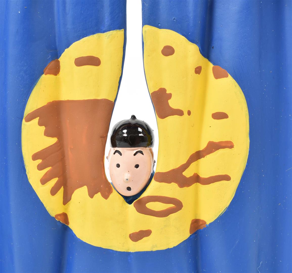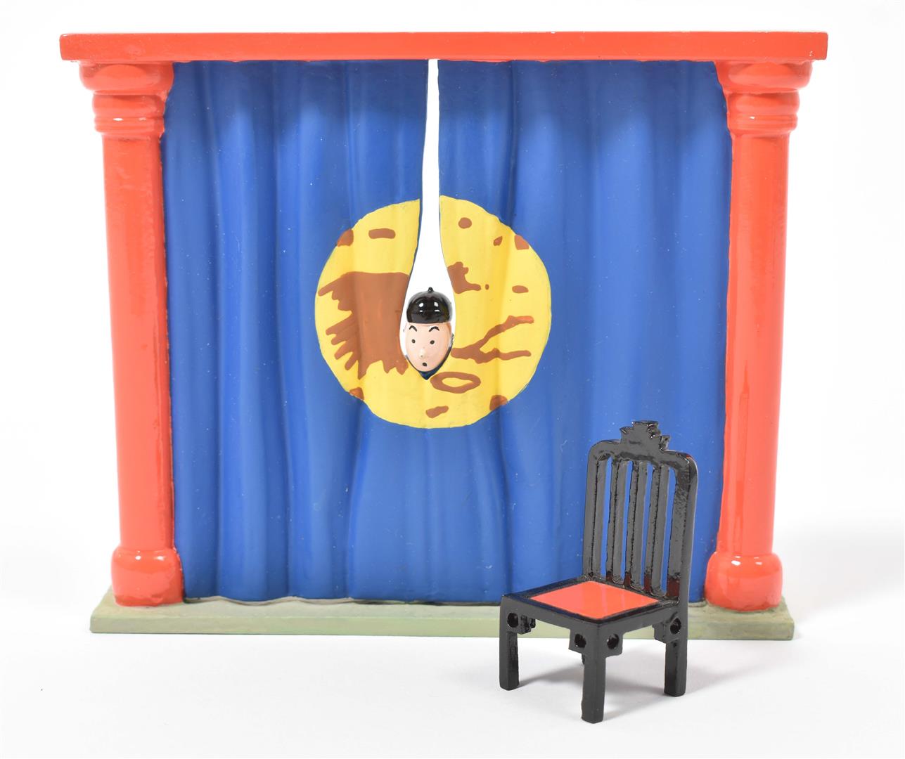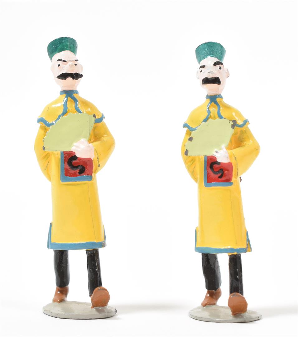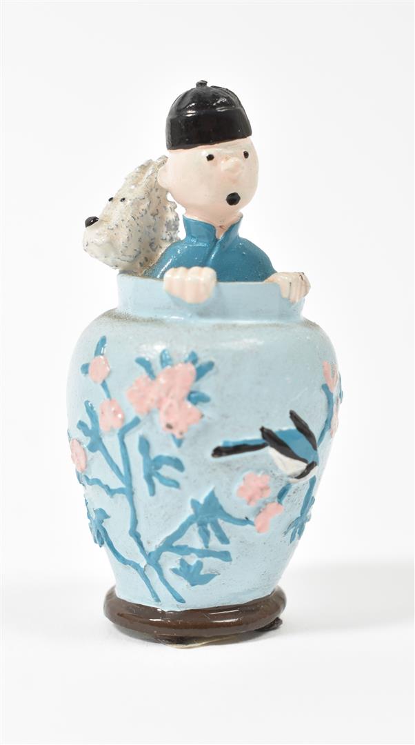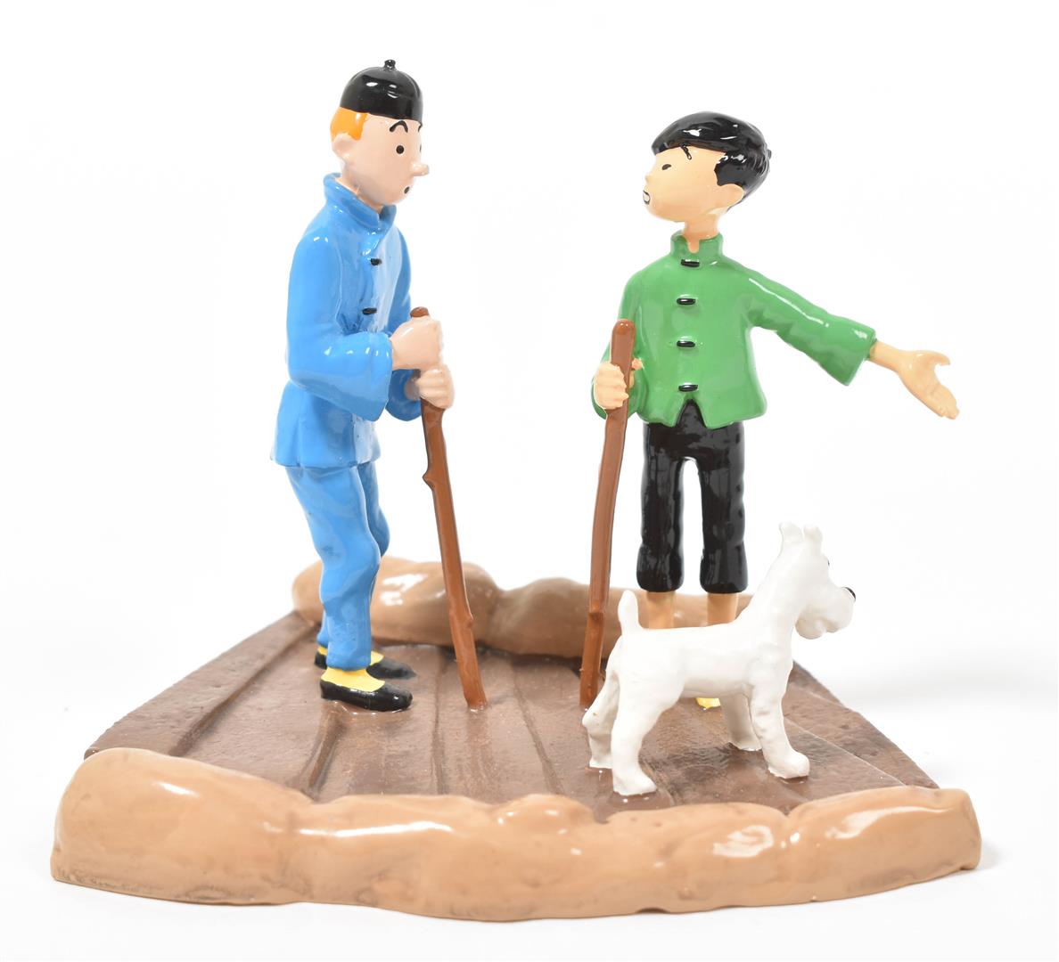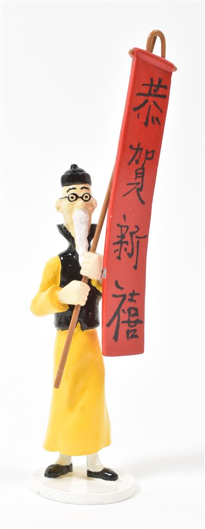 (1) Moulinsart figurine, "Scène la salle d'opium". Scene w. chair, hand-painted lead, 2008. No. 287/1000, w. (sl. dam.) certificate of authenticity. (2) Moulinsart figurine, "Monsieur Wang et la banderole". Hand-painted lead, 9 cm tall, 2013. No. 0979/1000, w. (sl. dam.) certificate of authenticity. (3) Moulinsart figurine, "Tchang petit guide". Hand-painted lead, 8 cm tall, 2005. Stamped "Hergé/ Moulinsart 2005" on bottom. -and 3 other figurines from the same story.