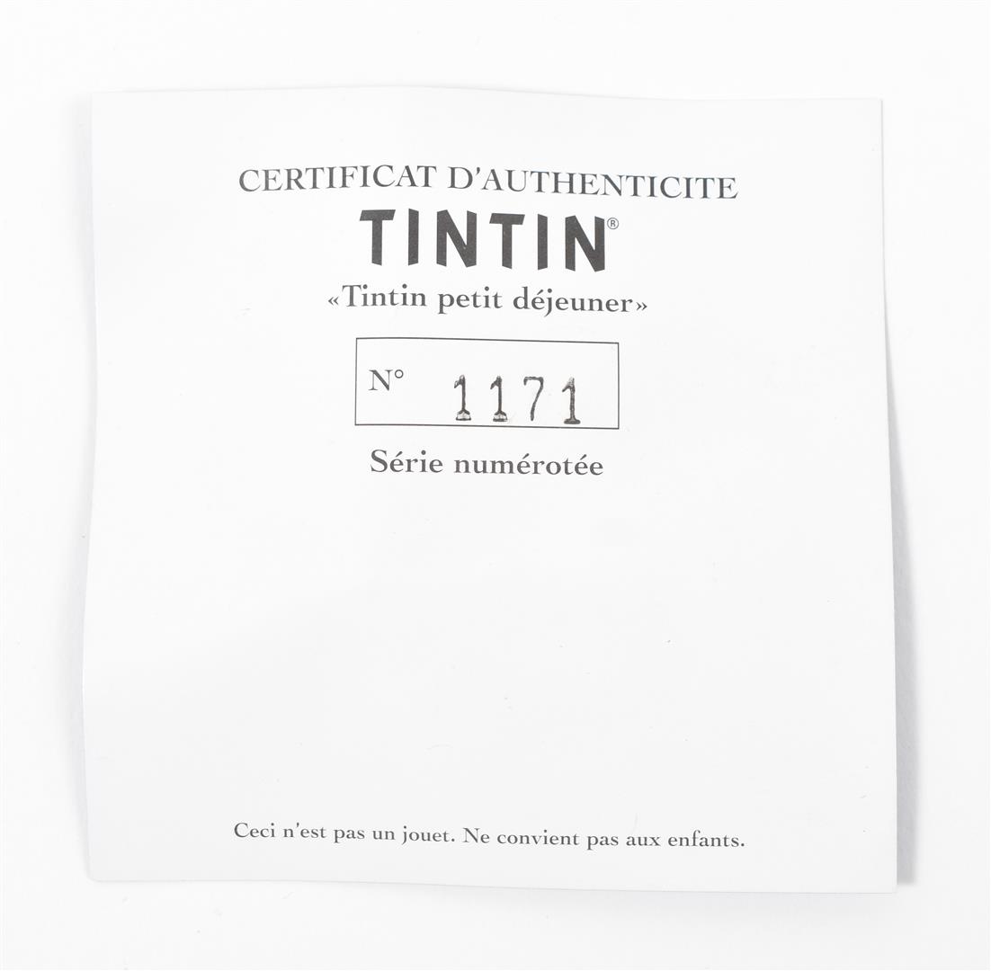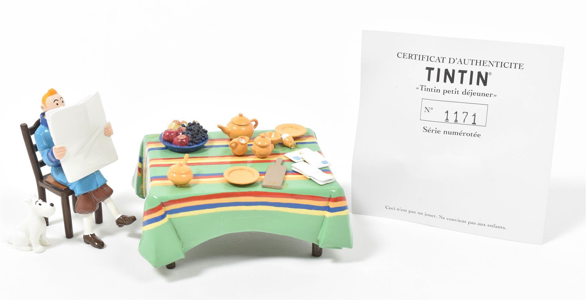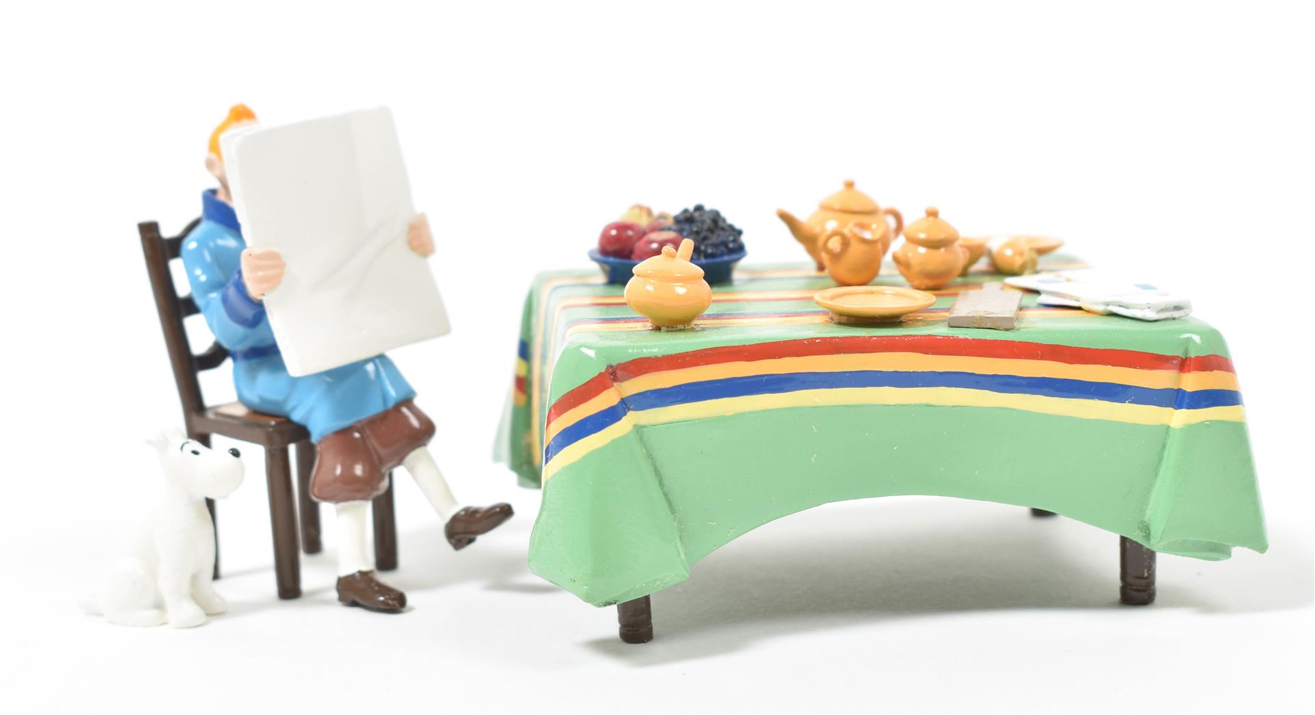 Tintin w. chair, breakfast table and Milou. Hand-painted lead, pieces var. sizes. No. 1171, w. certificate of authenticity.