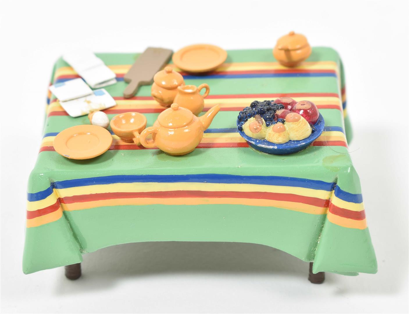 Some breakfast items glued to the table, others loose.