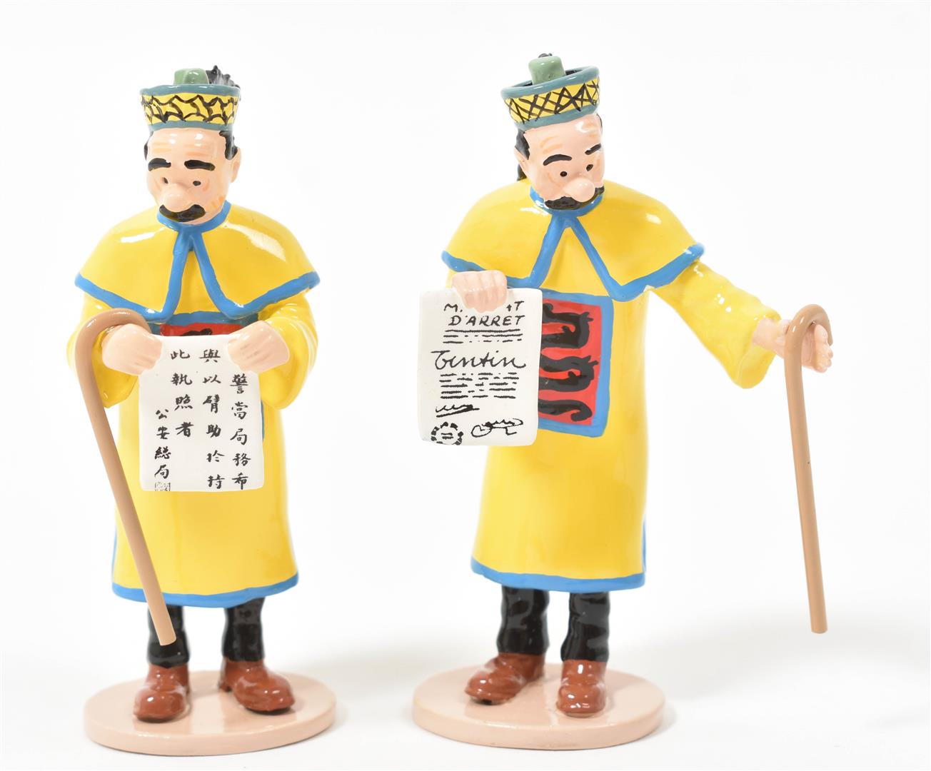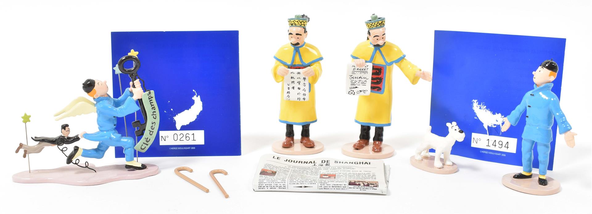 (1) Moulinsart figurines, "Mandat d'arrêt". Complete w. 3 figurines, Milou and 2 canes. Hand-painted lead, 2006. No. 1494/2500, w. (sl. dam.) certificate of authenticity. (2) Moulinsart figurine, "Tintin & la clé des champs". Hand-painted lead, 8 cm tall, 2009. No. 261/1000, w. (sl. dam.) certificate of authenticity. (3) Pixi figurine, "Le Journal de Shanghaï". Hand-painted lead, 7.5 x 5 cm. Stamped "Pixi Paris" and "Hergé/ Moulinsart" on bottom.