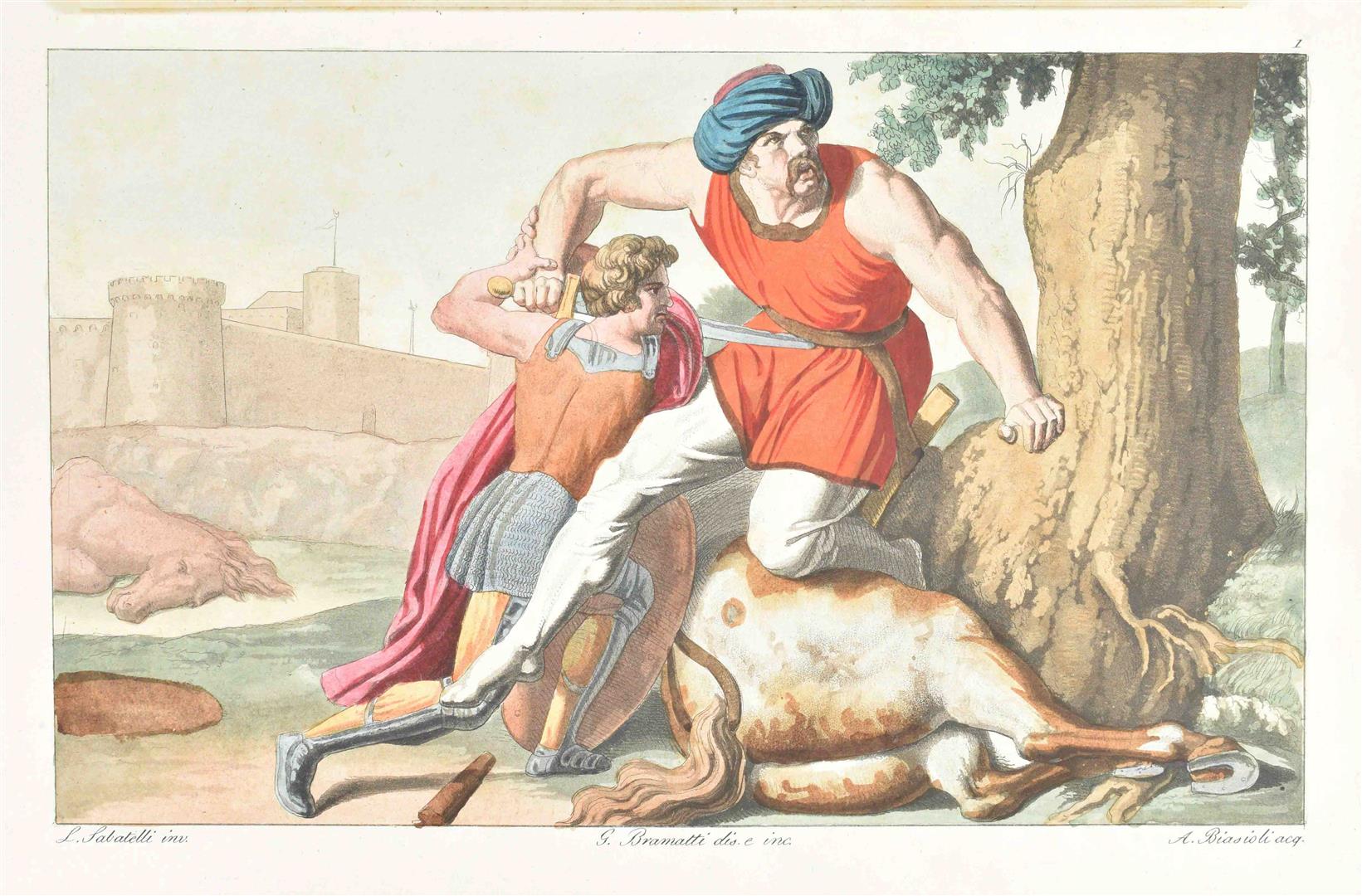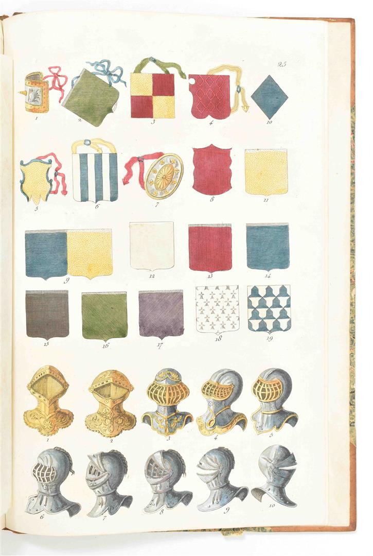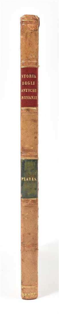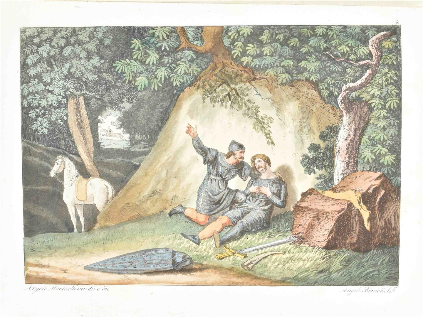 e dei poemi romanzeschi d’Italia (...). (Milan, privately publ., 1828). 35 handcol. (double-p.) plates of medieval scenes w. explanatory text on tissue guards. Hcalf w. marbled boards, mor. letterp. on ribbed spine. Large 8vo. The complete (and rare, esp. col.) atlas belonging to parts I (10 plates) and II (25 plates) of this important work on medieval history and culture.