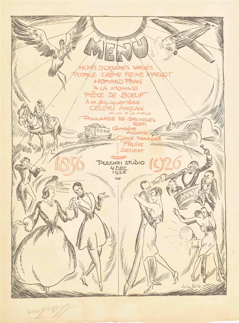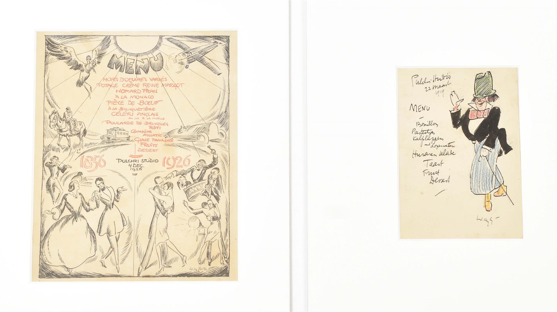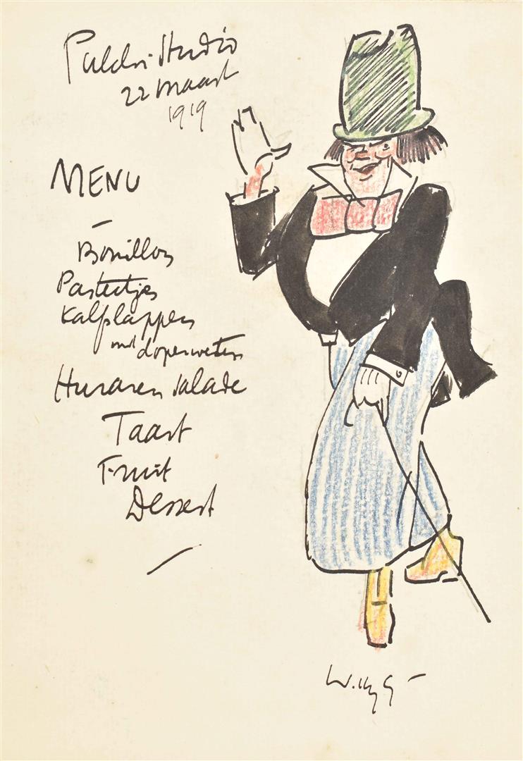 Ink, pencil and chalk on paper. Signed in ink bottom right. 17 x 12 cm. Added: Jubilee Dinner Pulchri 1856-1926. Printed menu des. by Sluiter.
