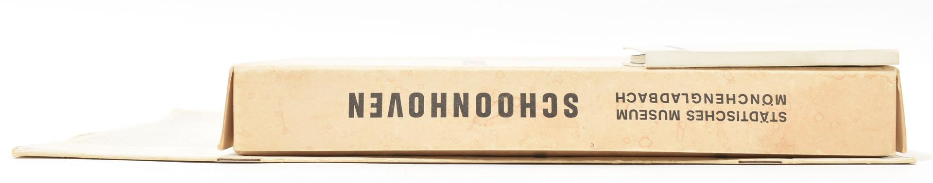 (1) Cassette catalog of the Städtisches Museum Mönchengladbach, 1972. No. 370/660. (Sl. worn) box, 20 x 16 cm. Lacking embossed print. (2) Jan Schoonhoven. Brummen, Vestzakbibliotheek, 1985. 8 x 5.5 cm. Sl. discol. back cover. (3) J.J. Schoonhoven. Tekeningen. Stedelijk Museum catalog, 1971. Des. by W. Crouwel. (Sl. browned) stapled pictorial wr.