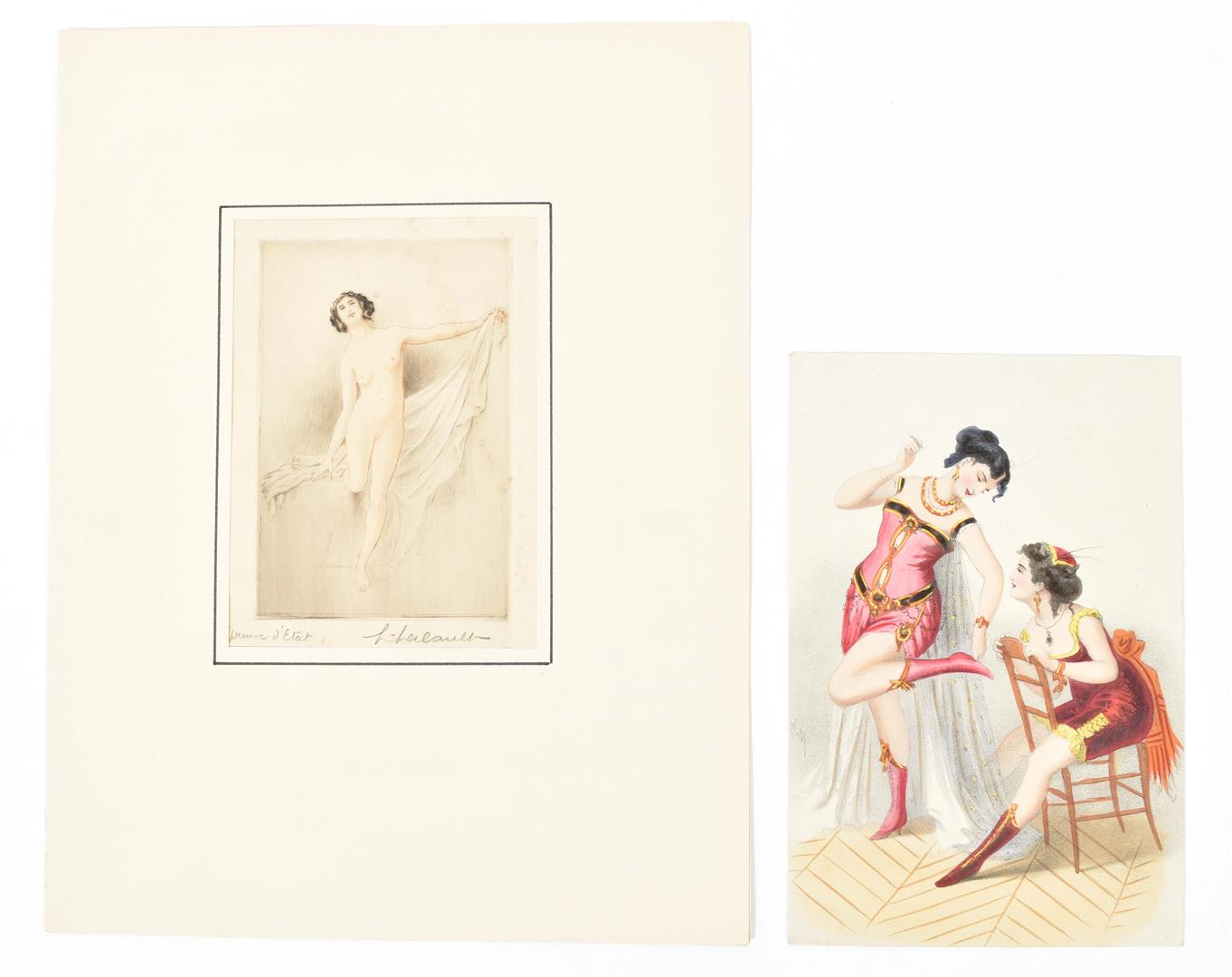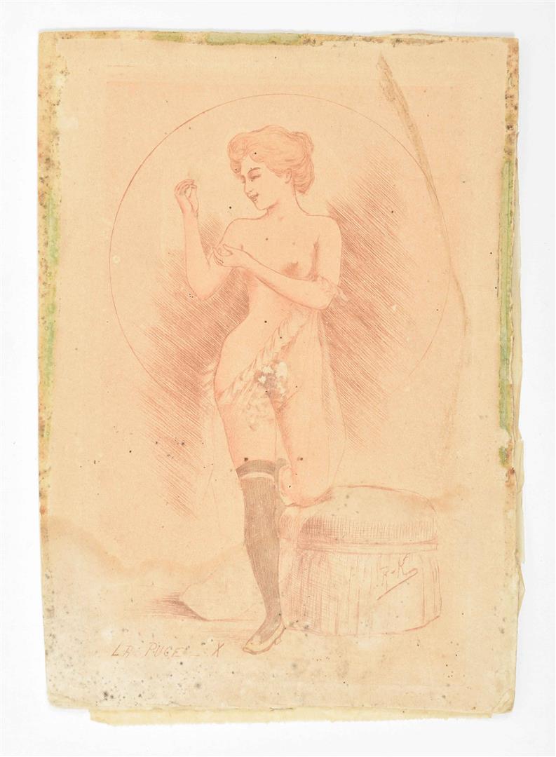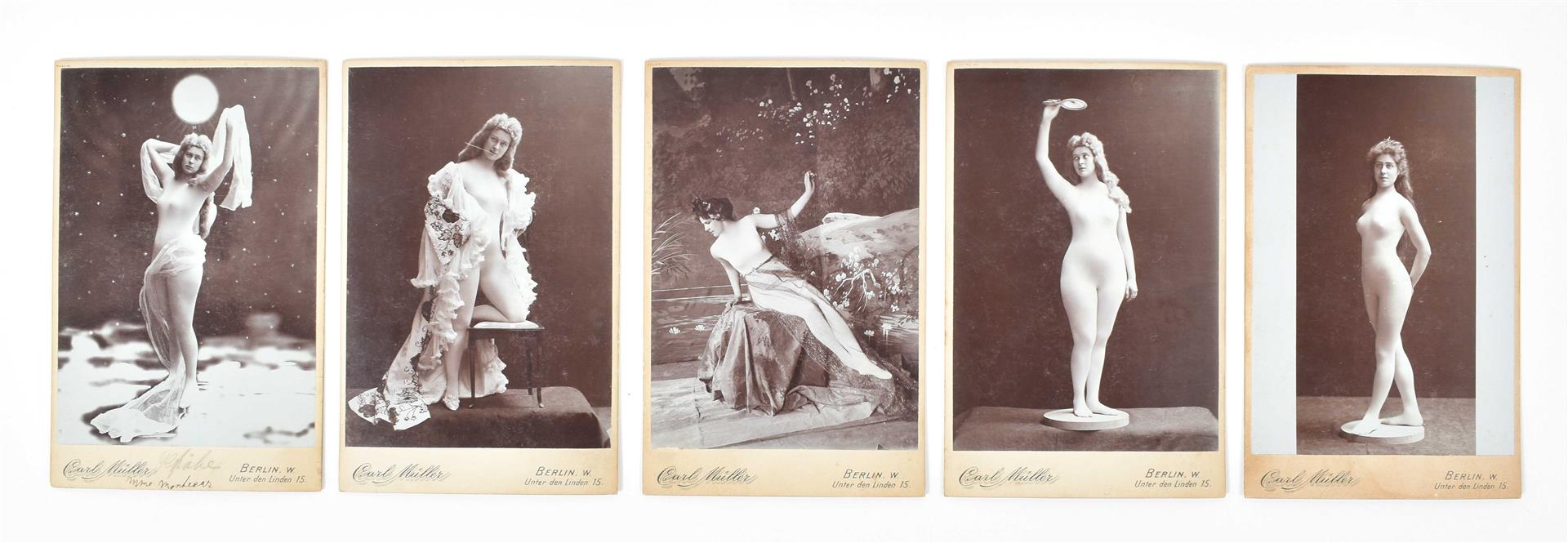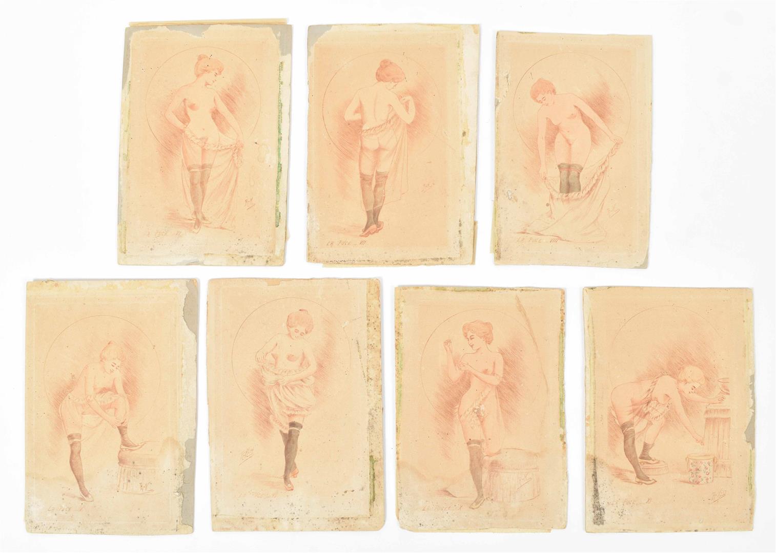 (1) Five cabinet cards of nude women by C. Müller, Berlin, 1903. All 17 x 11 cm. (2) A series of 7 erotic col. etchings finely portraying the (un)dressing of a woman, "La Puce" by "R-Kiss". Late 19th cent. (?) All 18 x 12.5 cm. Incomplete series, worn. (3) Paper underpants. -and 2 other erotic prints.