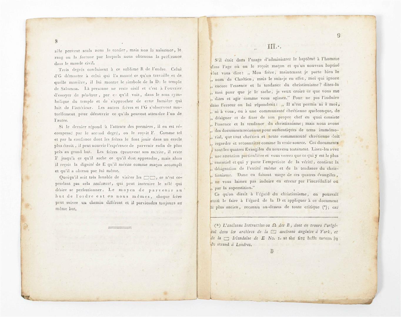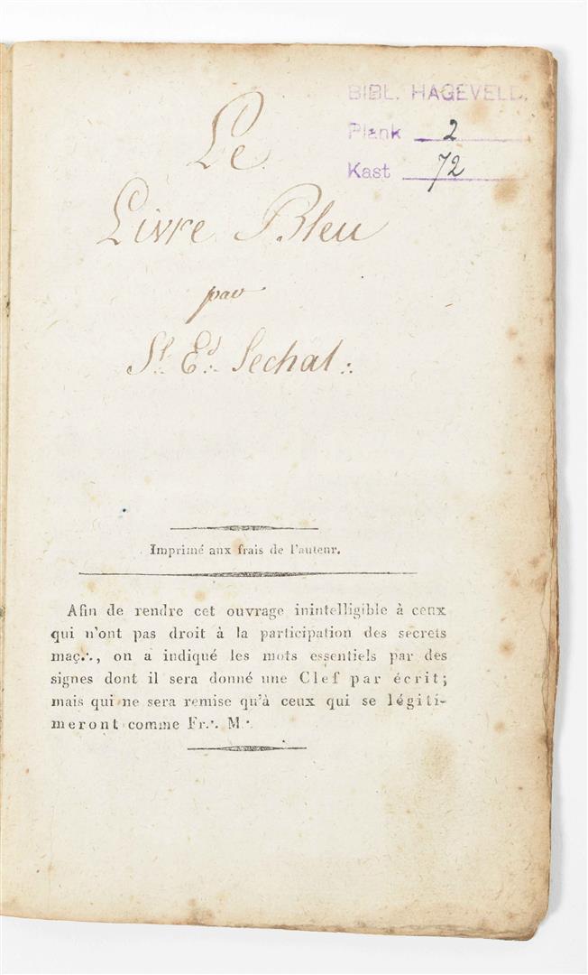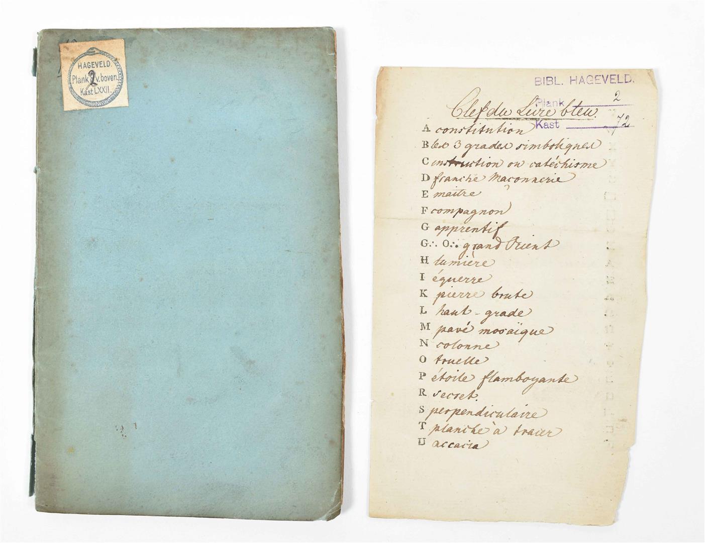 N.pl., "imprimé aux frais de l'auteur", n.d. (18th cent.?). 43 p. Booklet in French on the Freemasons, w. a handwritten key to 'render the book unintelligible to those who are not a part of the Freemasons'. Blue wr. Sm. 8vo.