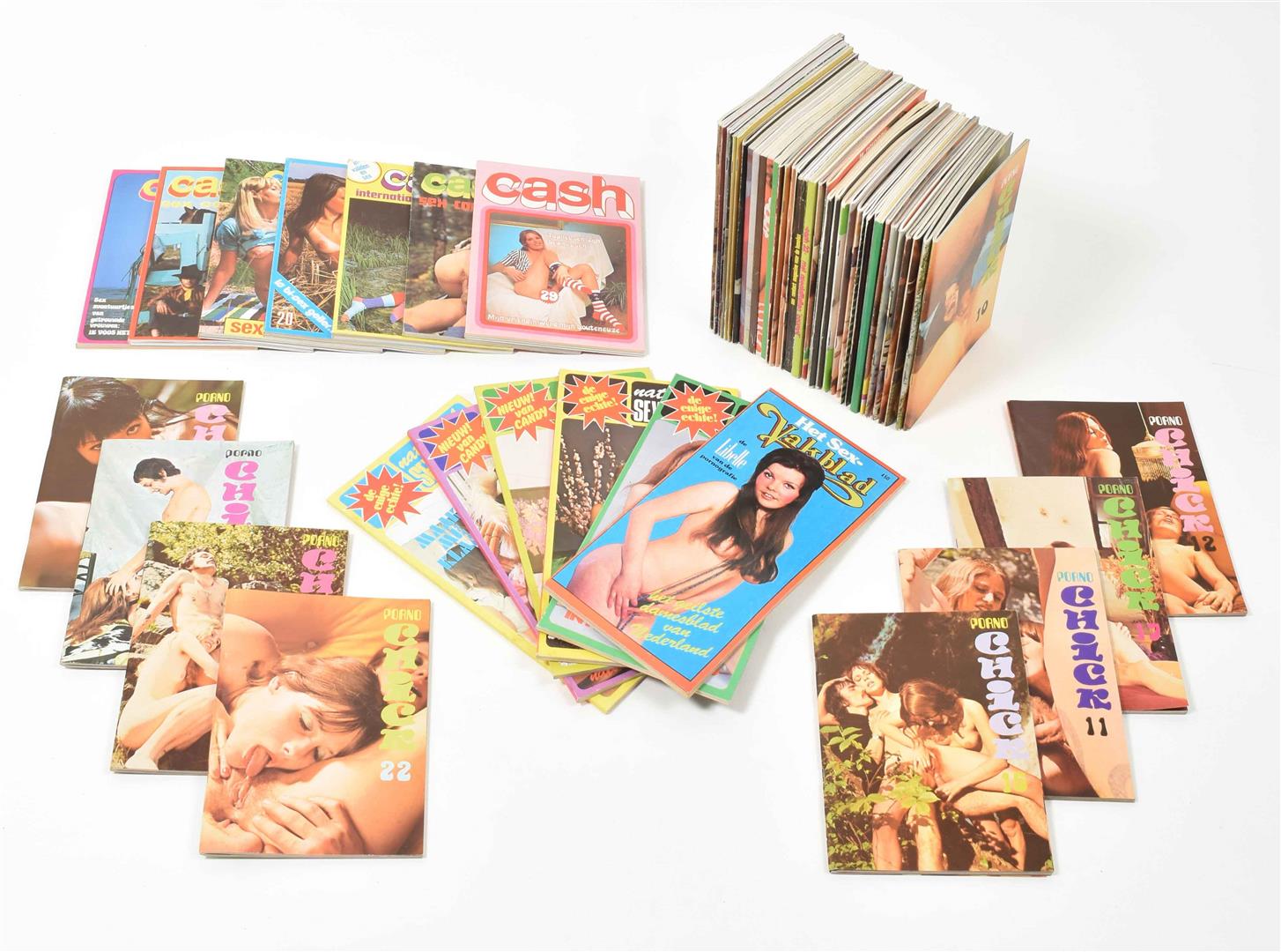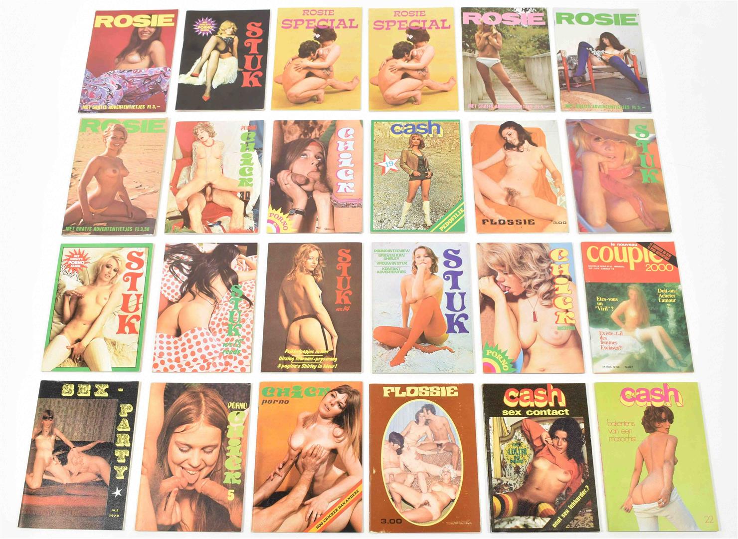 (1) Porno Chick. 21 var. issues, nos. 5 to 30. 1970s. (2) Nationaal sexvakblad. 6 issues. 1970s. -and 31 others, incl. Rosie, Stuk, Cash, Love, Flossie and Tum Tum. Most 1970s.