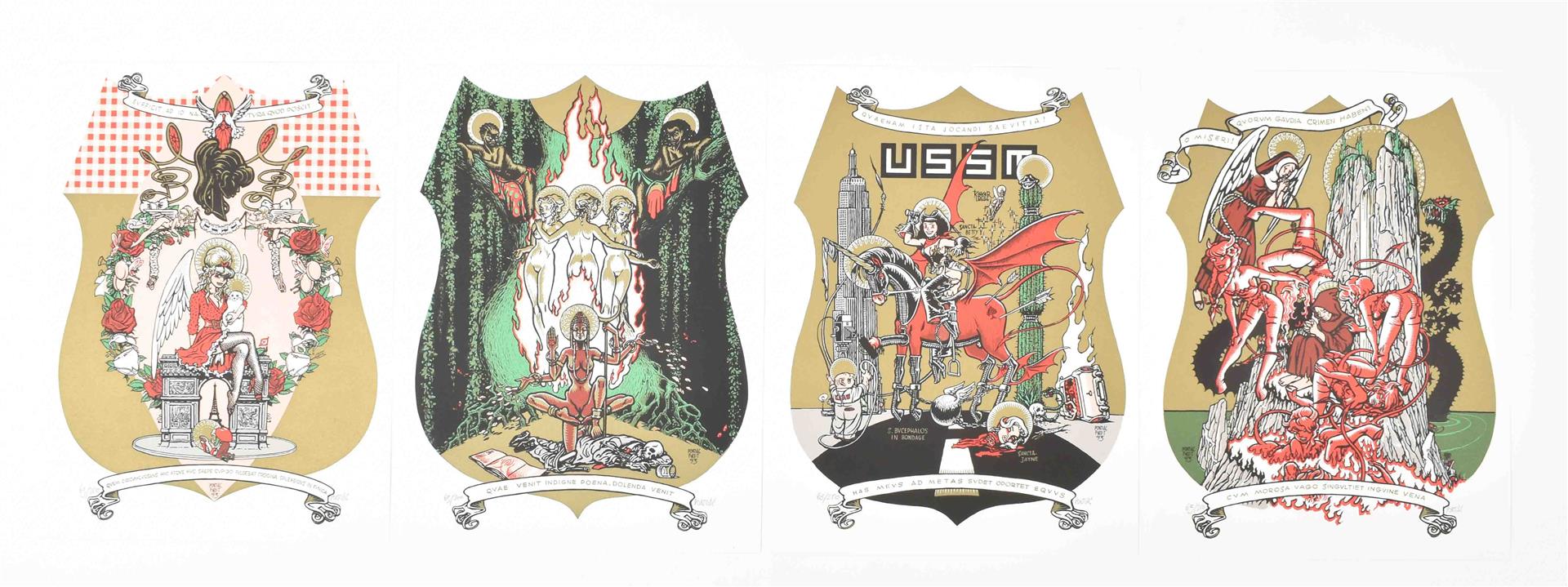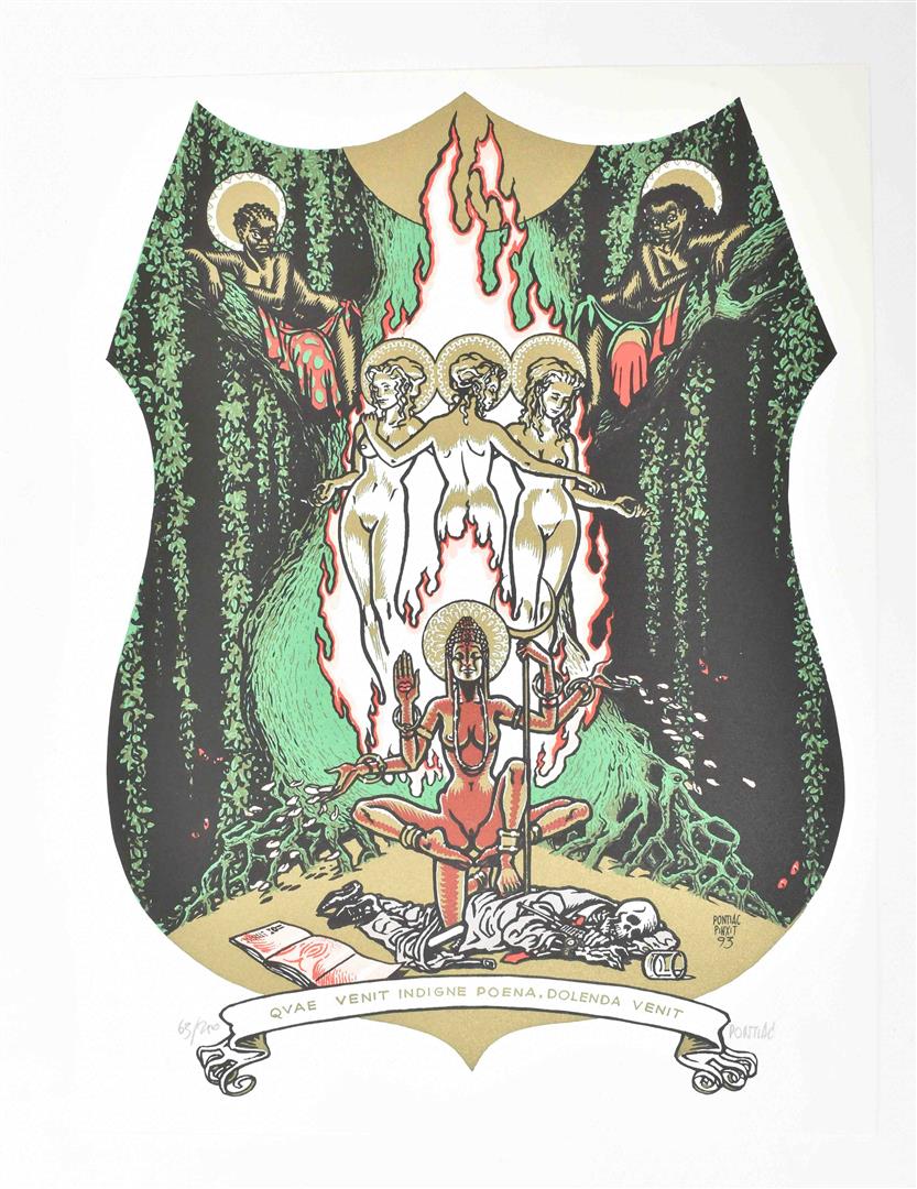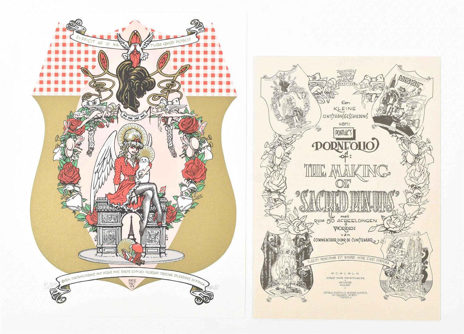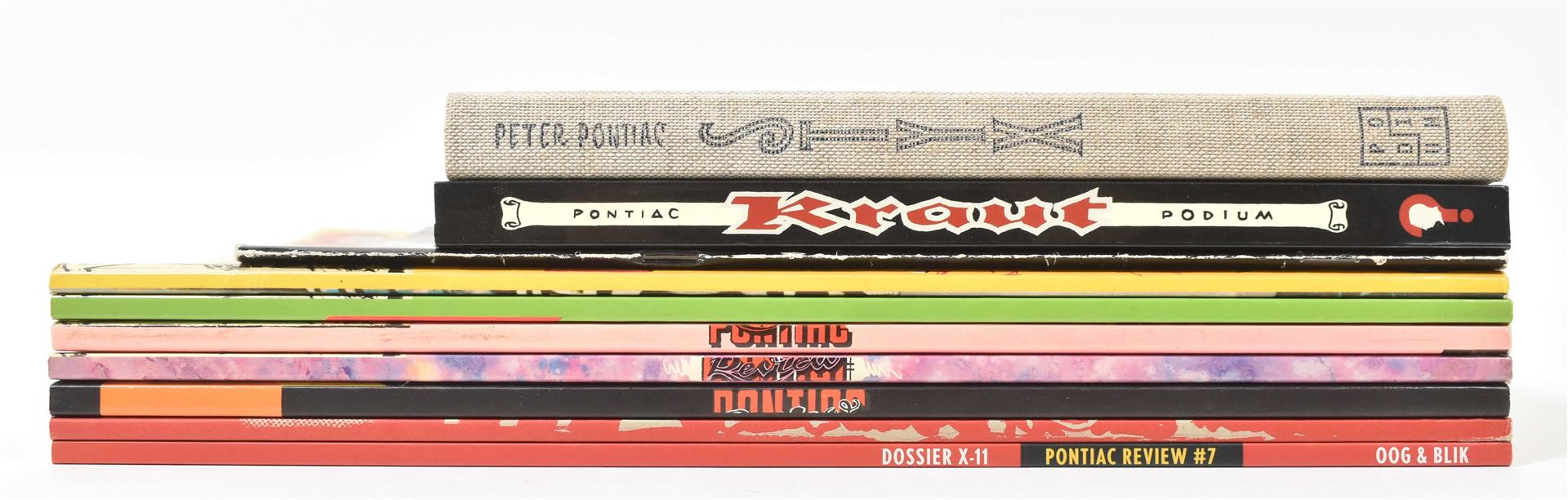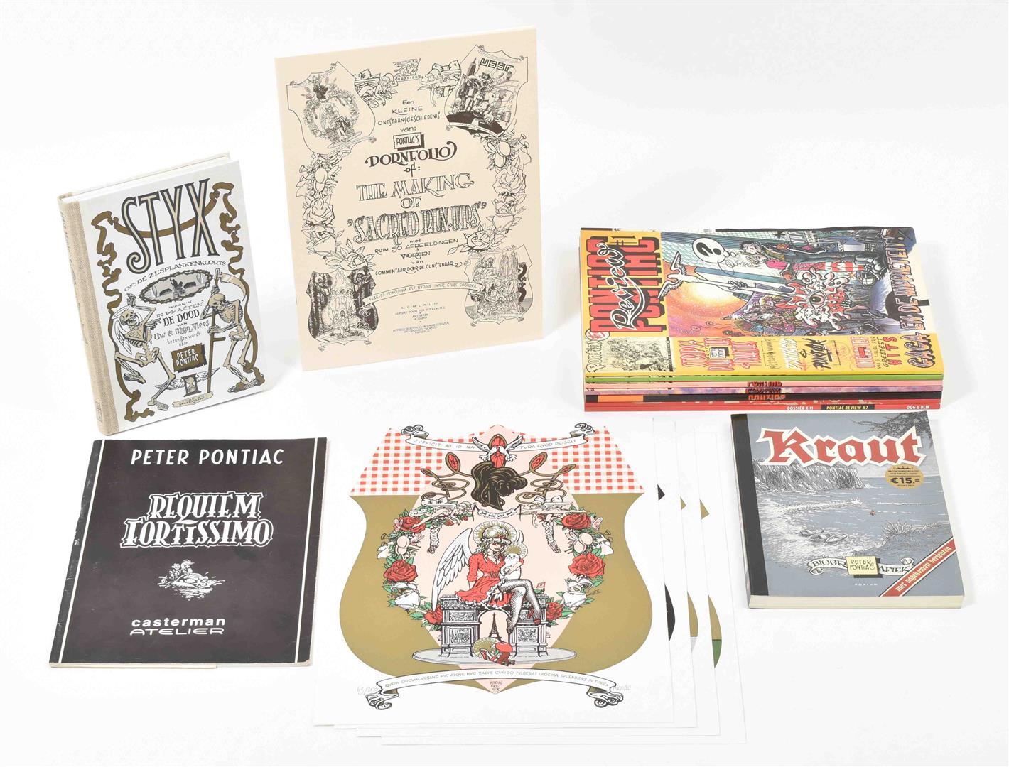 (1) Pontiac Review. Raadsel. Nos. 1-7. Sc. (2) Styx. Amst., Podium, 2015. Cloth-backed pictorial boards. (3) Een kleine ontstaansgeschiedenis van: Pontiac's Pornfolio of The Making of Sacred Pin-Ups (...). Amst., T. Mittelmeijer, 1993. Ill. sc. (4) Four prints, signed and numb. 63/250 by Pontiac in pencil. -and 2 other works by Pontiac.
