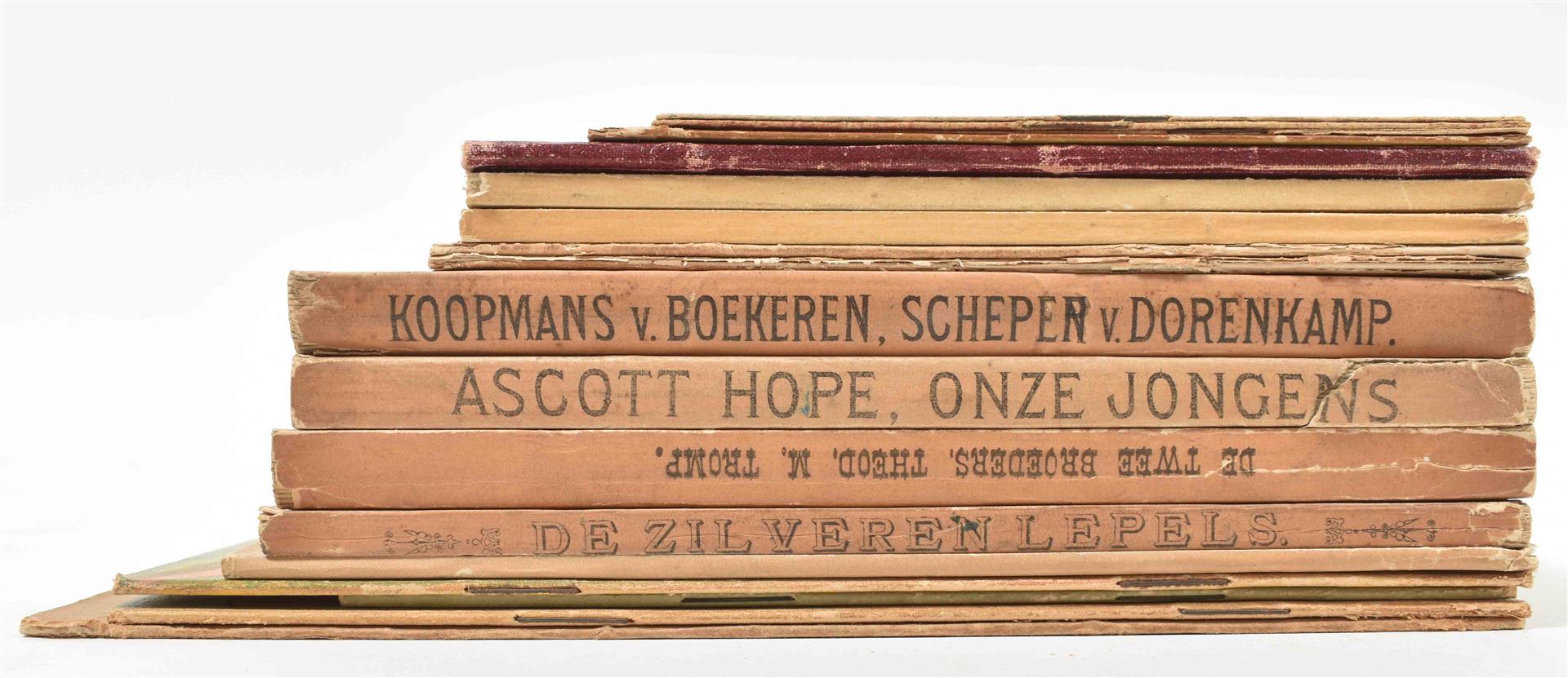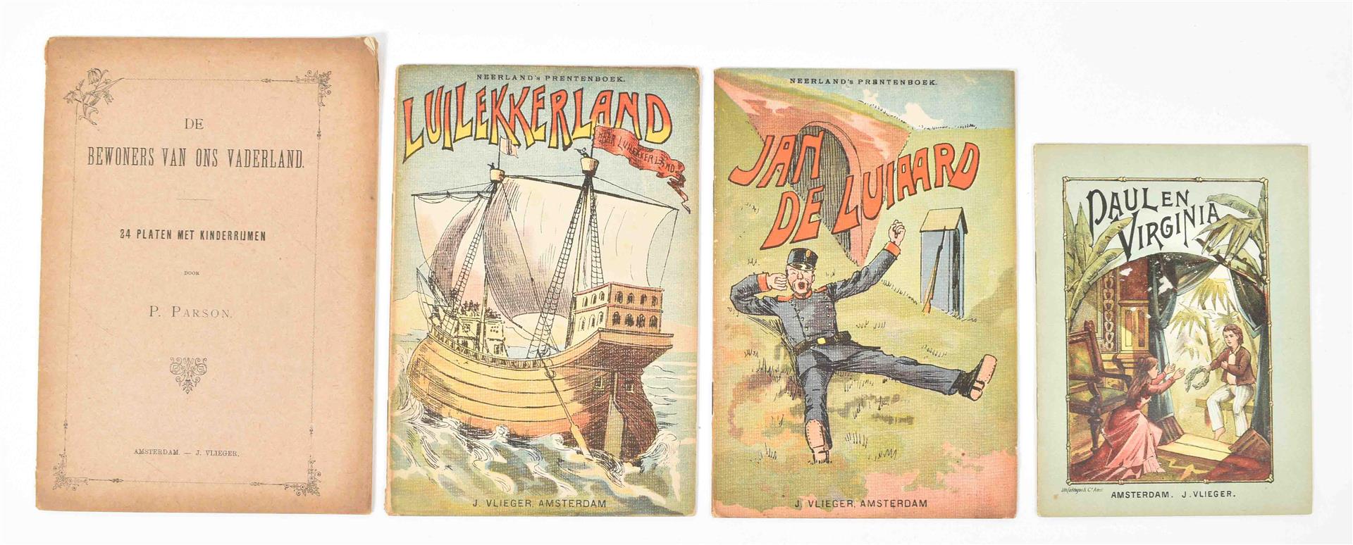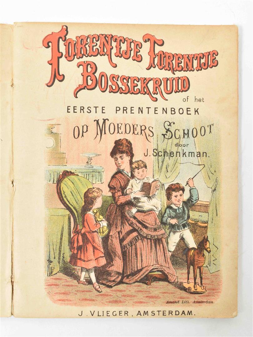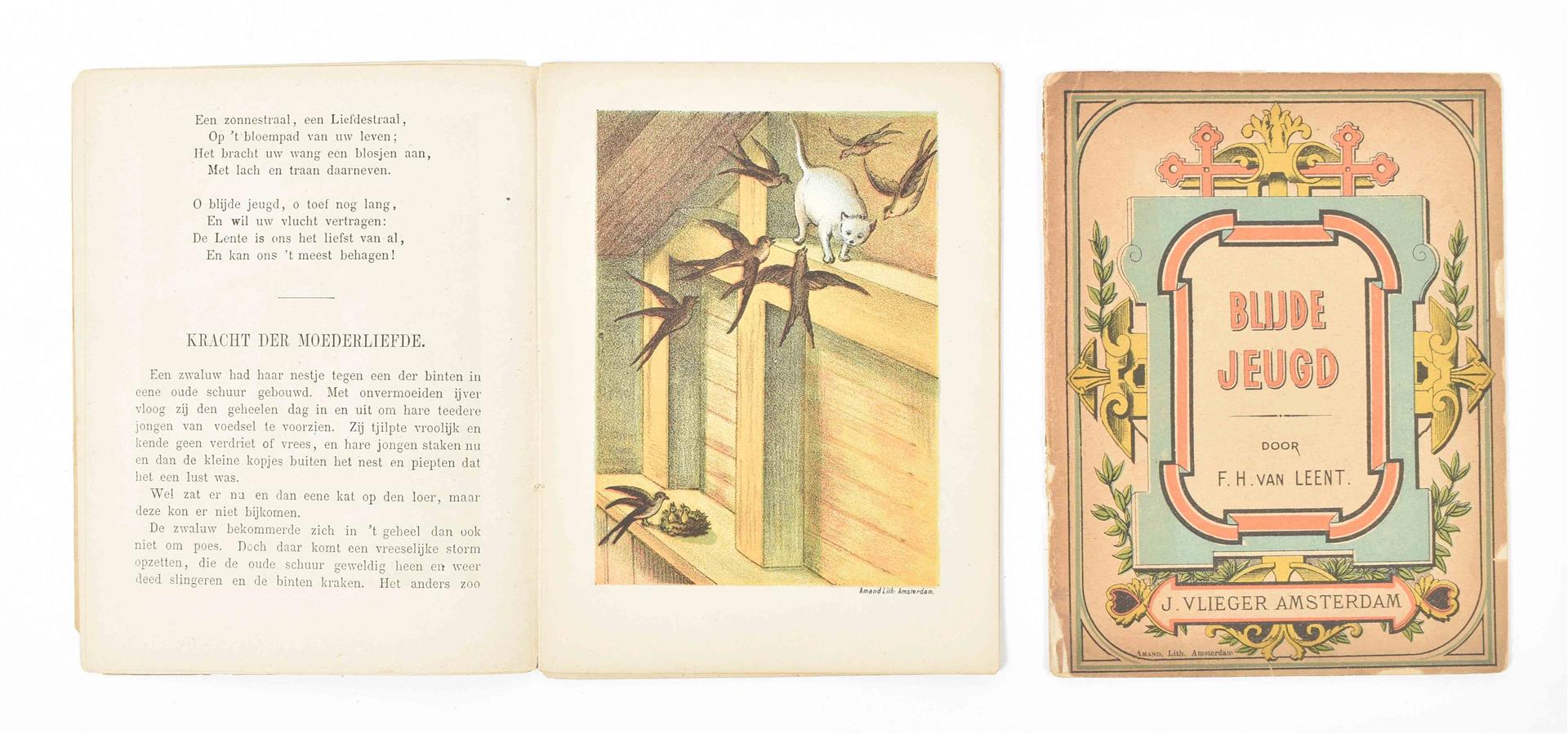 All publ. by Vlieger in Amst., late 19th/ early 20th cent. Incl. a.o.: (1) Five different vols. of Bibliotheek voor jongelieden. (2) Torentje, torentje. Bossekruid, of het eerste prentenboek op moeders schoot. (3) De Bewoners van ons vaderland. 24 platen met kinderrijmen. (4) Kleurboekje No. 7. (5) Olijke gasten. (6) Onze huisdieren. (7) Two Kinderbibliotheek books, Vergeet mijn nietjes and Lettergeschenk, both w. 8 col. plates. -and 6 others.