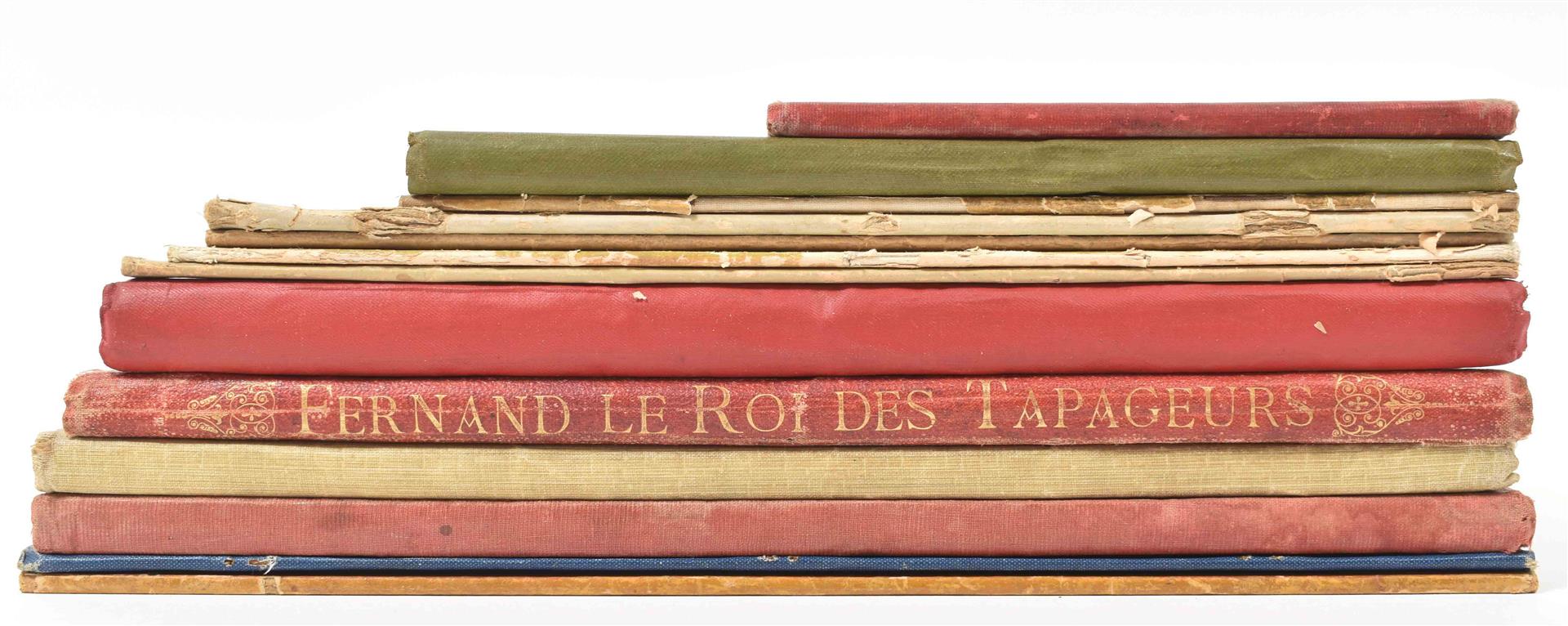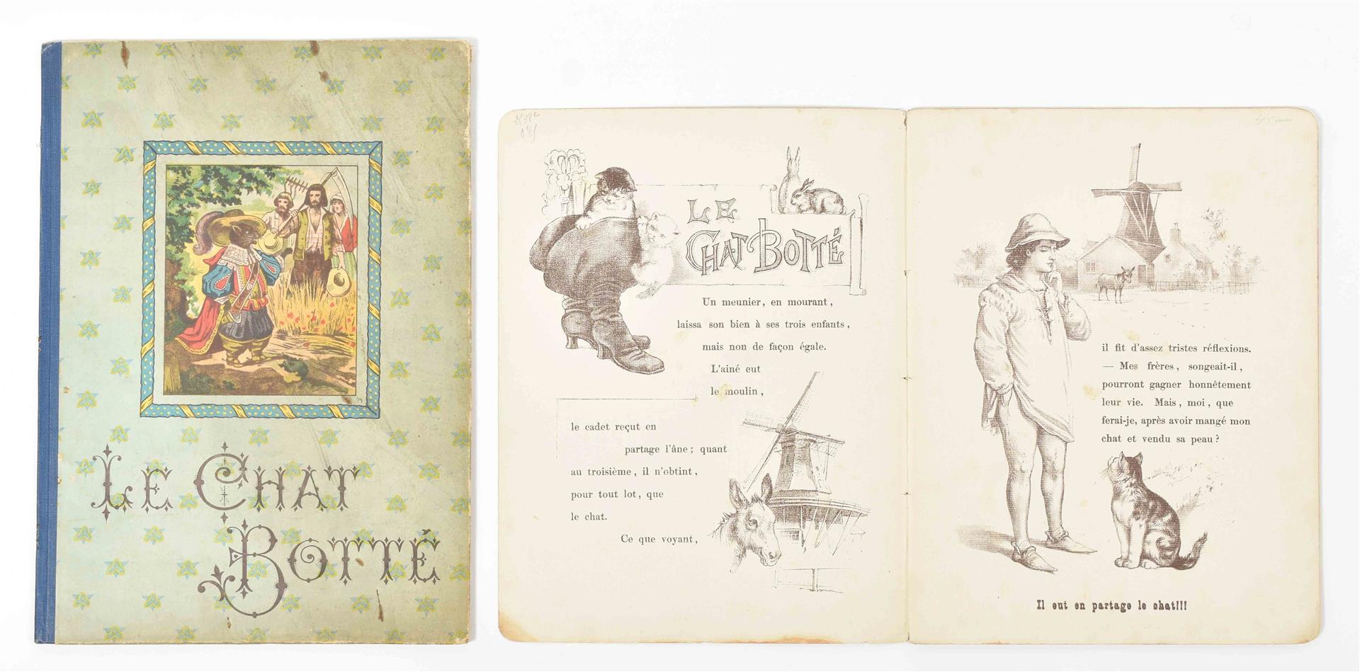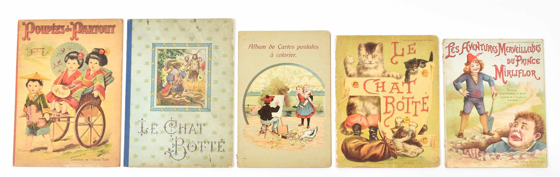 Late 19th/ early 20th cent. (1) Two different versions of Le chat botté. (2) Album de cartes postales à colorier. Book w. example postcards and b/w ones, to be coloured in; only some b/w postcards col. (3) Les Aventures merveilleuses du prince Mirliflor. Paris, Tuck, n.d. (4) Poupées de partout. Ibid., idem, n.d. -and 8 others.