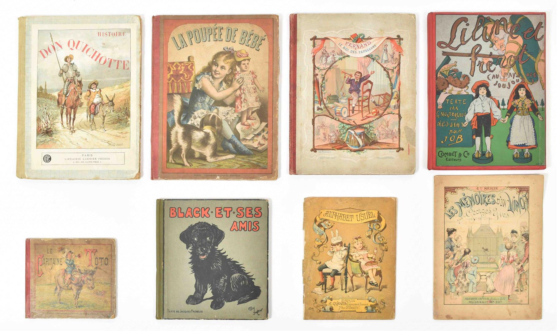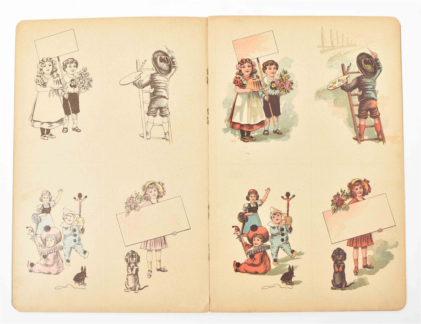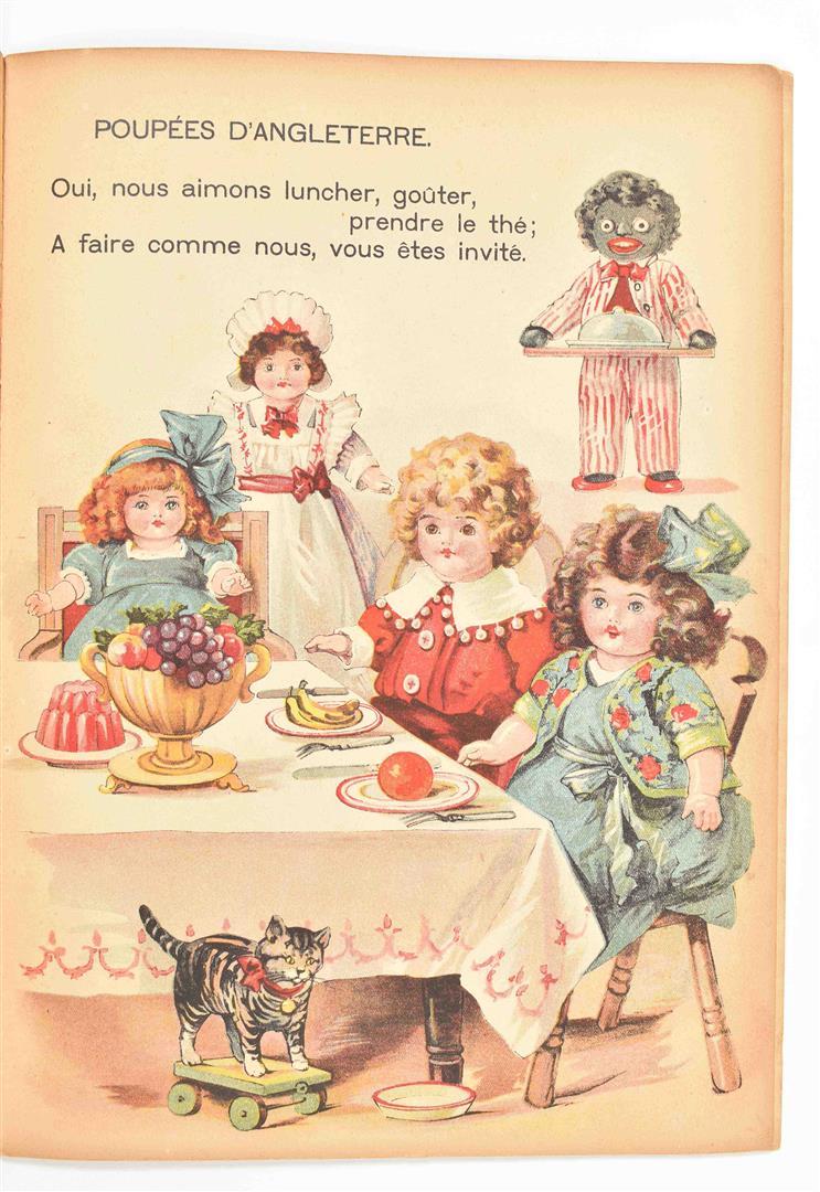 Late 19th/ early 20th cent. (1) Two different versions of Le chat botté. (2) Album de cartes postales à colorier. Book w. example postcards and b/w ones, to be coloured in; only some b/w postcards col. (3) Les Aventures merveilleuses du prince Mirliflor. Paris, Tuck, n.d. (4) Poupées de partout. Ibid., idem, n.d. -and 8 others.