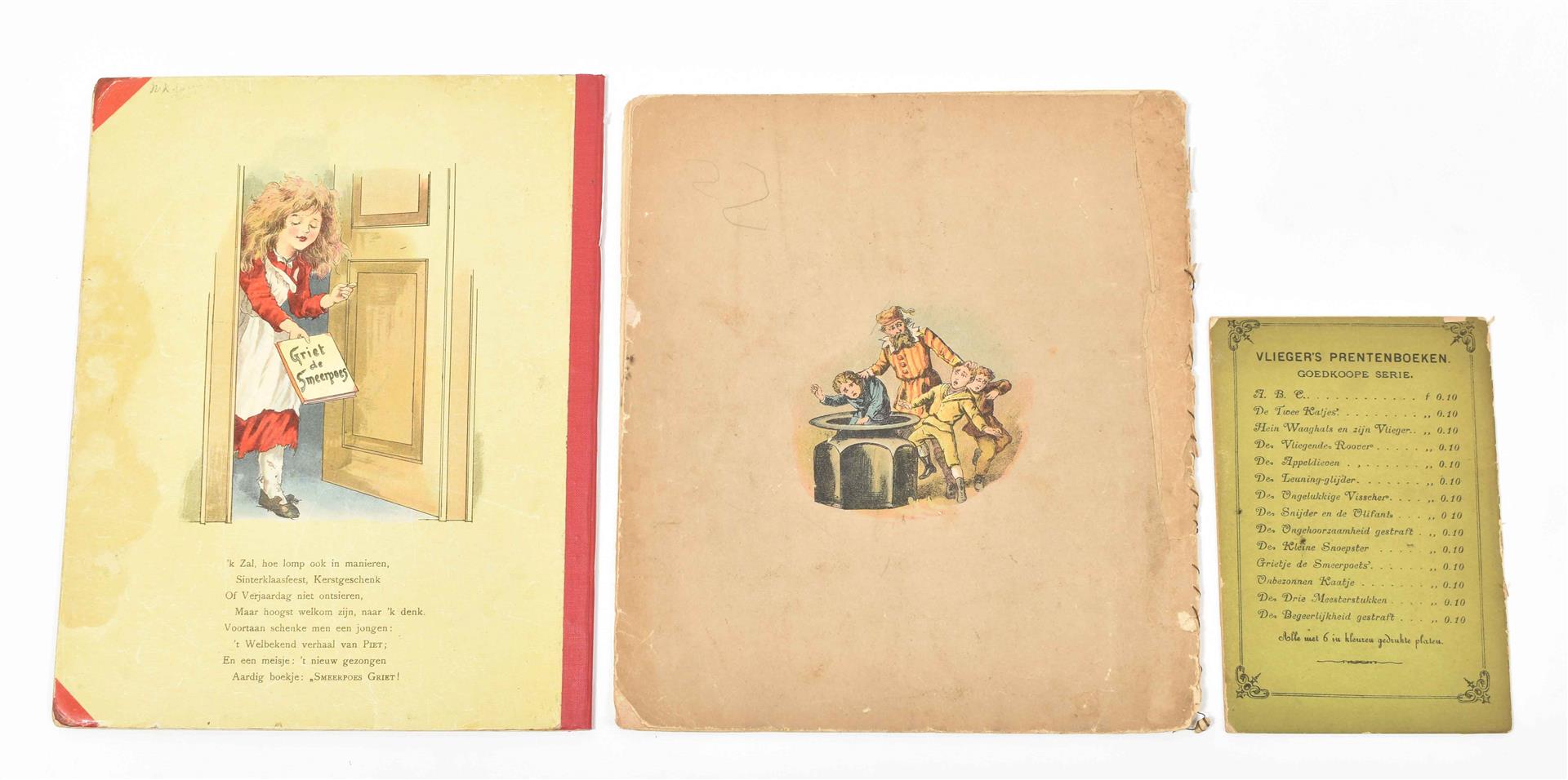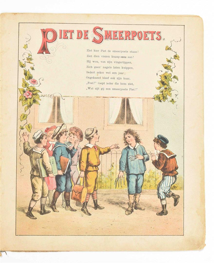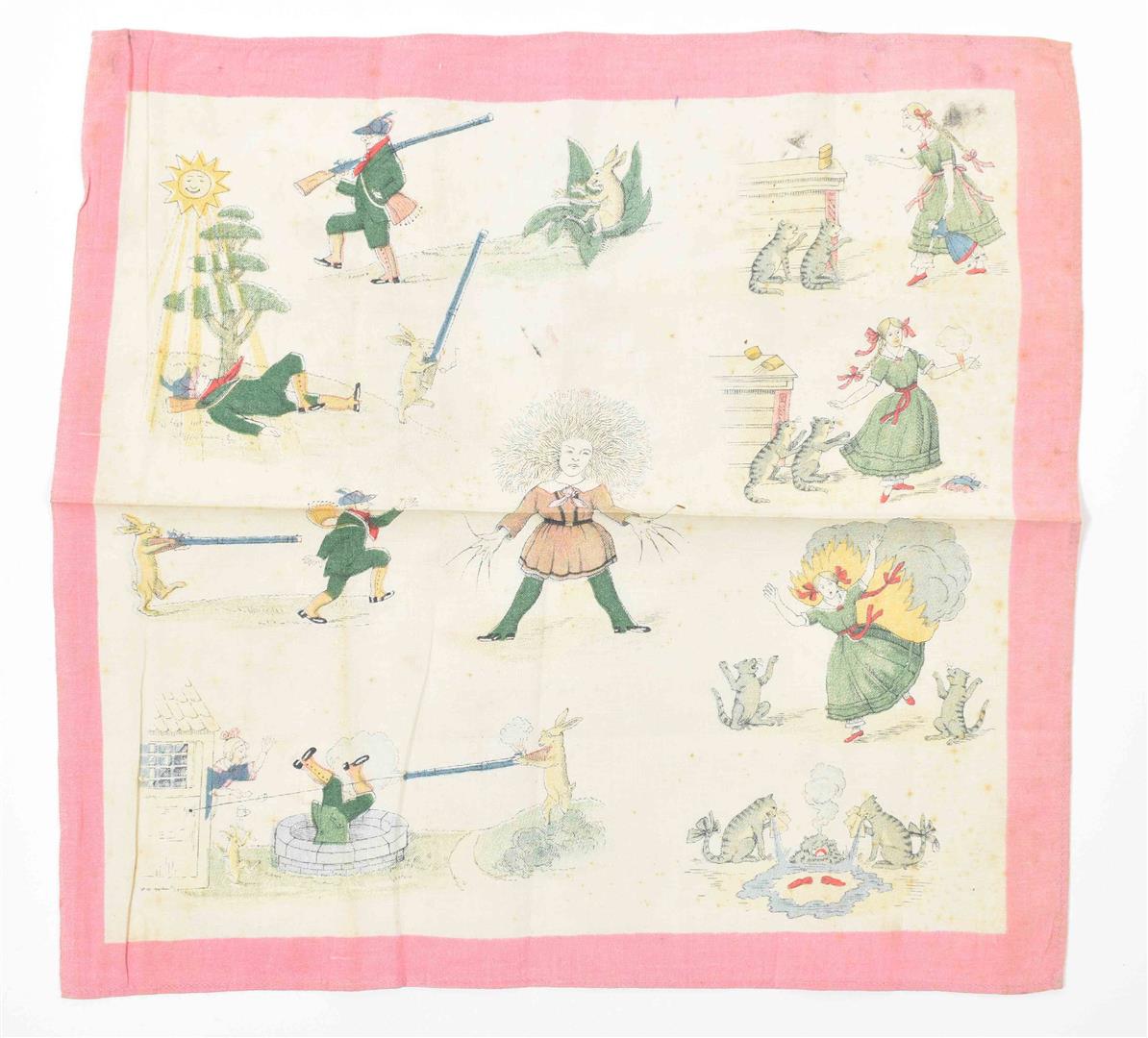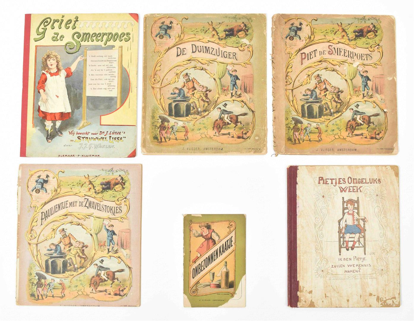 Vrij bewerkt naar Dr. J. Lütje's "Struwwel Liese". Alkmaar, Kluitman, (1896). (2) Cl. handkerchief, 28 x 30 cm, dec. w. Struwwelpeter images. (3) Onbezonnen Kaatje. Amst., J. Vlieger, (1883). Worn copy. (4) Piet de smeerpoets. Ibid., idem, ca. 1880. Worn copy. -and 2 other Struwwelpeter stories publ. by Vlieger. -and 1 other.