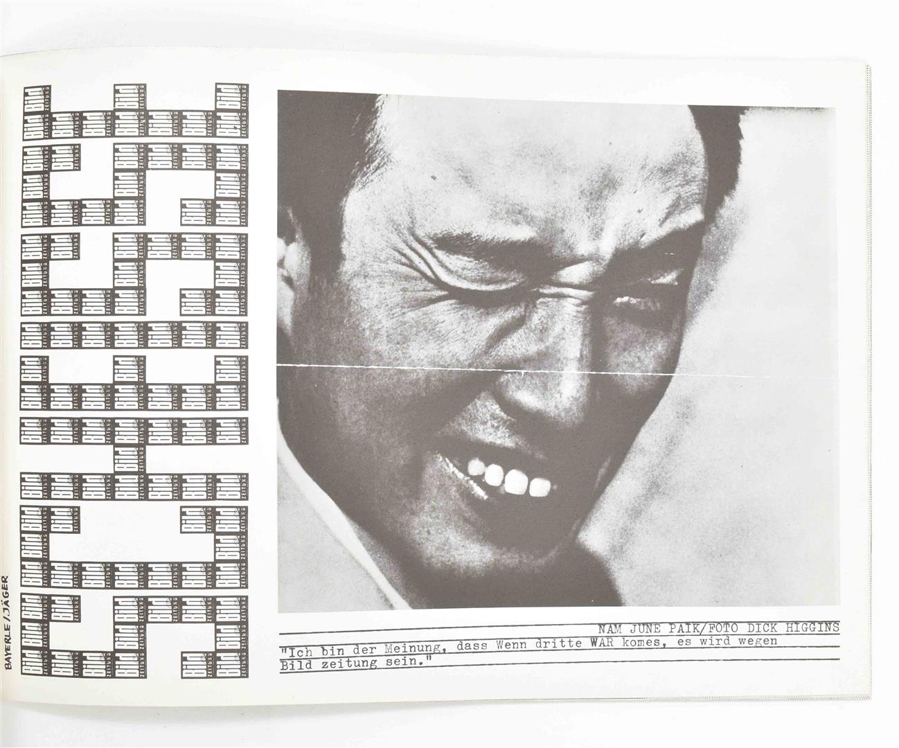 (1) Bloomsday 64: Actions, Agit-Pop, De-collage, Happenings, Texte: stanley brouwn, Bazon Brock, Franz Mon, Tomas Schmit, Wolf Vostell. Frankfurt, Galerie Loehr, 1964. 29.5 x 21 cm, 32 pp., b/w ills., stapled at top. Designed by Wolf Vostell. Very rare publication documenting the actions and happenings that took place at Loehr Galerie on June 26, 1964. The booklet was created by cutting the double-sided poster for the event into 16 sheets. Featured are 'a short manifest by stanley brouwn', a collage by Mon, a typewriter poem by Schmit, text for Paik's Symphony No.5 and Décollages by Vostell et al.
