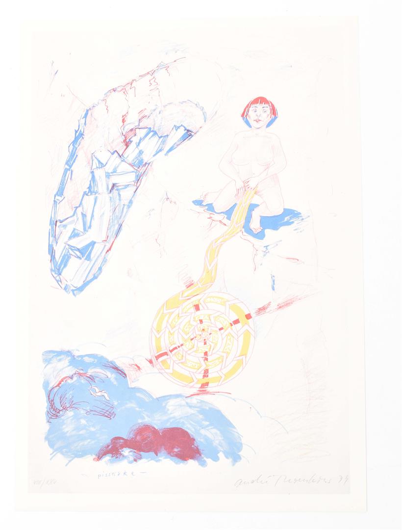 Portfolio measures 52 x 37 cm, prints 50 x 35 cm. The portfolio cover shows a tipped on colour litho with the editor information (a little bubbly at glued areas). The original drawing and all prints are in excellent condition.