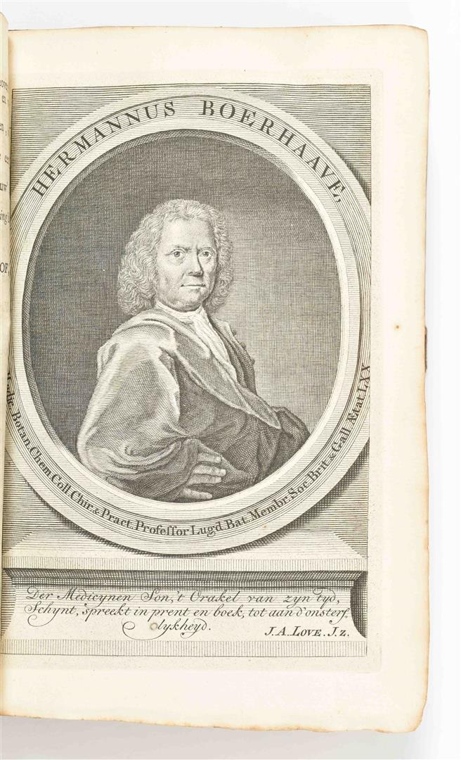 In zyn leven doctor in de wysbegeerte en geneeskunde, professor in de geneeskunde, botanie, chemie, praesident van 't chiryrgyns collegie, op 's lands hooge school tot Leyden (...). Vertaald, en vermeerdery met aanteekeningen, inleyding, en naukeurigen registers dor Cornelis Lóve (...). Amst., J. Gysius, 1745, LXVIII,651,(1) p., engr. frontsip. and portrait of Boerhaave, contemp. hcalf, gilt and ribbed spine w. mor. letterp.