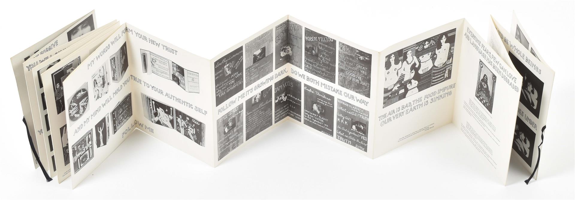 Artists' book, 25 x 20 cm, leporello formed of 17 parts, printed both sides. Coloured illustrated original boards, with black ribbon closures. Profusely illustrated with reproduced drawings and photos.