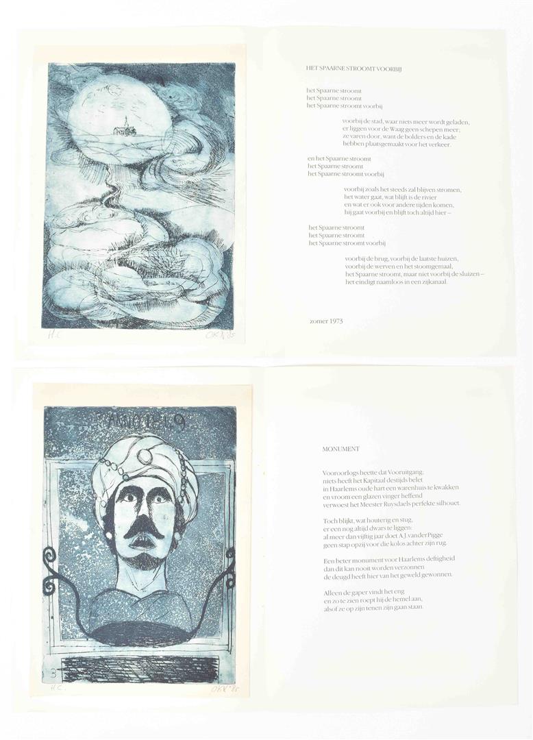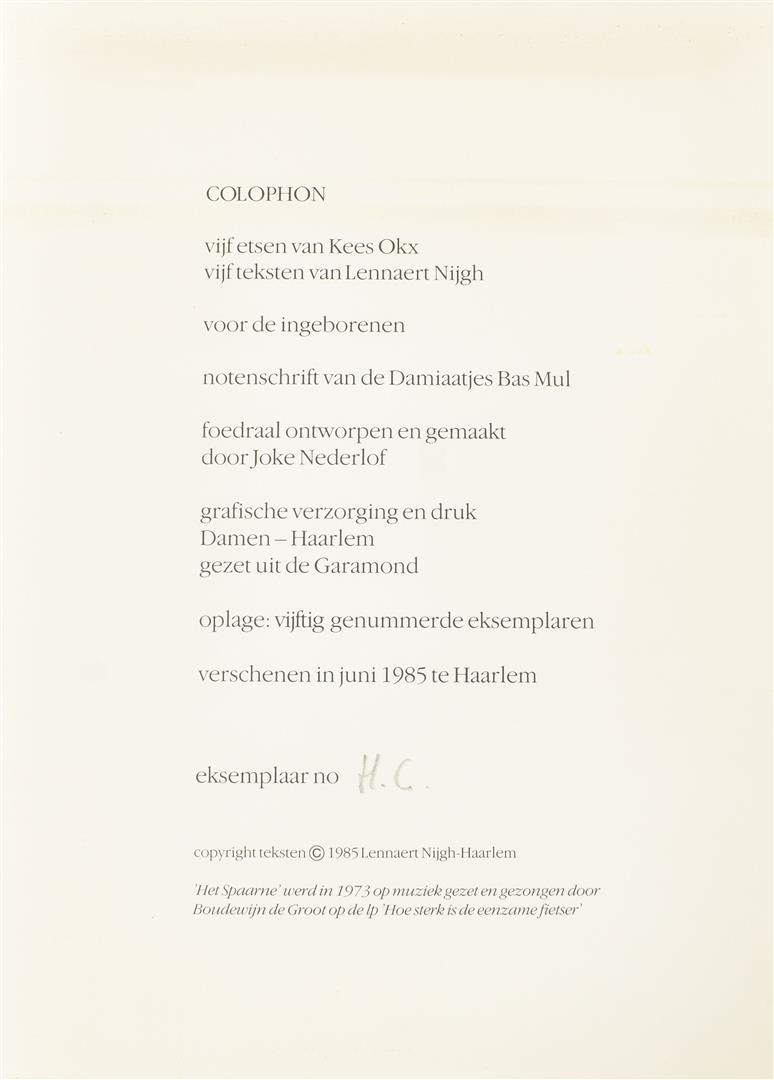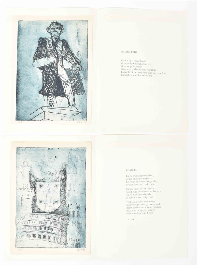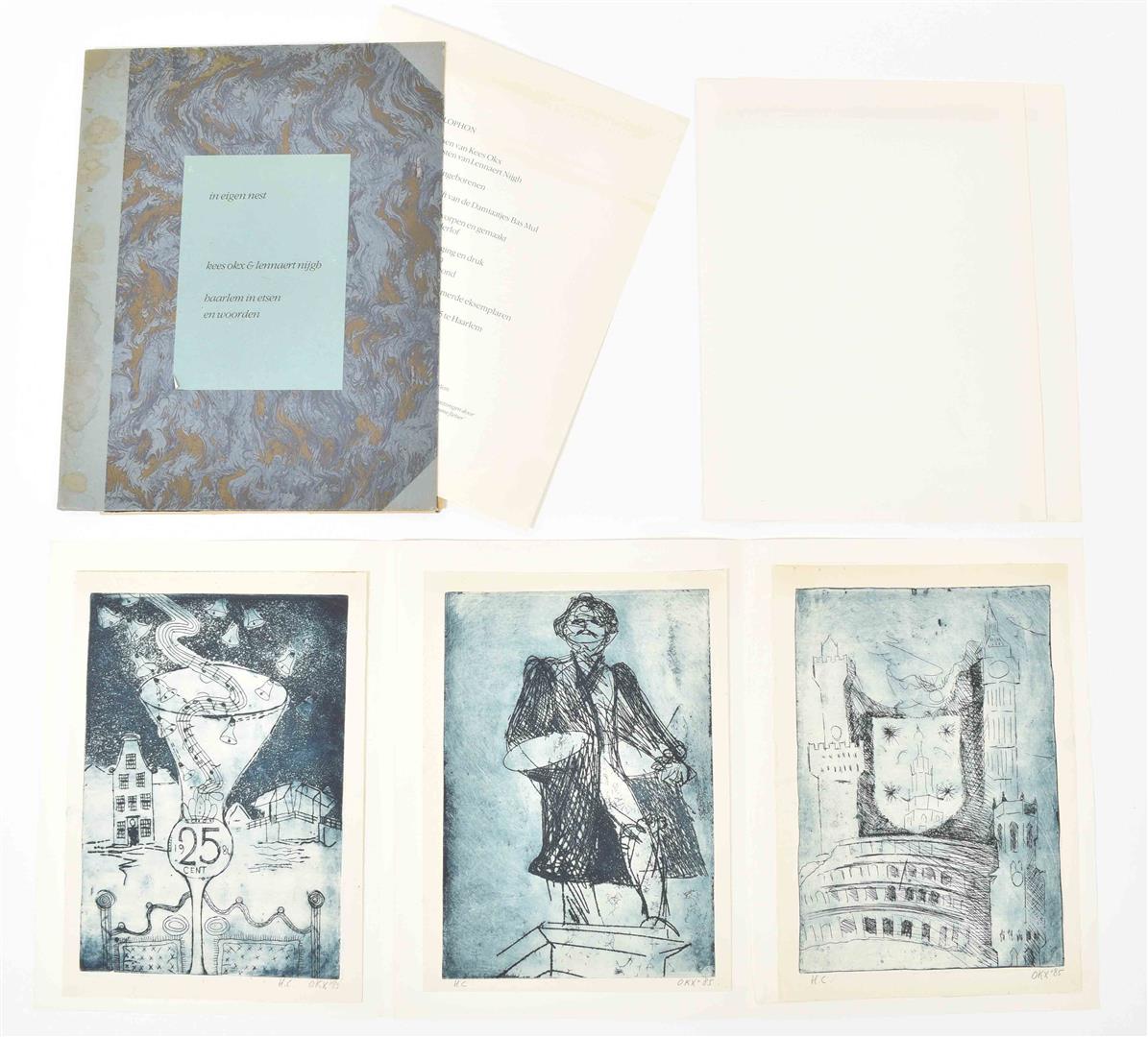 Haarlem in etsen en woorden. Haarlem, 1985. 5 texts by Nijgh, each w. an etching by K. Okx, no. H.C. Together in orig. (sl. worn) hcl. portfolio (cl. ties lacking), 45 x 35 cm.