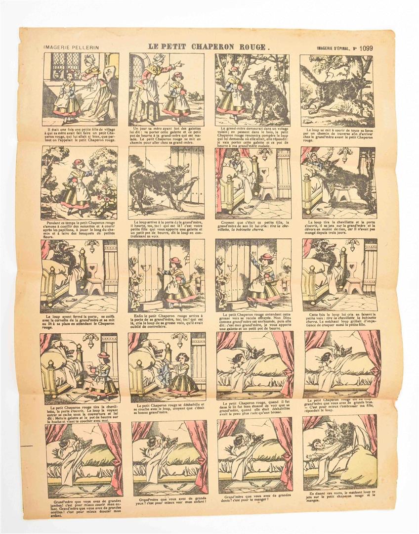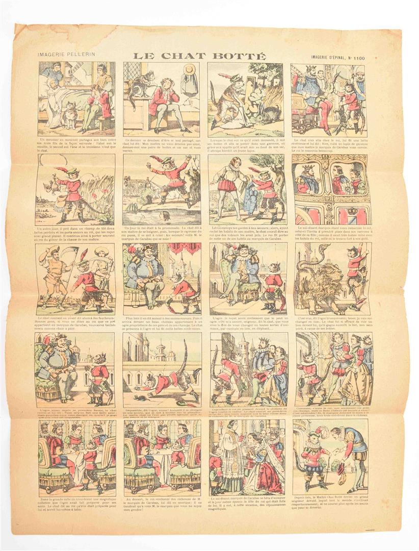 All 19th cent. (1) Four Imagerie d'Epinal prints, ca. 1890: Le petit chaperon rouge, Le nain jaune, Le chat botté and Marthe la bonne petite ménagère. (2) Many copies (most complete) of a series of 60 Imagerie d'Epinal prints in English "printed expressly for the Humoristic Publishing Co, Kansas City, Mo.", ca. 1850-75. Prints of var. stories such as Impossible Adventures, Francis the Foundling, The Discreet Child and The Selfish Little Boy. (3) Var. prints from the Prenten-Magazijn voor de Jeugd, publ. by D. Noothoven van Goor (mid 19th cent.).
