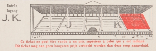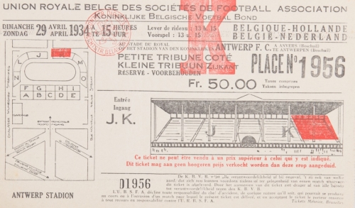 29 april 1934. Voorspel 13u.15 In het stadion van de Koninklijke, Antwerpen. Ticket number D 1956.