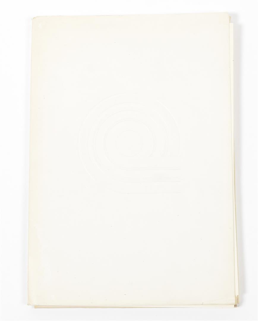 White portfolio with die cut wrapper, holding 2 loose text sheets, 20 paginated artists contributions printed black on thick white sheets, 1 colophon sheet and a cellophane sheet printed with title information and names of the participants. Catalogue/artists' book for the first international exhibition of conceptual art in Yugoslavia curated by Braco and Nena Dimitrijevic.