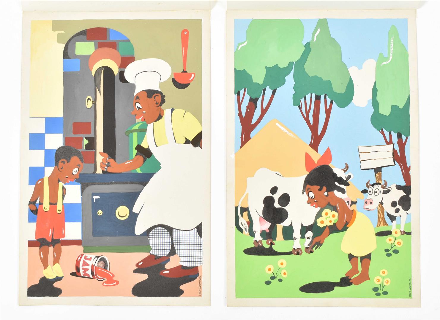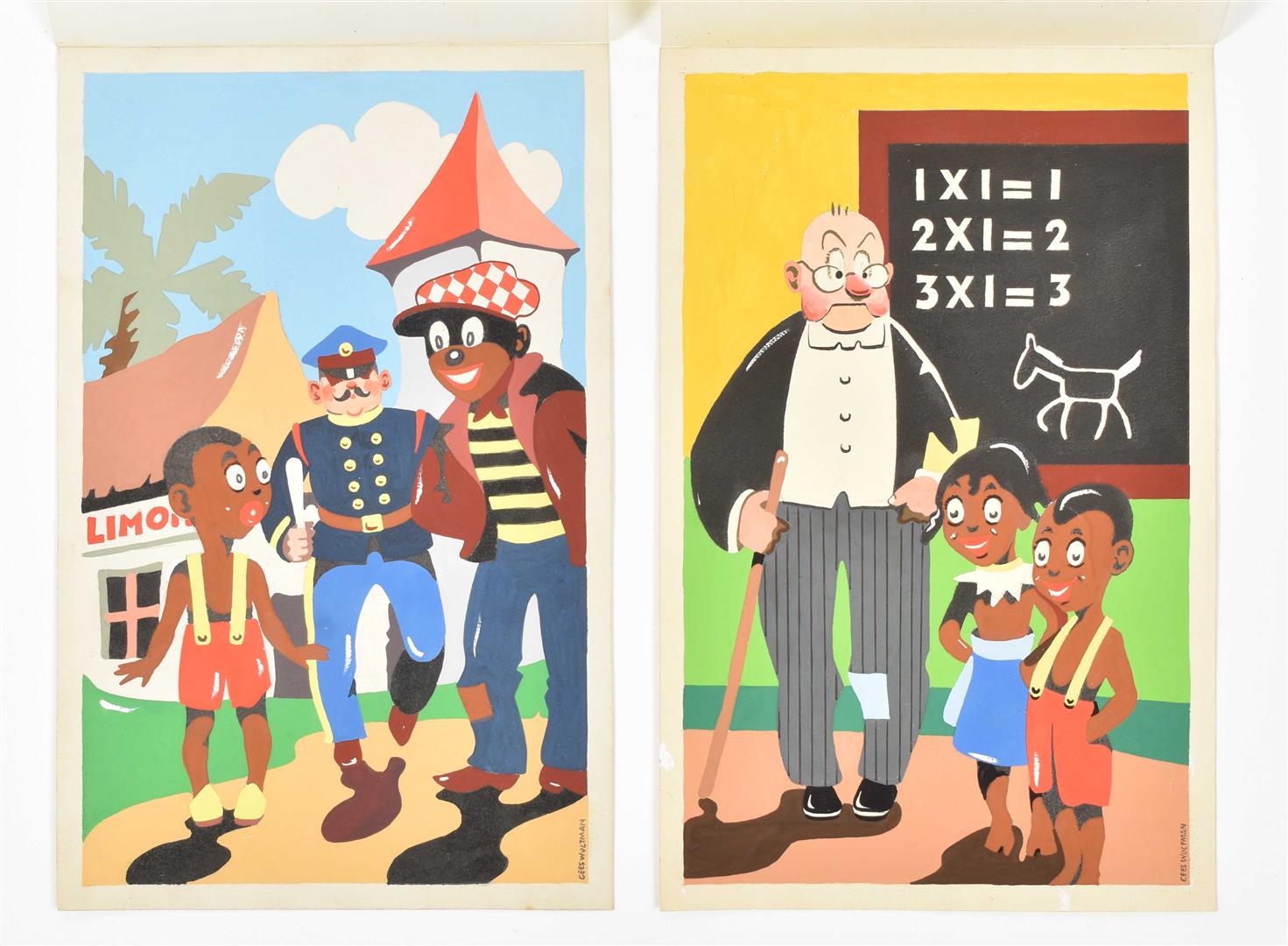 possibly for a children's book (never published?). Each painted on 21 x 14 cm piece of paper w. tissue/ paper guard, all signed "Cees Woltman" on lower right corner of the image. All depicting dated representations of black people.