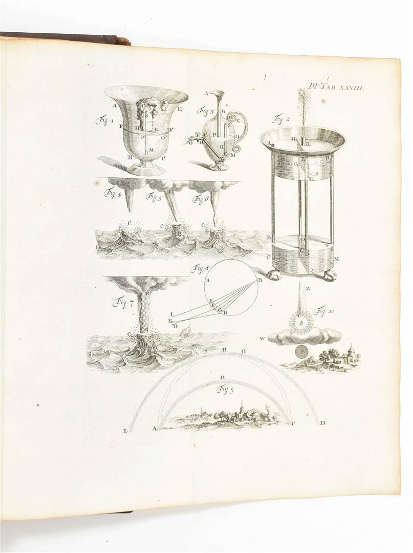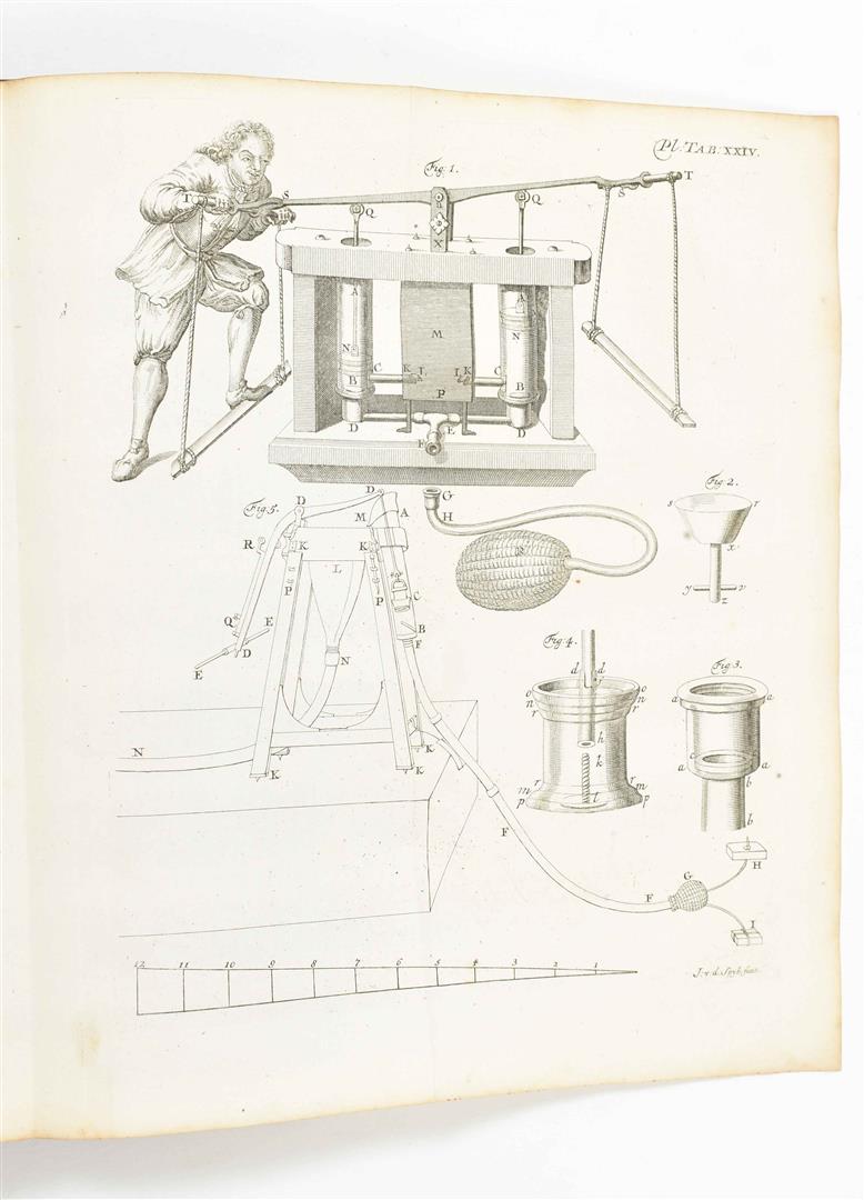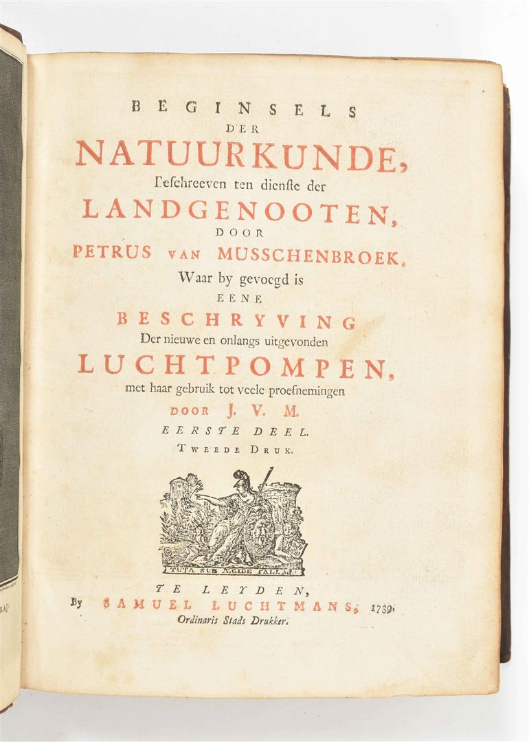 waar by gevoegd is eene beschryving der nieuwe en onlangs uitgevonden luchtpompen, (...) door J. v. M(usschenbroek). Eerste deel. Tweede Druk. Leiden, S. Luchtmans, 1739. 3 in 1 vol. (26),510; (2),511-900, (20); 62,(8) p. Engr. frontisp. portrait, 1 fold. map & 34 fold. plates. Full calf, gilt back and red label. 4to.