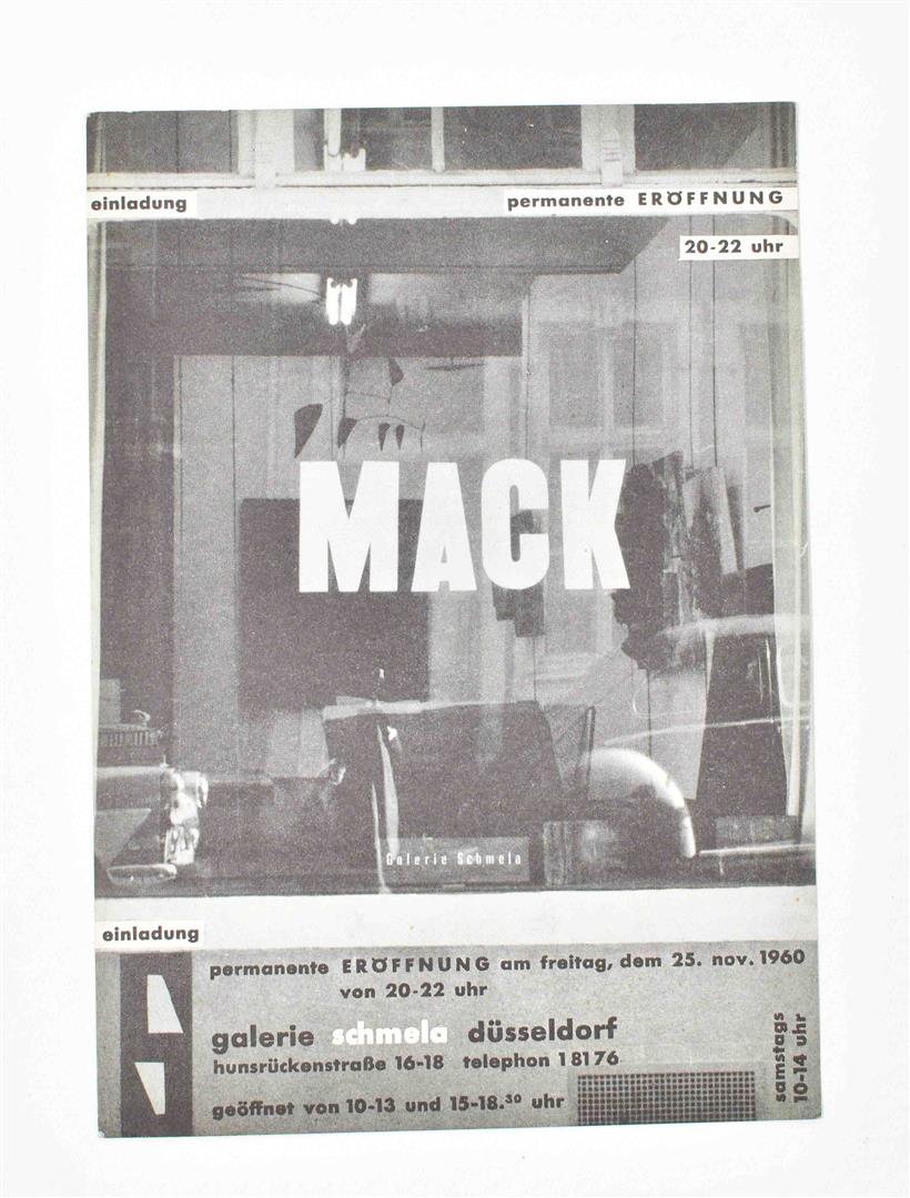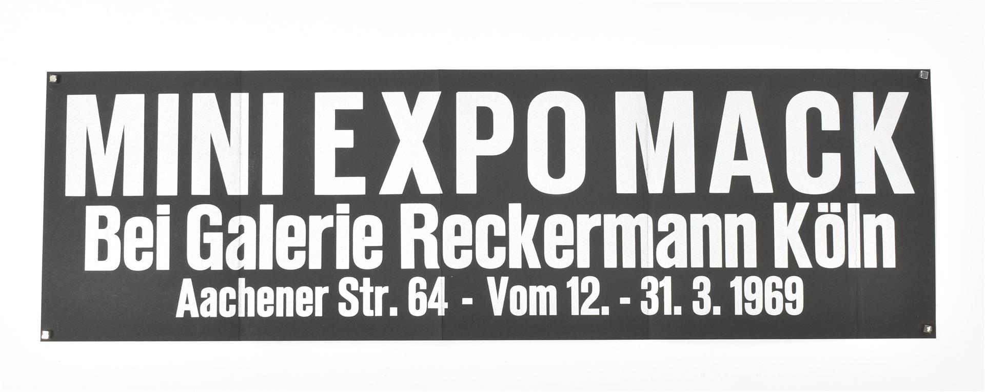 Added: (2) Invitation card Mack Galerie Schmela Dusseldorf, 25 November 1960. 21 x 15 cm, very light rubbing to corners, fine copy. (3) Mini Expo Mack bei Galerie Reckermann Cologne, 1969. Large fold-out card printed silver on thick black stock, 18.5 x 60 cm, in very good condition. (total 3)