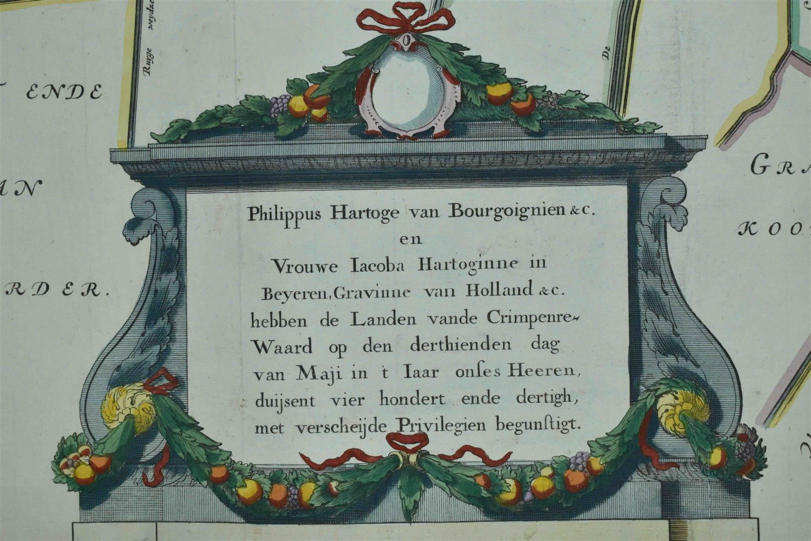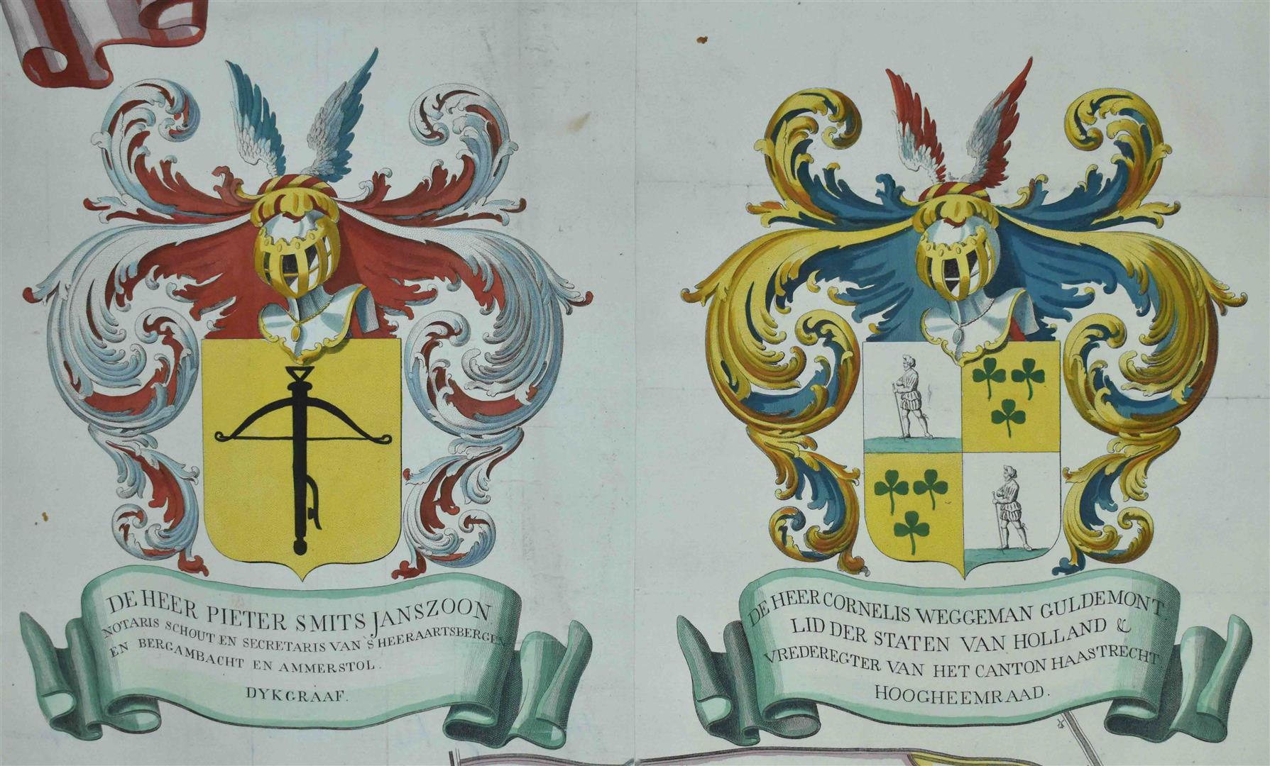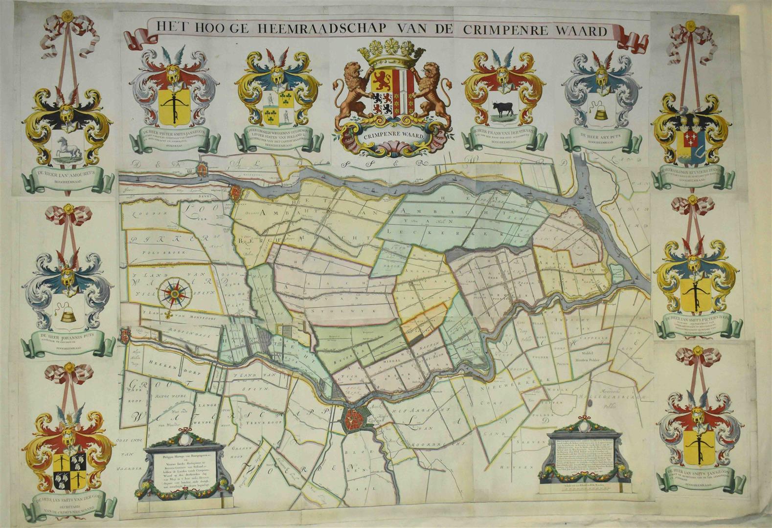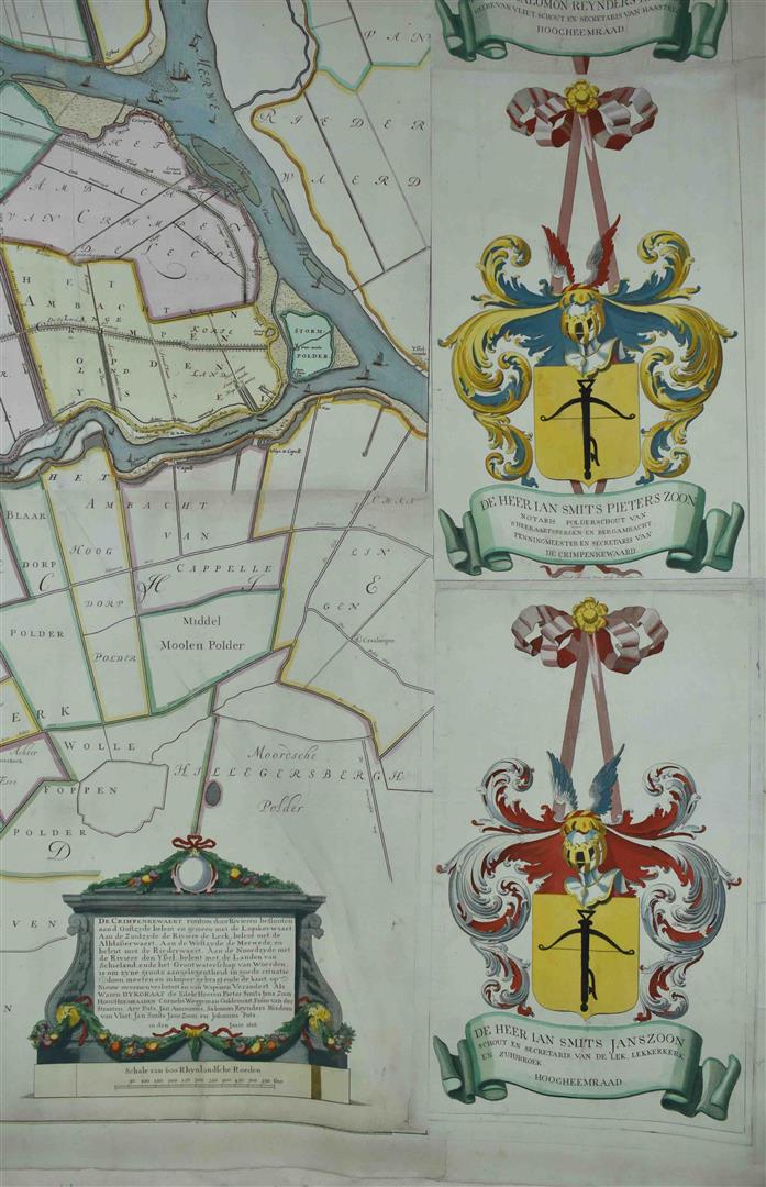 Rare map, first published in 1683 and republished with alterations between 1696 and 1818, usually in small editions of about 200 copies, sometimes published bound together as a book. The editions varied predominantly in the coats of arms of the changing dike reeves but also in some editing of the map itself. (Ref. Donkersloot-de Vrij 766).