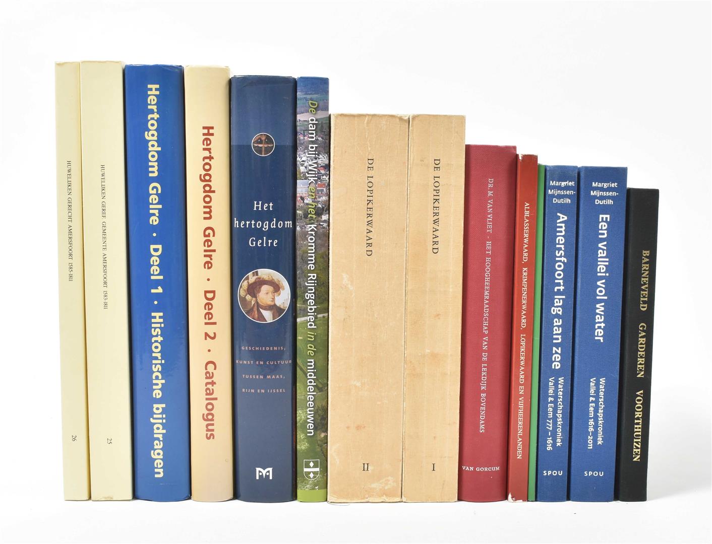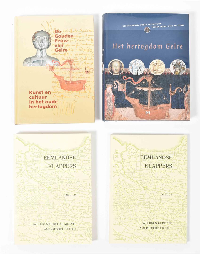 Dorp en kerspel/ De Waterschappen. Utrecht, Kemink, 1963. Vols. 1-2. Sc. 4to. (2) Mijnssen-Dutilh, M. Amersfoort lag aan zee & Een vallei vol water. Waterschapskroniek Vallei & Eem. 777-1616/ 1616-2011. Utrecht, Leudsen, 2007-11. Vols. 1-2 and loose insert w. map for vol. 2. Hcl. (2 vols.). 4to. (3) Gelre-Geldern-Gelderland. Geschiedenis en cultuur van het hertogdom Gelre. Geldern, Historischen Vereins für Geldern und Umgegend, 2001. 527 p. Hc. 4to. -and 3 other works about Gelre and Gelderland. -and 5 others.