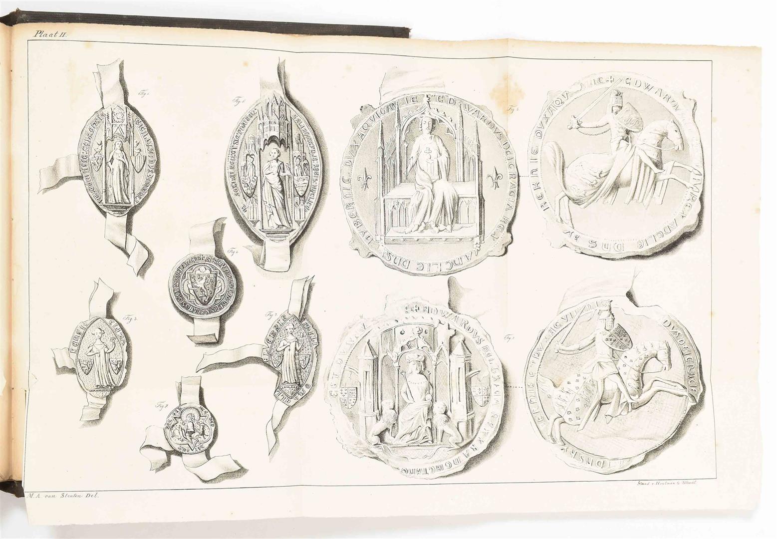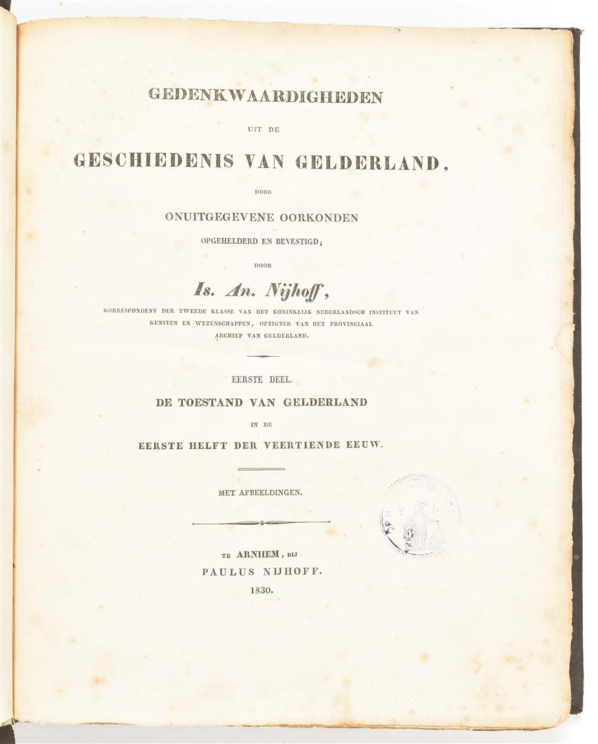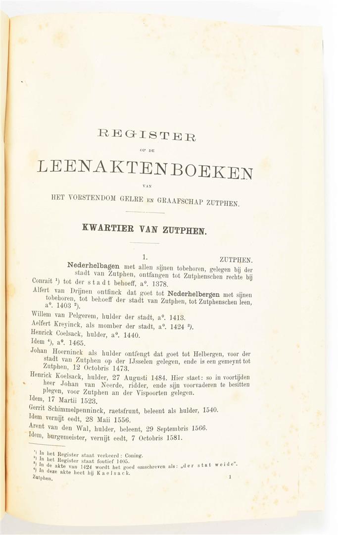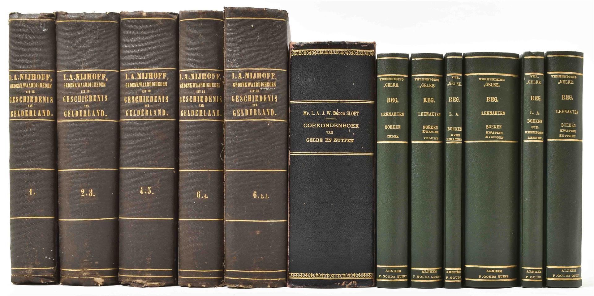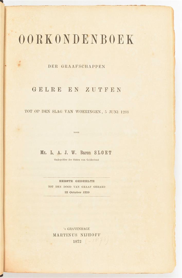 door onuitgegevene oorkonden opgehelderd en bevestigd. Arnhem, P. Nijhoff, 1830-75. 6 parts in 5 vols. 4 fold. facs. plates, untrimmed. Later cl. w. gilt titles on spines. 4to. Stamp on half titles and title pages. Bindings worn, foxing/ browning. Added: Sloet, L.A.J.W. Oorkondenboek der graafschappen Gelre en Zutfen (...). 's Gravenhage, M. Nijhoff, 1872. 1208 p. 2 fold. plates, 1 torn. Later (sl. worn) hcl. w. gilt title on spine. Large 8vo. -and 6 vols. (incl. index vol.) of Register op de Leenaktenboeken.