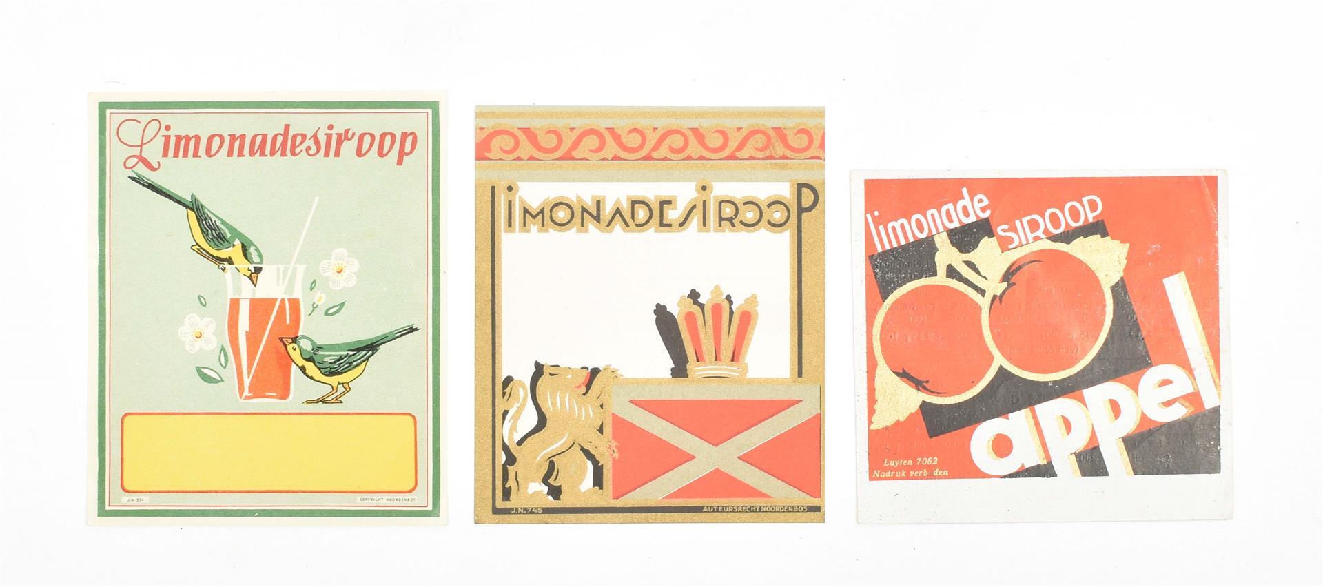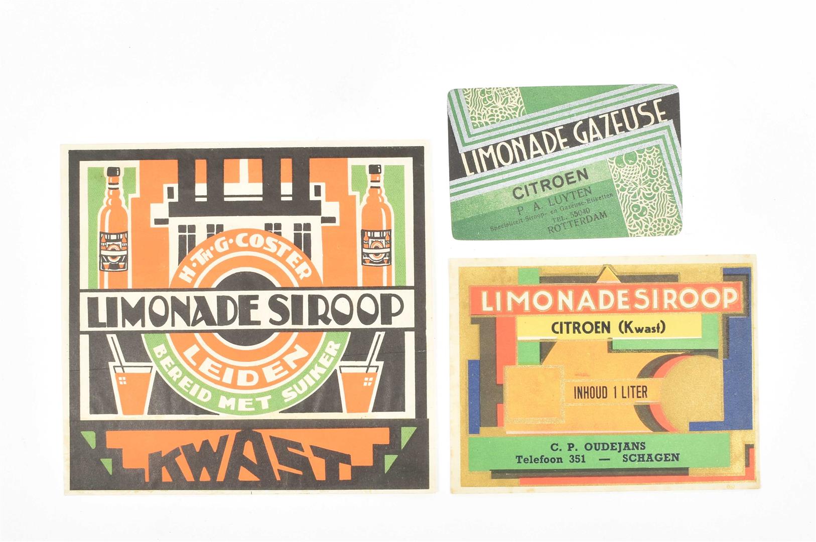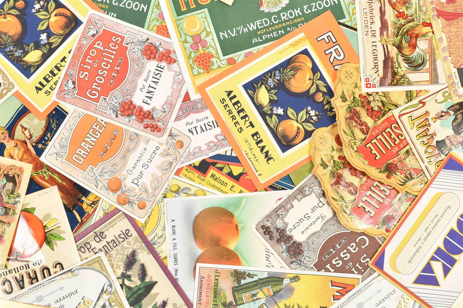 Mostly Dutch or French language, ca. 1900-60, var. techniques (incl. many chromolithographs). The colourful collection comprises a number of notable art deco designs, several designs are signed Noordenbos in the technique. Added: A similar collection of approx. 300 labels for alcoholic beverages, like the first containing striking art deco designs, some also signed Noordeloos in the technique.