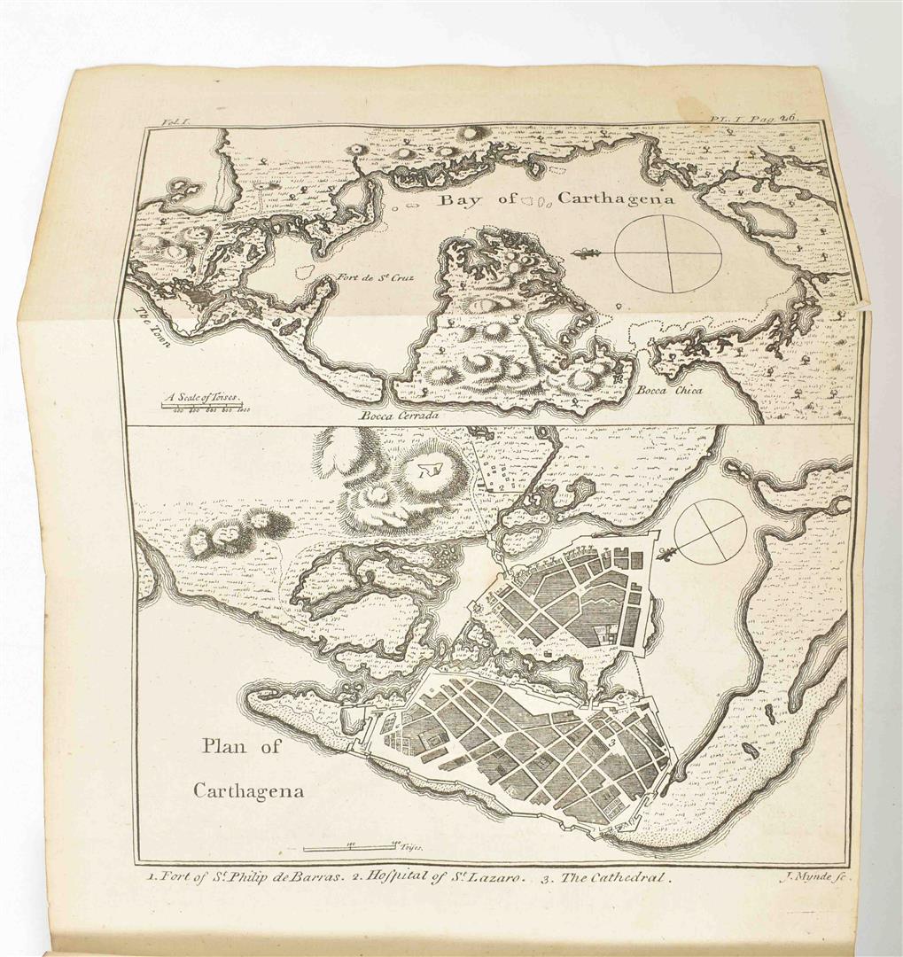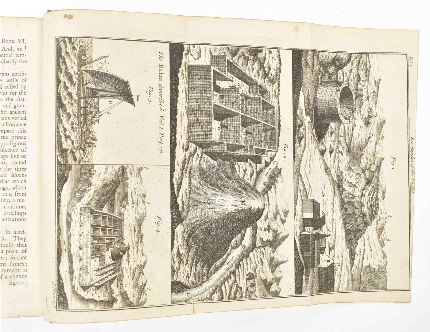 London, L. Davis, 1772. 3rd English ed. 2 vols. (24),479; (4),419,(15) p. 1 fold. engr. map, 6 fold. engr. plates (some w. plans). Unif. calf, mor. letterp. on spines. 8vo.