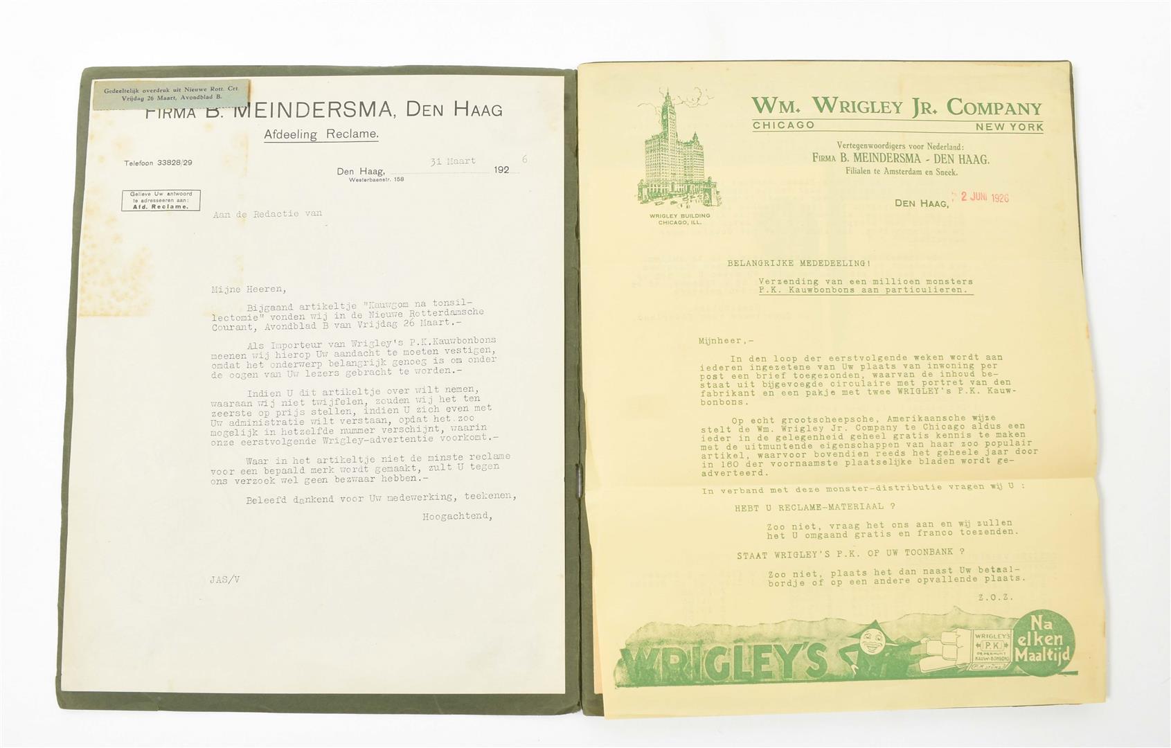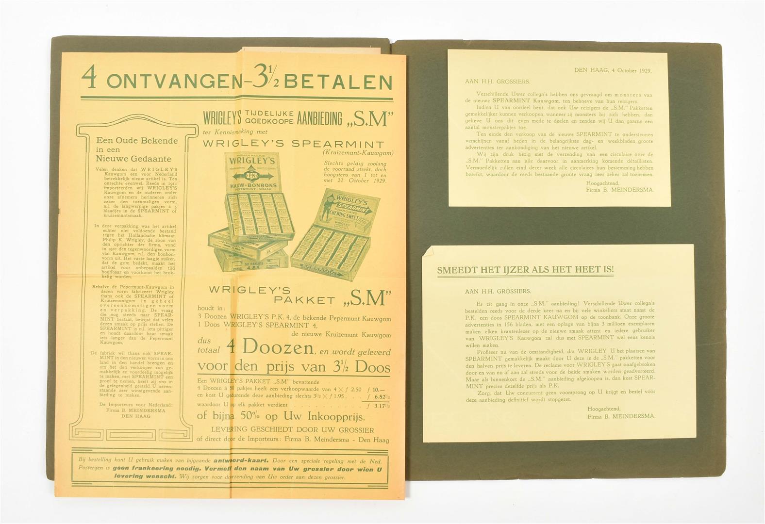 Most items from the 1920s. 2 folders of var. Dutch items, all glued/ tipped in on to pages. Incl. a.o. num. typed letters and envelopes from the advertising department, blank ordering forms and packaging labels.