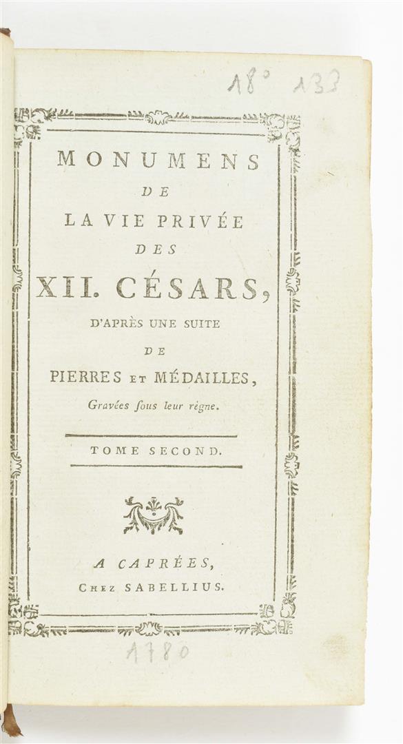 des XII. Césars, d'après une suite de pierres et médailles, gravées sous leur règne. Caprées, chez Sabellus (Nancy, Leclerc), (ca. 1784). Vol. 2 only. (2),168,(3) p. 27 oval engr. of erotic scenes. Contemp. calf w. gilt spine and border dec., marbled paper pastedowns and flylvs. 16mo.