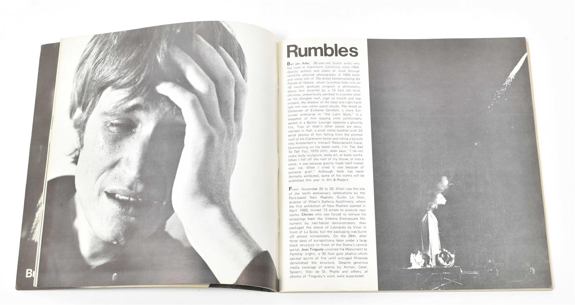 (1) Avalanche, Winter 1971. Published by Willoughby Sharp. Includes a short item on the artist in the Rumbles section, and a full page b/w image of 'I'm Too Sad To Tell You' (1970). (2) Personal Worlds, Reality as Metaphor, published by Visual Arts Office for Abroad, Amsterdam 1978. Includes 4 pp. regarding Ader.
