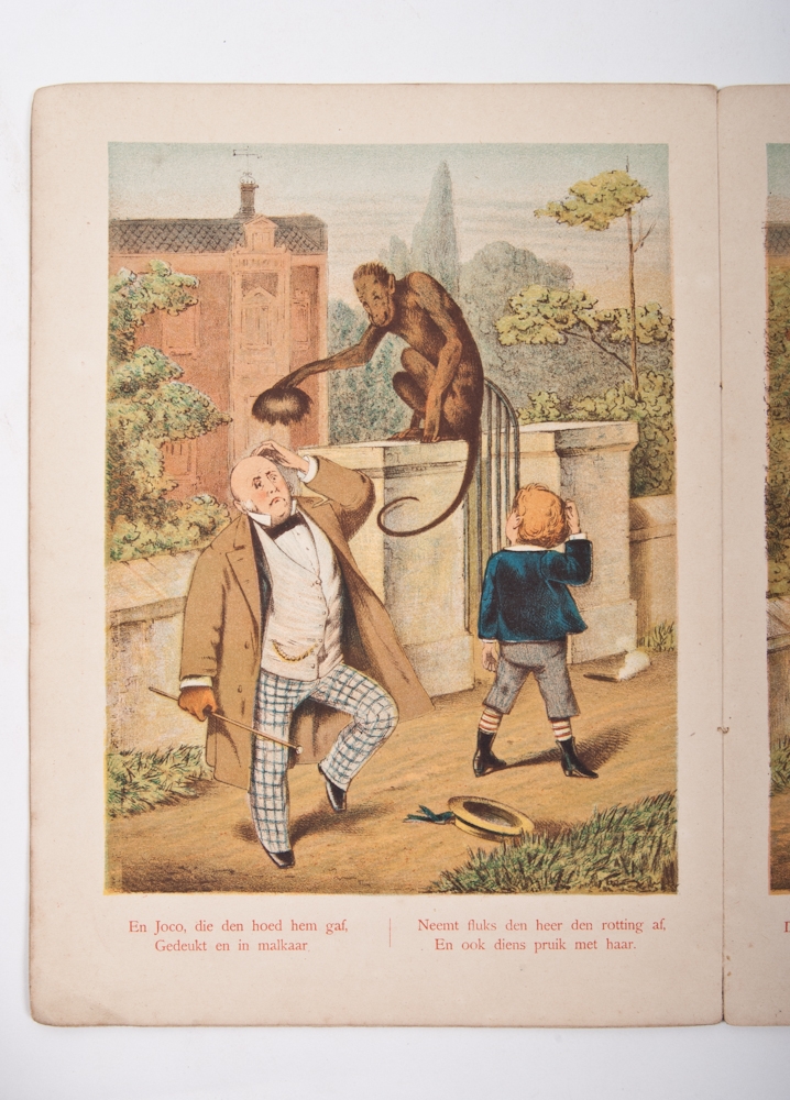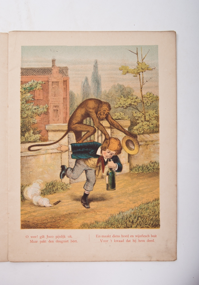 F.H. van Leent. J. Vlieger, Amsterdam. Amand, Lithography, Amsterdam. 12 p. Lithogr. plates with subscript in rhyme. Bound with strings, 4to. Small chip lower right corner (approx. 1 cm.), otherwise good copy.
