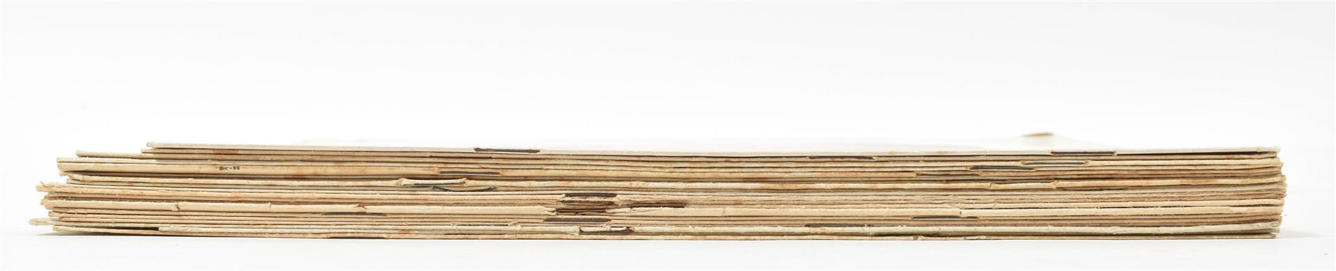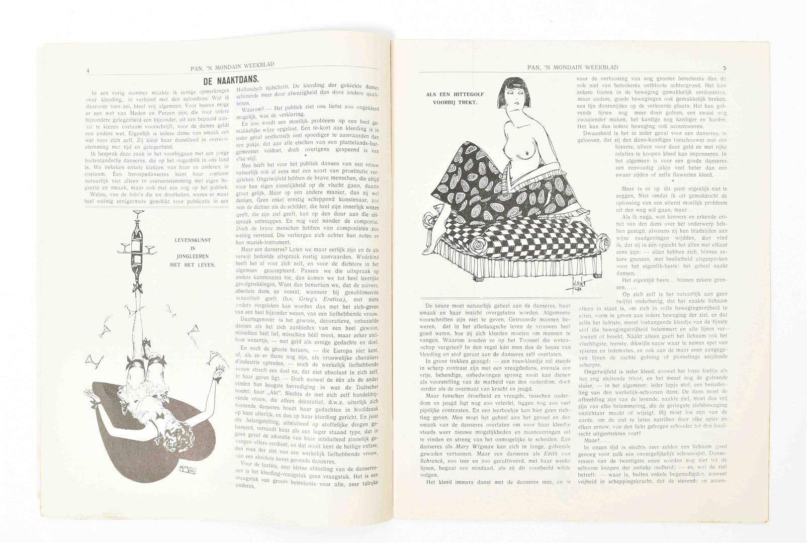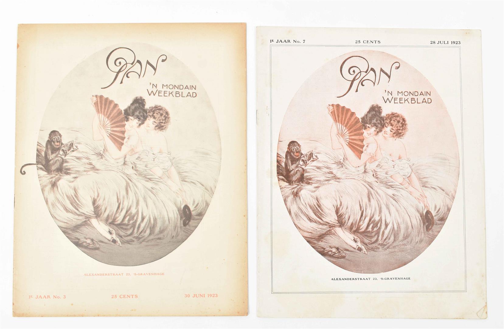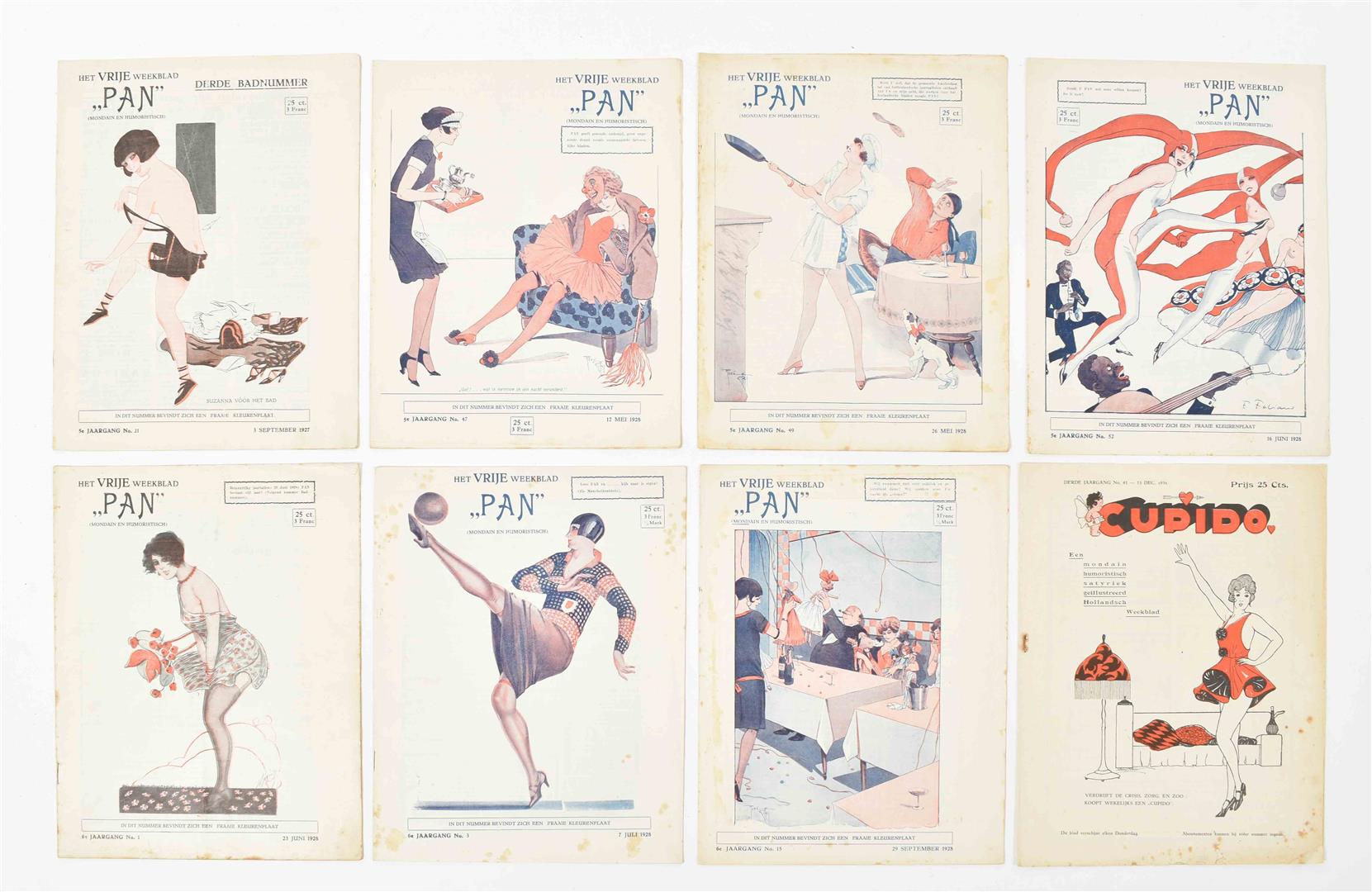(1) Pan. 'n Mondain weekblad/ Het vrije weekblad "Pan" (mondain en humoristisch). Year 1, no. 3 and 7; year 5, no. 11, 47, 49 and 52; and year 6, no. 1, 3 and 15. The Hague/ Amst., 1923-28, all 16 p., all nicely ill., orig. pict. stapled wr., large 4to/ sm. folio. Some foxing, regular traces of wear. (2) "Cupido". Een mondain, humoristisch, geïllustreerd weekblad. Year 3, no. 41; year 4, no. 34; and year 5, no. 20, 24, 47 and 49. Amst., 1934-37, all 16 p., all ill., orig. stapled wr., sm. folio. First issue lacks portion of front wr. at top, 4 vols. w. loose contents, some other imperfections. -and 11 similar others, incl. duplicates/ incomplete vols., a.o. 3 numbers of De Zwarte Kat and 5 wr. of La Semana Comica (without contents).