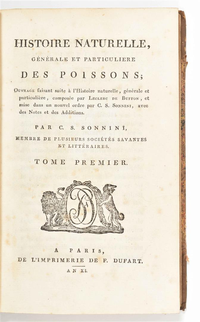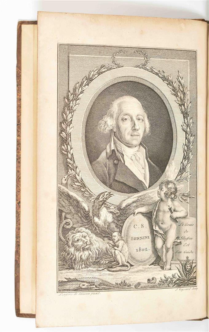 Nouvelle édition, accompagnée de notes (...) Ouvrage format un cours complet d'histoire naturelle, réd. par Charles N. Sigisb. Sonnini. Paris, F. Dufart, an VIII (1799-1808). 127 vol., rare complete set. Unif. hcalf w. marbled paper boards, mor. letterp. on ribbed spine. 8vo.