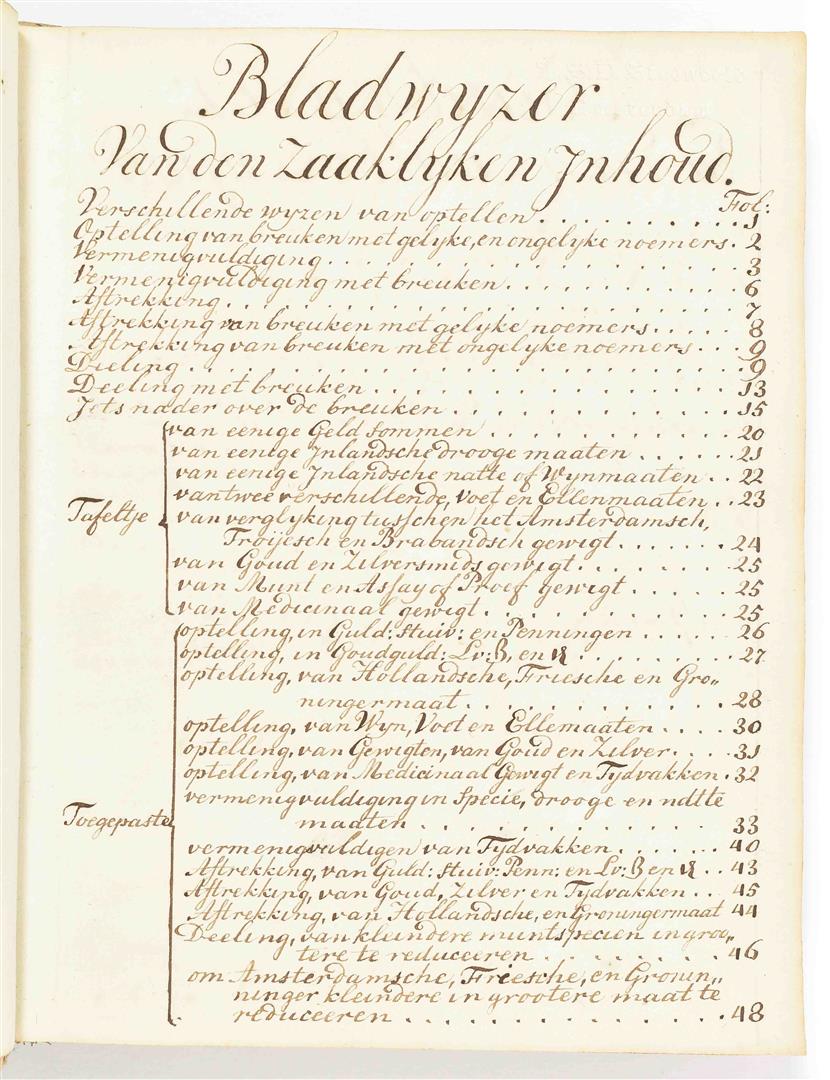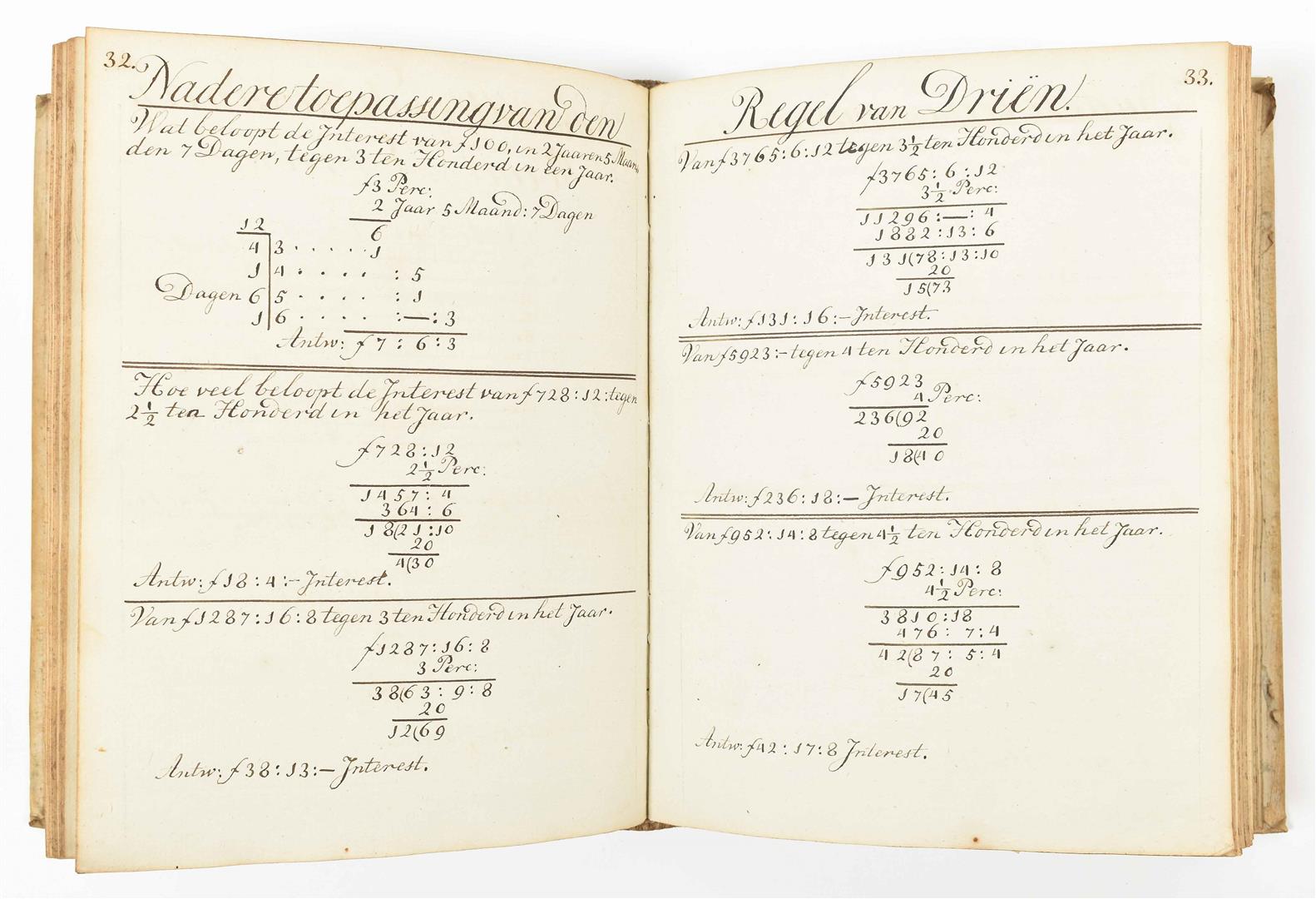 Several lvs. at the front with blindst. bookplate of "L.S.D. Steenveld, Amsterdam", some sm. lvs. w. notes added, very good condition. A very similar manuscript by Acquoy ("Reekenboek, voor meisjes, ten dienste der schoolen") w. the same blindst. was previously sold at this auction. Acquoy (1732-1818) was a gifted mathematician who gave lessons in Amsterdam to his grandson (also named) Jacobus (1803-73), who later also published books on mathematics. Our manuscript is presumably by the elder Acquoy. Not an exact copy of the book of H. Aeneae.