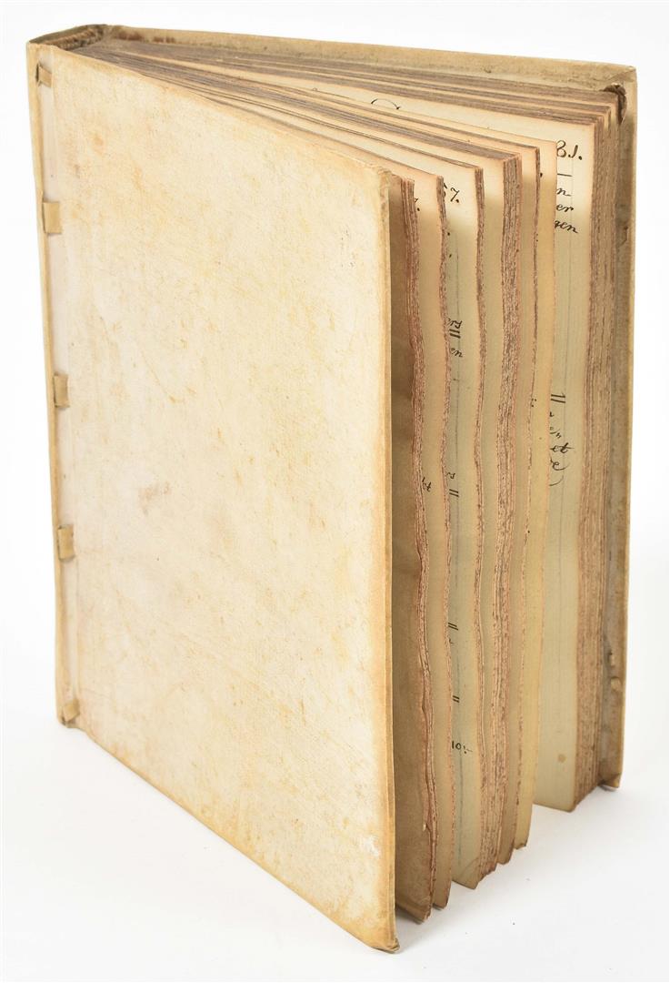 Door H. Aeneae. Uitgegeven door de Maarschappy Tot nut van 't algemeen. Meest onöpgelost, en zonder antwoorden voorgesteld. Ontbonder door Jacobus Acquoy. Te Amsterdam, 1796. Manuscript in fine, legible calligraphy, 2 parts in one vol. (parts 1 w. title-p. as mentioned, part 1 starts w. table of contents), (2),80,(2 blank); (1),(5 blank),203,(3 blank) p., cont. vellum, 4to.