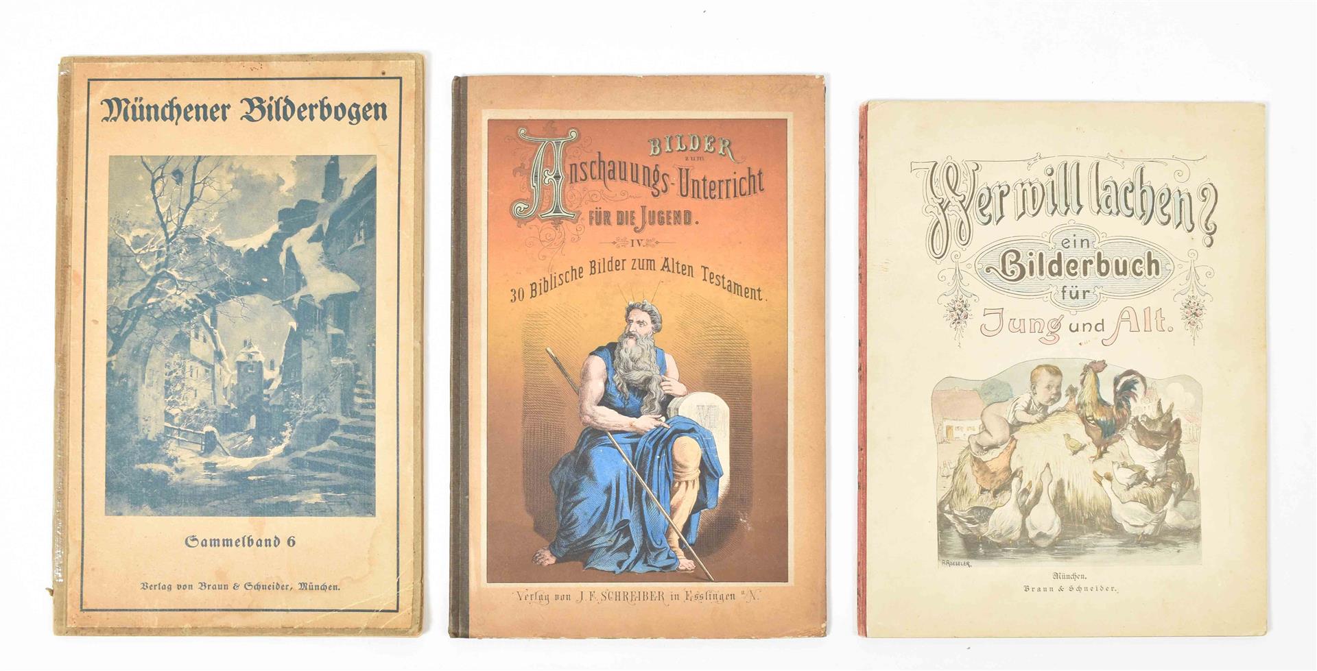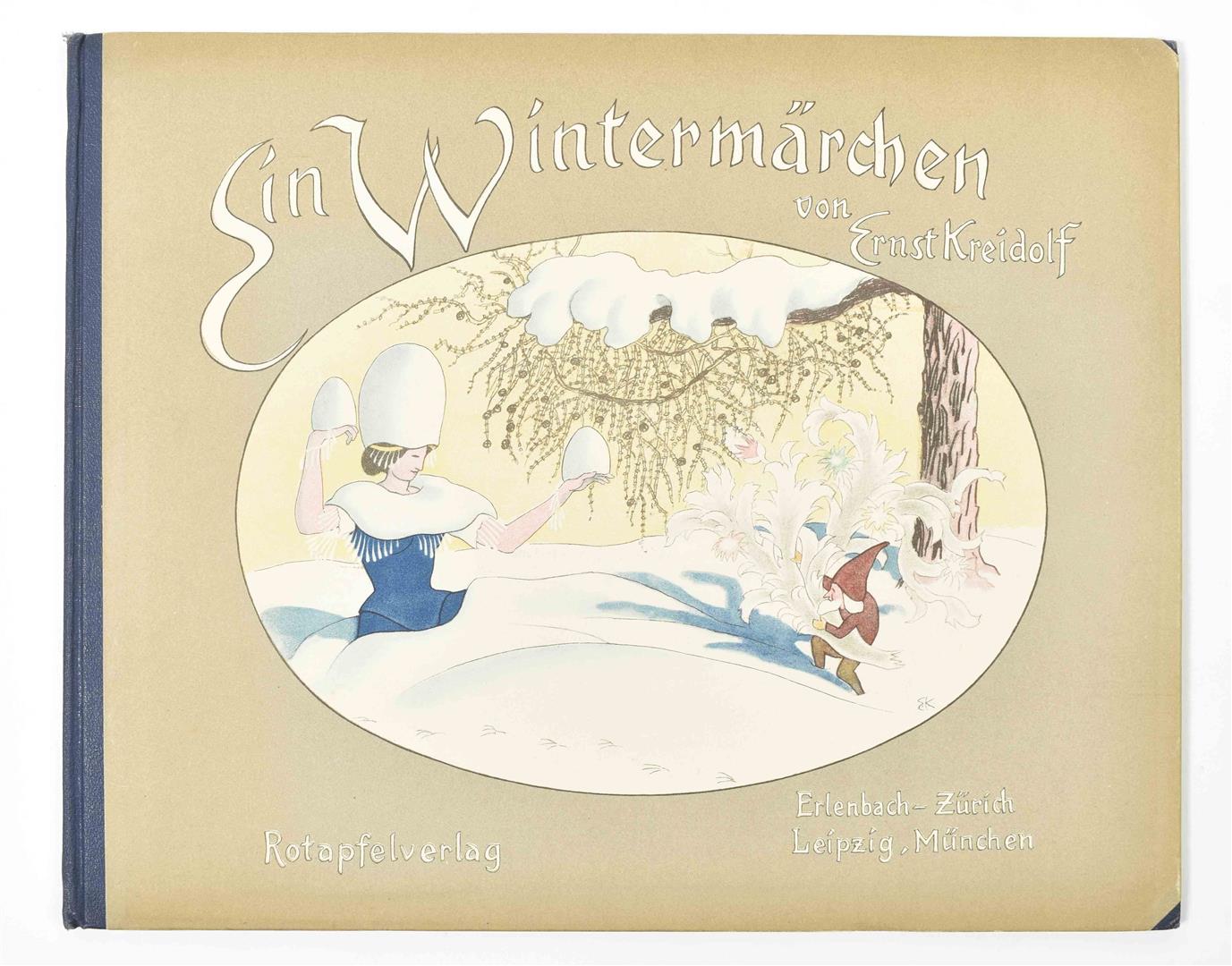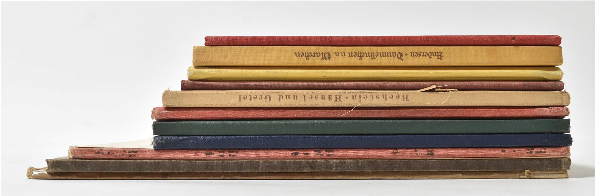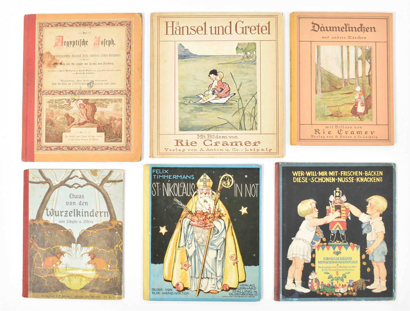 Ein Wintermärchen. Erlenbach etc., Rotapfelverlag, 1922/ 1924, 2 vols., 40/ 36 p., w. title-pages, 18/ 16 full-p. col. ills. and orig. clothbacked pict. boards by Kreidolf, obl. folio, w. orig. slipcases. Owner's entries in pen on title/ first free endpaper. Slipcases browned, w. tears on corners and other defects. (3) Hänsel und Gretel. Ein Märchen nach Ludwig Bechstein. Mit 8 bunten Vollbildern von Rie Cramer. Leipsic, A. Anton & Co, (1927), 16 p., w. 4 tipped-in col. plates (1x repeated on frontcover), 4 full-p. tinted ills. by Cramer, orig. clothbacked boards, 4to. Sl. foxed (incl. covers). (4) Timmermans, F. St. Nikolaus in Not. 47 Tausend. Oldenburg/ Hamburg, G. Stalling, (1926), (20) p., w. col. ills. and orig. pict. clothbacked boards after E. Wenz-Viëtor, 4to. Stalling-Bilderbuch no. 49. (5) Wer will lachen? Ein Bilderbuch für Jung und Alt. Dritte Auflage. Munich, Braun & Schneider, (ca. 1910), (32) p., richly ill., orig. clothbacked boards, folio. -and 6 others, incl. 1 other ill. by Cramer.