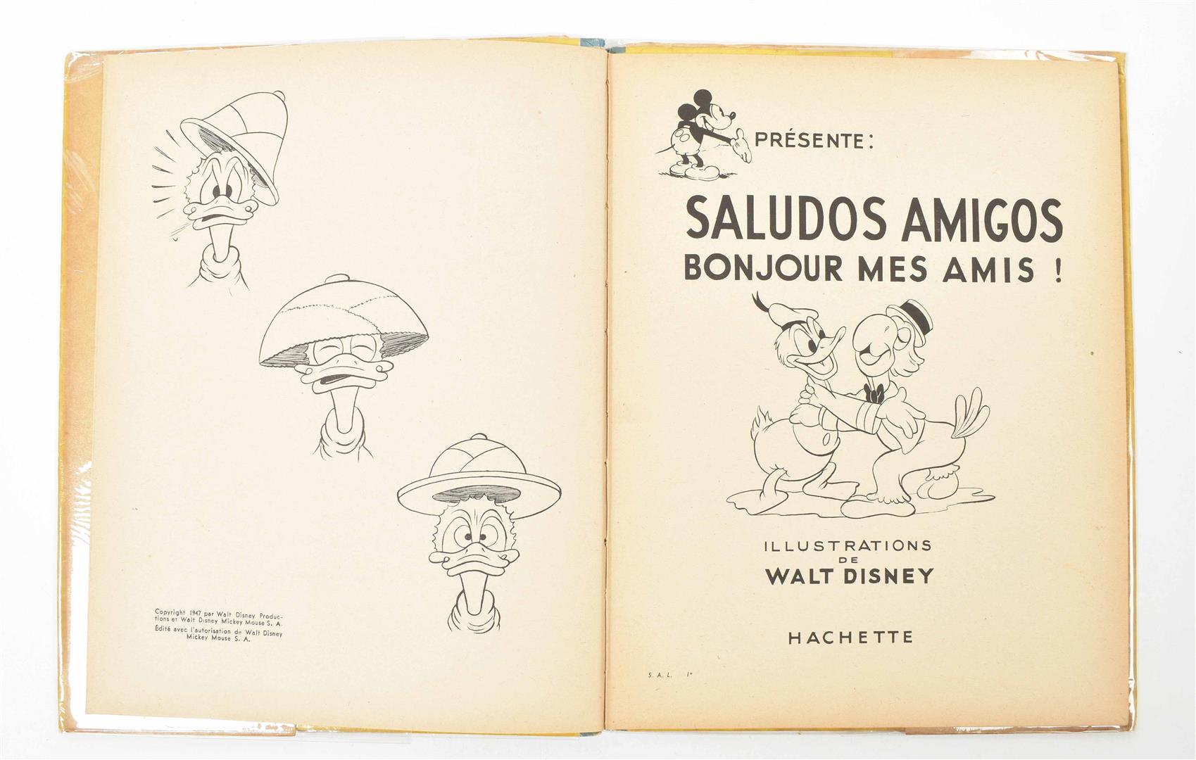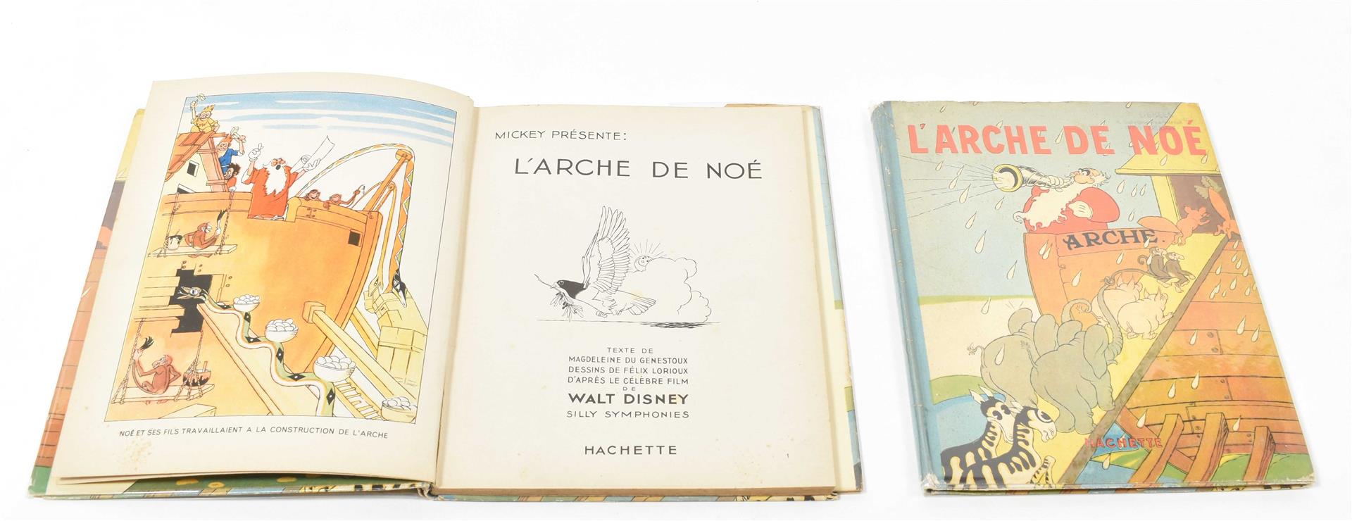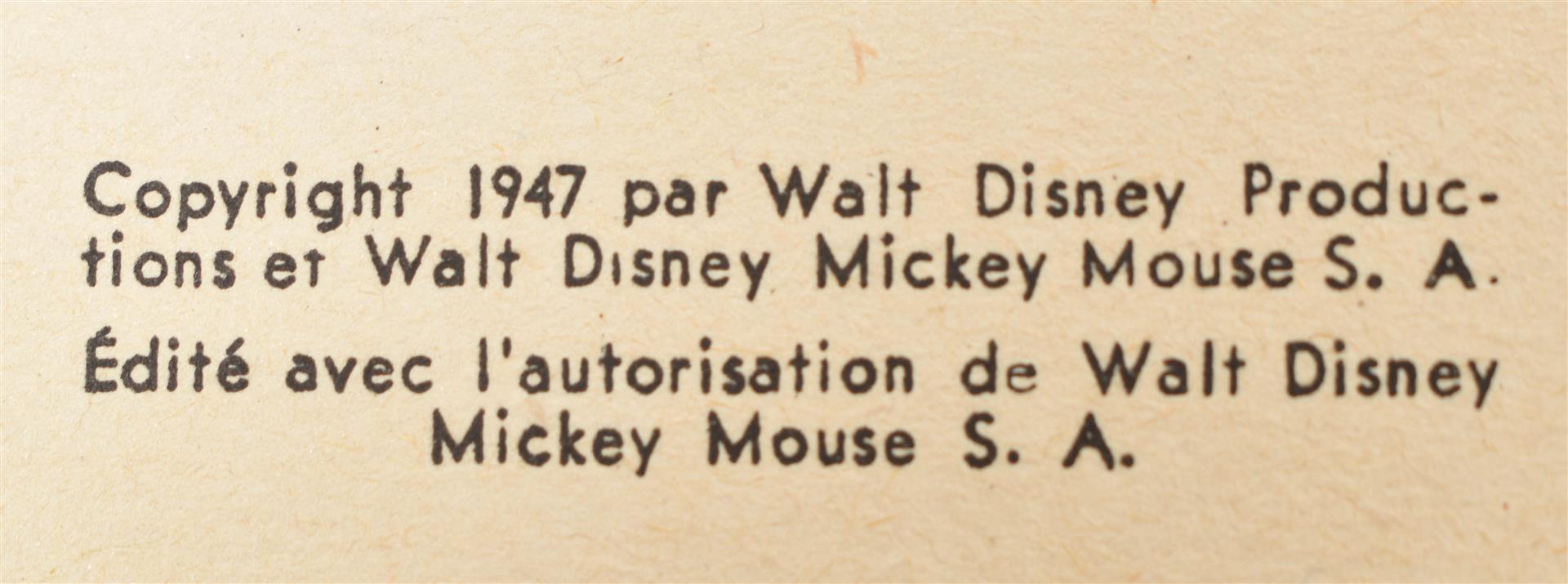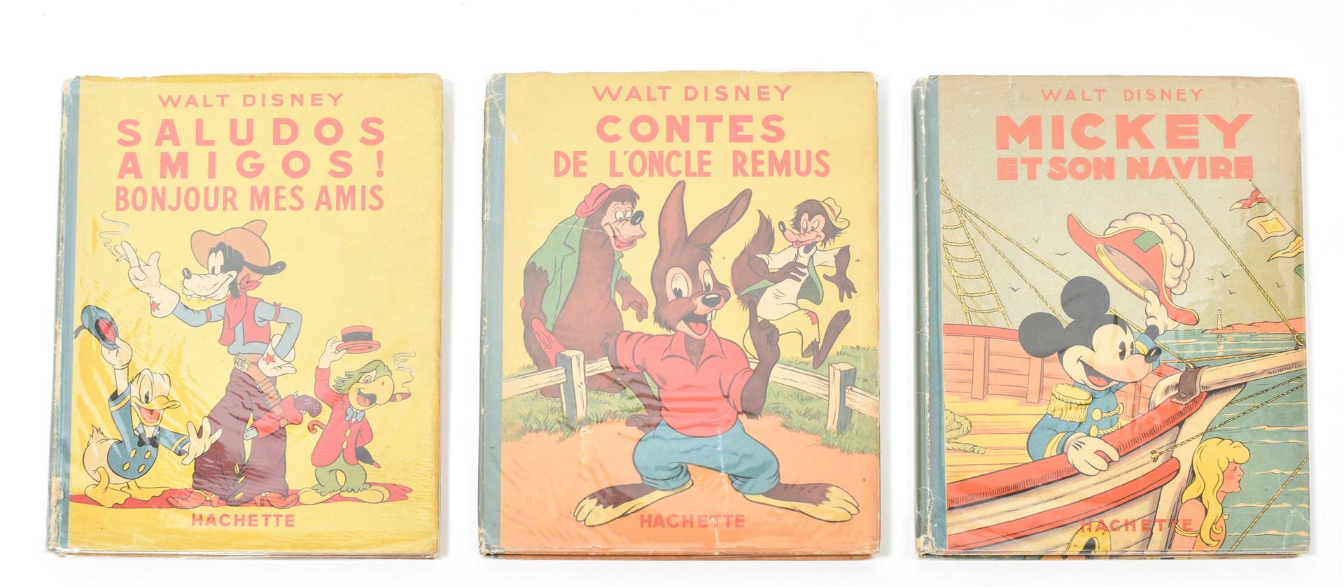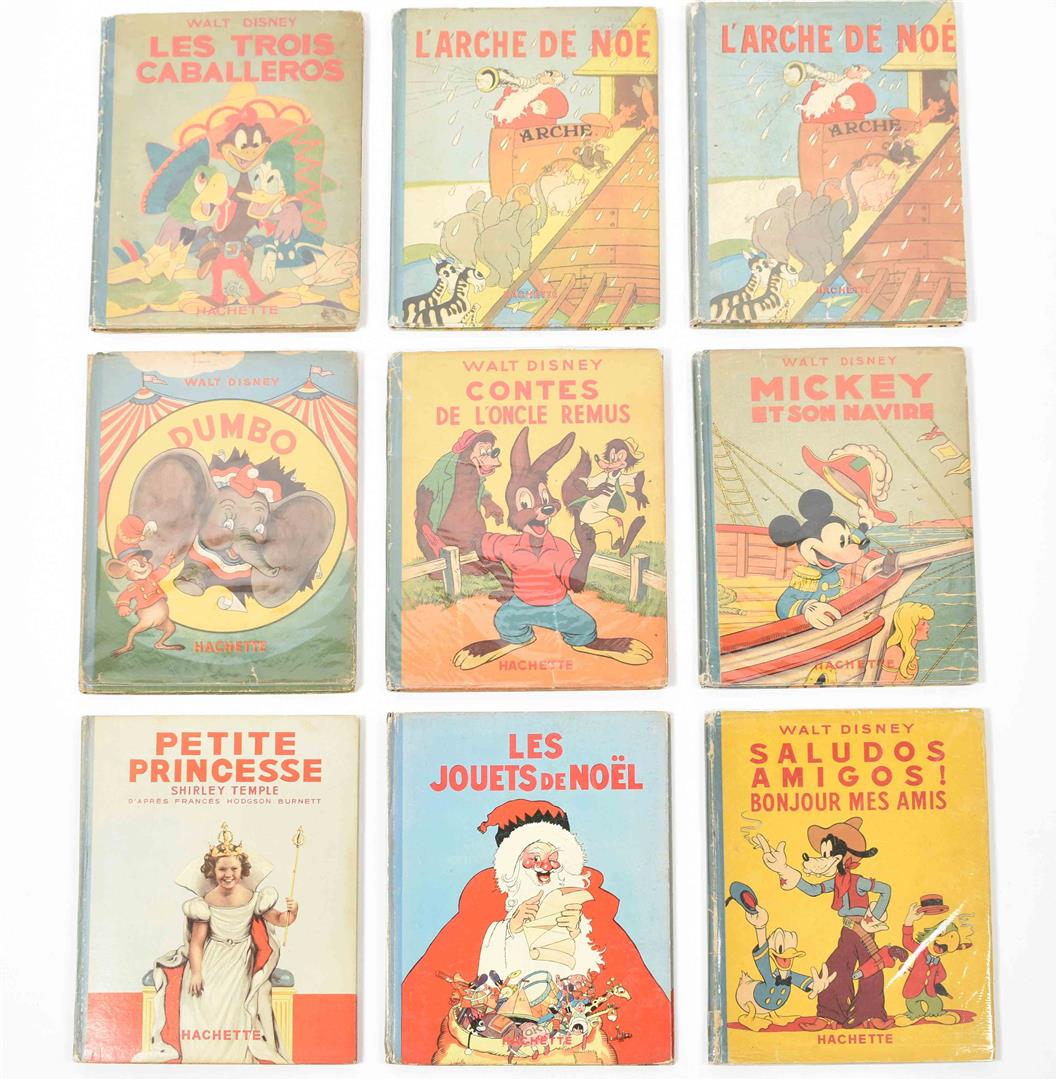 Comprises: (1) Saludos amigos. Bonjour mes amis! 1947 (Walt Disney copyright also 1947). (2) Mickey et son navire. 1948 (copyright 1945, dustwr. lacks portion of blurb). (3) Contes de l'oncle Remus. 1948 (copyright also 1948, dustwr. torn). (4) Dumbo. 1948 (copyright also 1948). (5) Les trois caballeros. 1948 (copyright also 1948). (6-7) L'arche de Noé. 2 variants: 1x undated and 1x dated 1950 and other differences (copyright 1934). -and 2 others, unif. publ. (total 9)