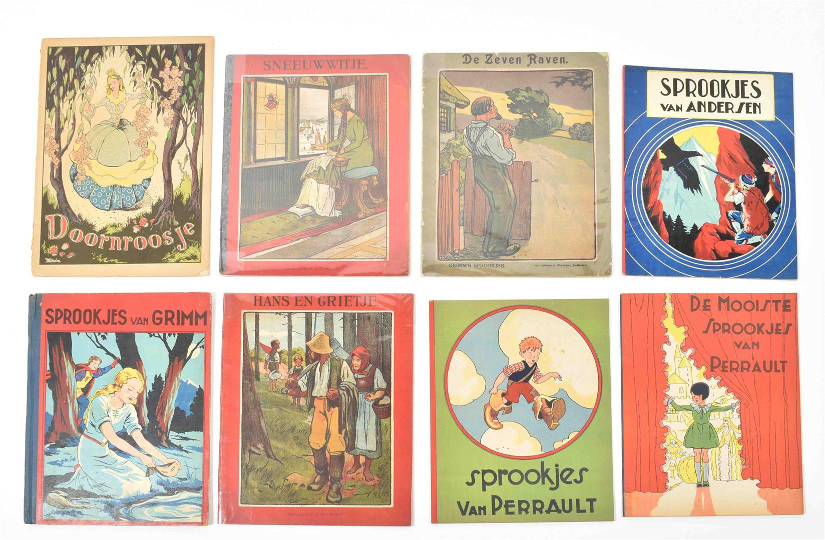 N.pl., n.publ., n.d. (ca. 1910), (12) p., 6 full-p. col. lithogr. ills., orig. stapled col. lithogr. wr., 4to. Fine copy. Rare, no copies in NCC. (2) Keur van Fabels. Nederlandse tekst van P.J. de Ridder. N.pl., n.publ., n.d. (ca. 1945), 32 p., 15 full-p. (col.) ills., orig. stapled pict. wr., 4to. Rare, no copies in NCC. (3) De sprookjes van moeder de gans. Verteld door Ant. L. de Rop. Zevende druk. Rijswijk, V.A. Kramers, (1957), 154 p., 40 ills. after G. Doré, orig pictorial cl. w. (sl. dam.) dust wr., folio. -and 14 similar others.