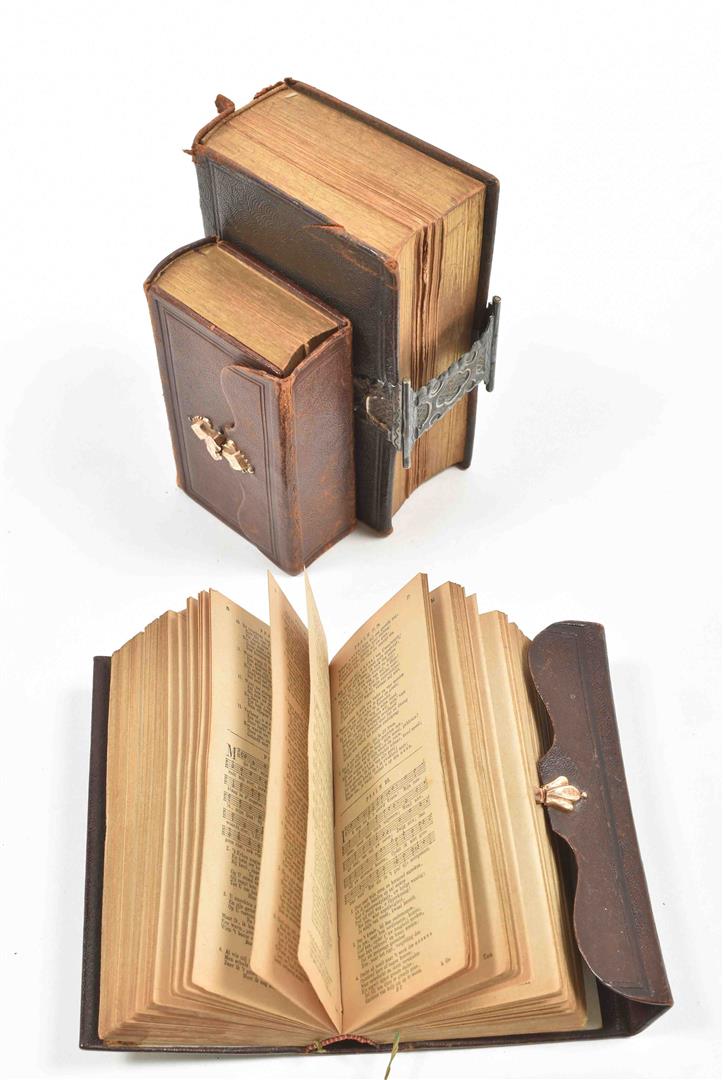 [Fine bindings] Three bibles: (1) Full overlapping brown morocco binding with gold clasp and catch