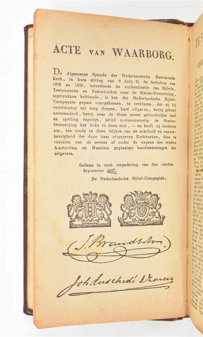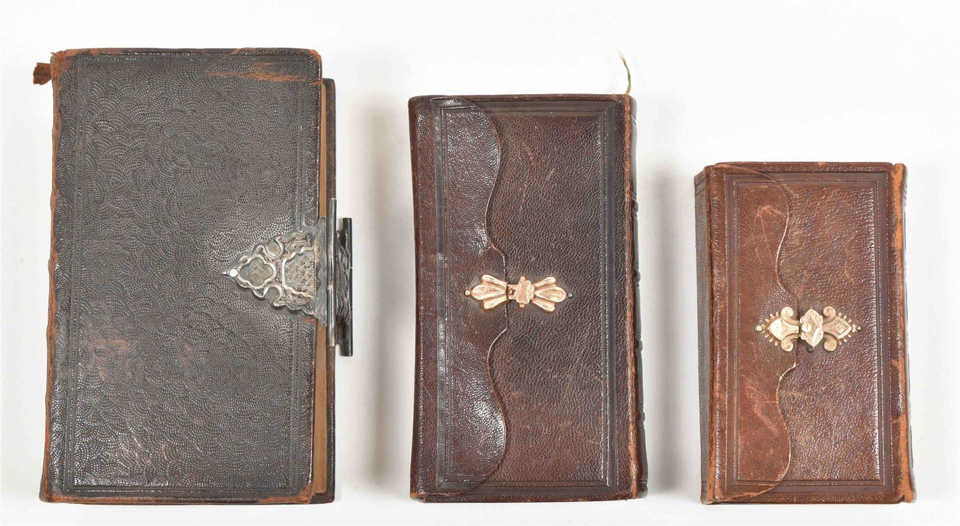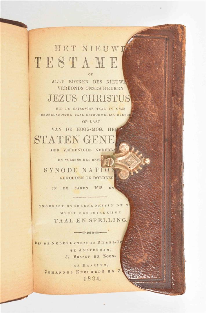 The catch and clasp made of 14 karat gold (hallmarked w. oak-leaf). On: Het Nieuwe Testament/ Het boek der psalmen, Amst., Ned. Bijbel-Compagnie/ J. Brandt en Zoon and Haarlem, J. Enschedé en Zonen, 1884, a.e.g., 12mo. -and 2 similar bindings, one w. unmarked gold clasp and catch, the other with 2nd degree silver clasp and catch.