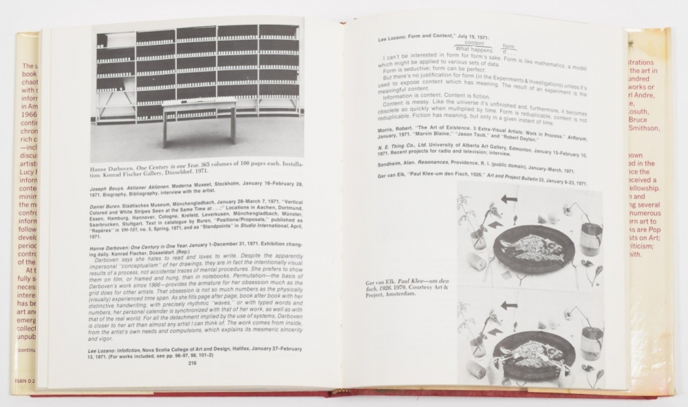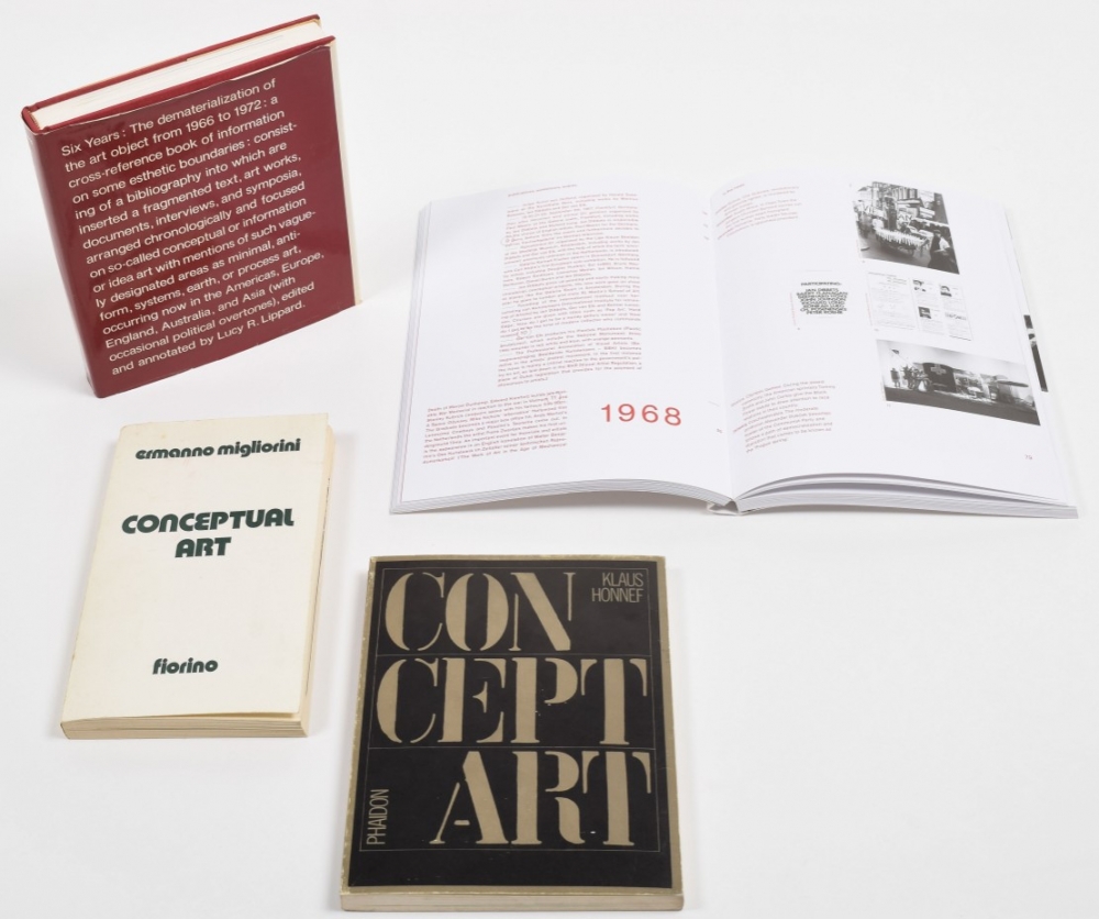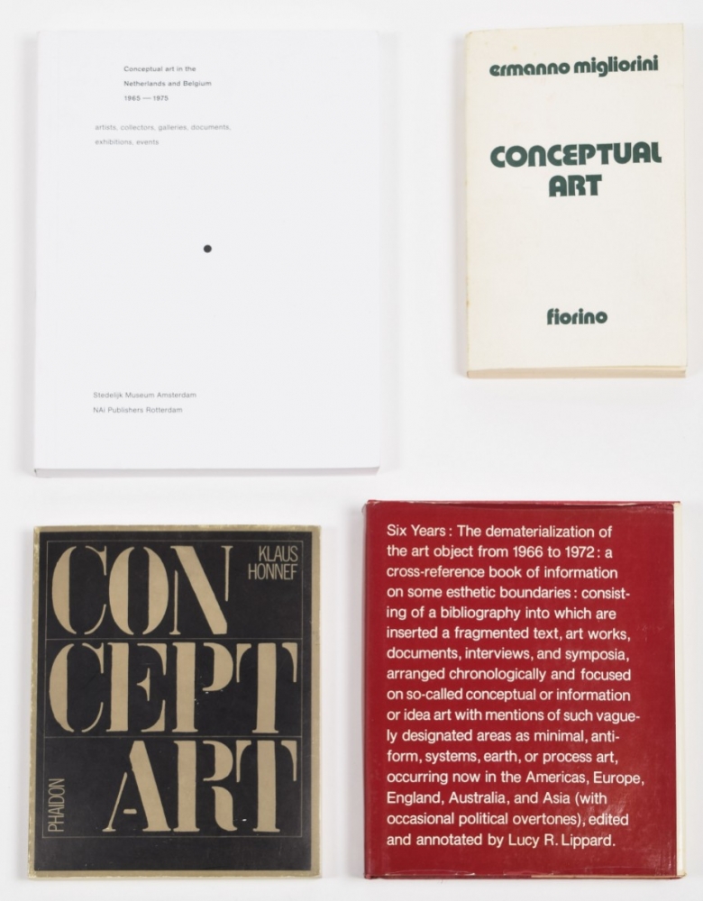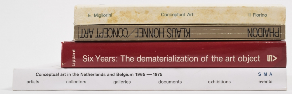 + Lucy R. Lippard, Six Years: The dematerialization of the art object. London, Studio Vista, 1973. Rare first UK edition. Hardcover with paper wrapper. Seminal book on Conceptual art, arranged as a continual bibliographical chronology. Cover soiled, inside reasonable. + Suzanna Heman, Conceptual Art in the Netherlands and Belgium 1965-1975: Artists, Collectors, Galleries, Documents, Exhibitions, Events. Amsterdam and Rotterdam, Stedelijk Museum Amsterdam and NAI Publishers, 2002. Text in English. Very good. (total 4)