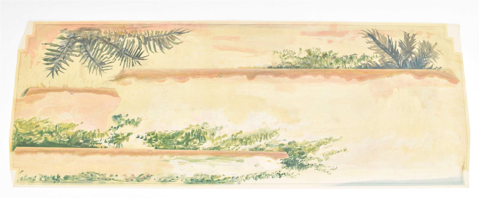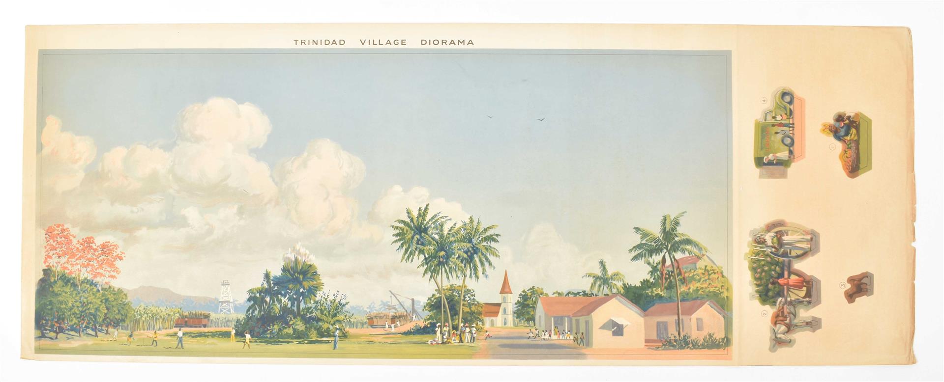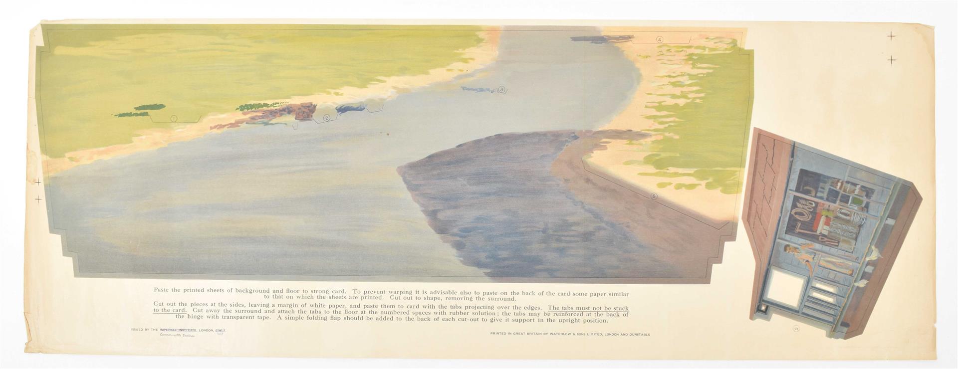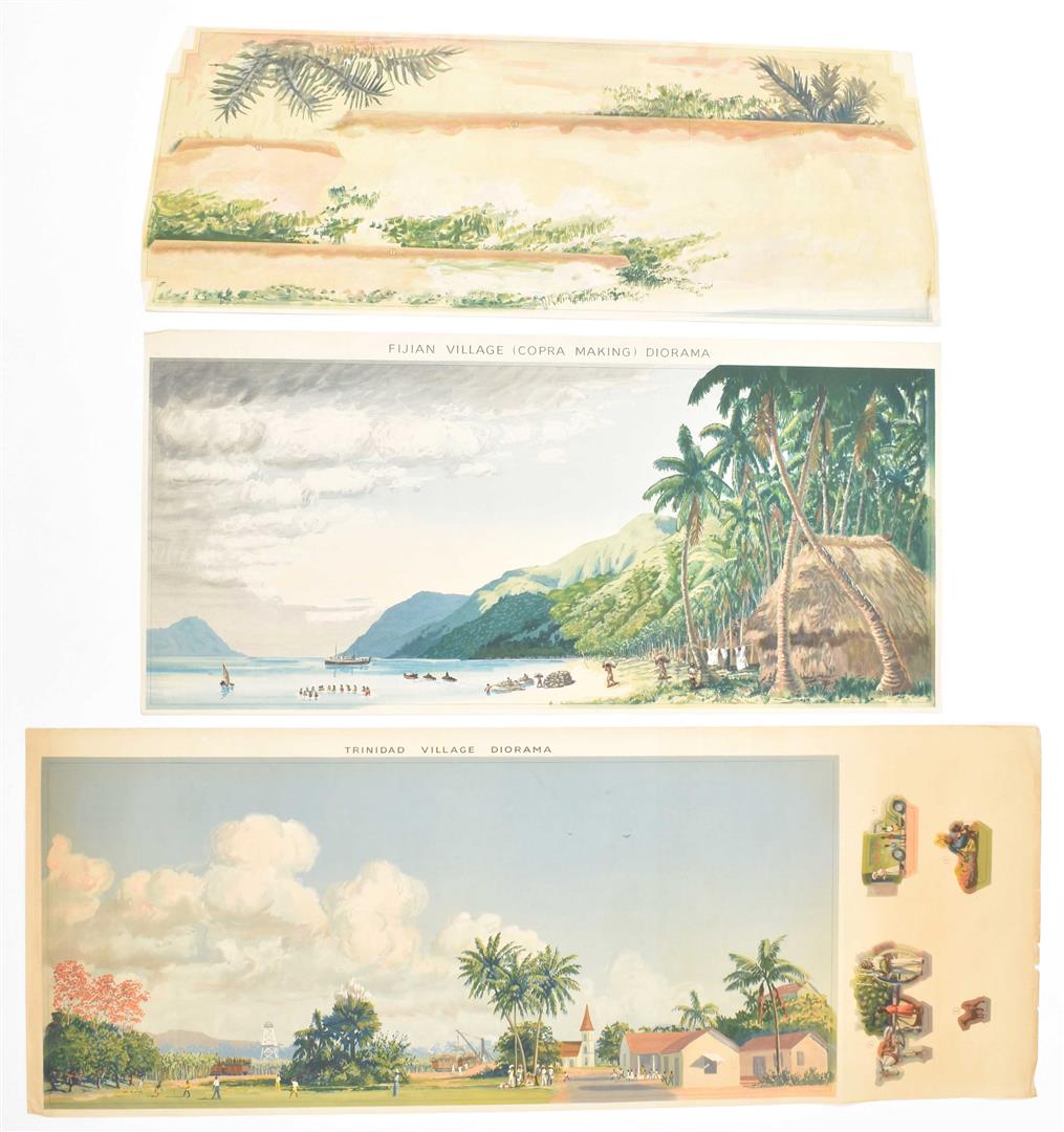London, Waterlow & Sons, ca. 1930. Issued by the Commonwealth Institute, London. 2 unused/ uncut sheets of a village scene w. 5 pieces/ figures that can be cut out and glued on the background. Both sheets approx. 40 x 104.5 cm. -and 2 similar others, sl. smaller, one titled "Fijian village (copra making) diorama".