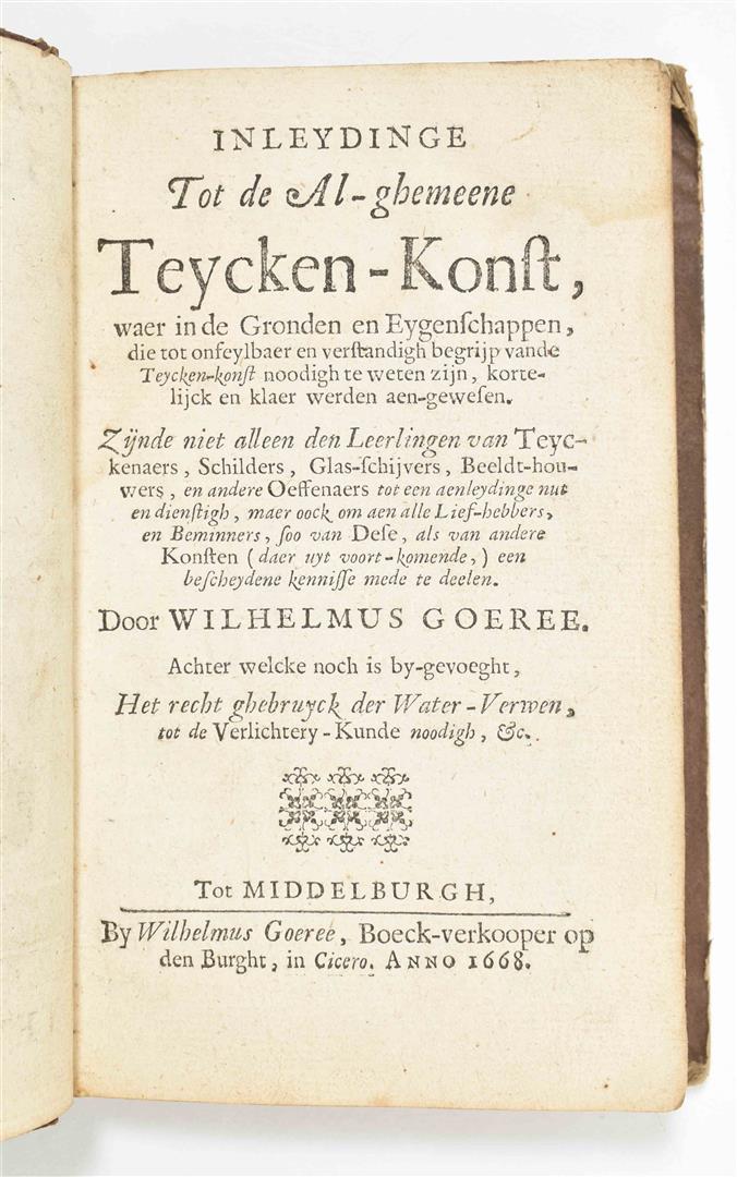 waer in de Gronden en Eygenschappen, die tot onfeylbaer en verstandigh begrijp vande Teyken-konst noodigh te weten zijn, kortelijck en klaer werden aen-gewesen. Middelburg, W. Goeree, 1668. 1st ed. (22),76 p. Engr. frontisp., 1 full-p. plate, 2 text ills., a few historiated initials. Later (worn) hcl. 8vo. Bound with: Brugge, G. ter. Verlichtery-konst, in de welcke den rechten Grondt, ende volkomen gebruyck der Water-verwen, tot de Schilder-konst, ende de Illuminatie ofte Verlichtery noodigh zijnde, met alle hare Eygenschappen klaerlijck werden geleert. Ibid., idem, 1668. (8),60 p.