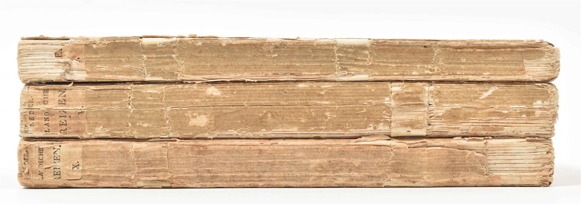 na de meest afgelegene gewesten des aardkloots (...). Amst./ Harlingen, P. Conradi/ V. van der Plaats, 1784-1786. Vols. 4, 5 and 10. Incl. fold. engr. plates. Speckled/ marbled paper wr. (worn). 8vo.